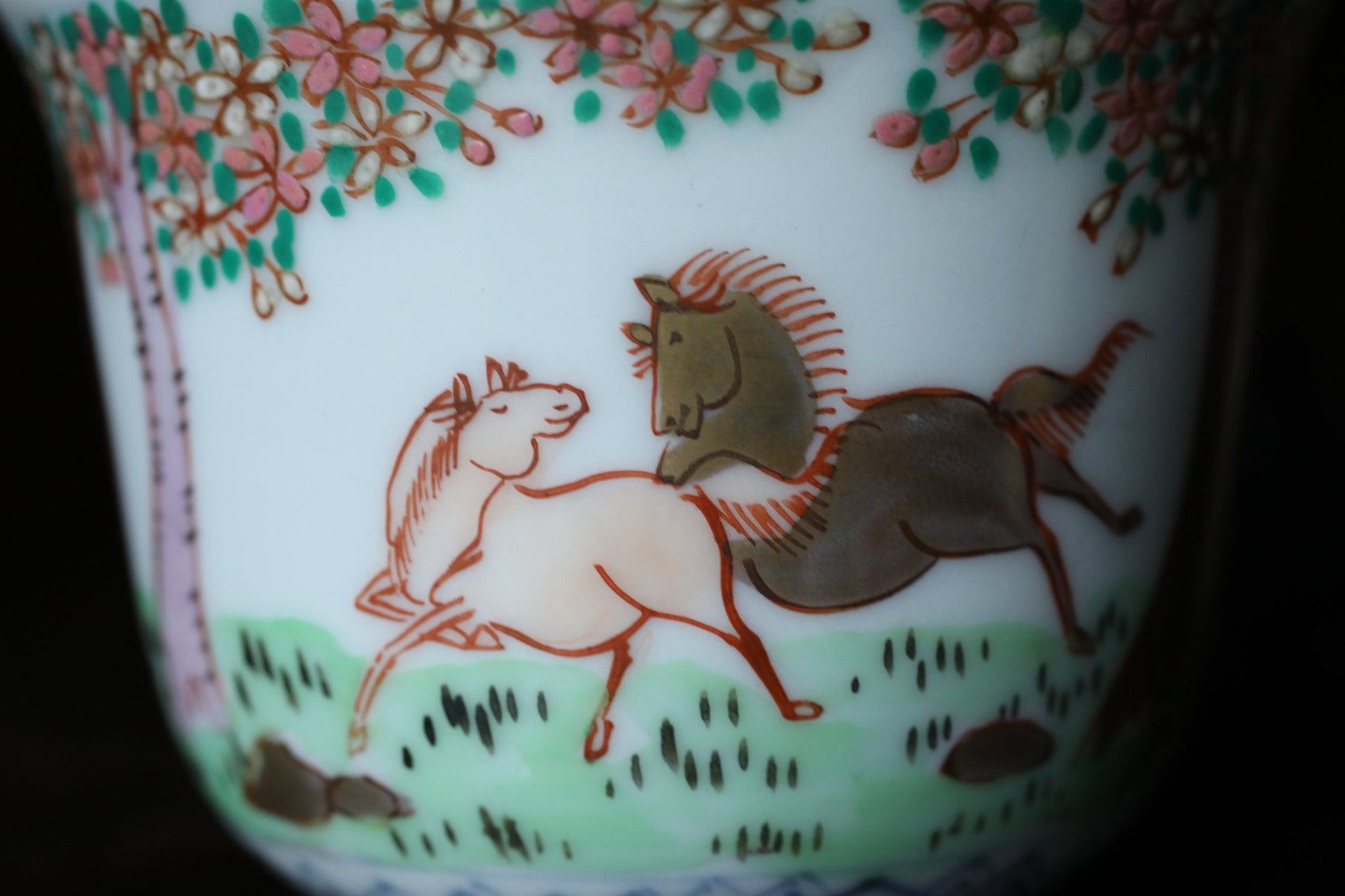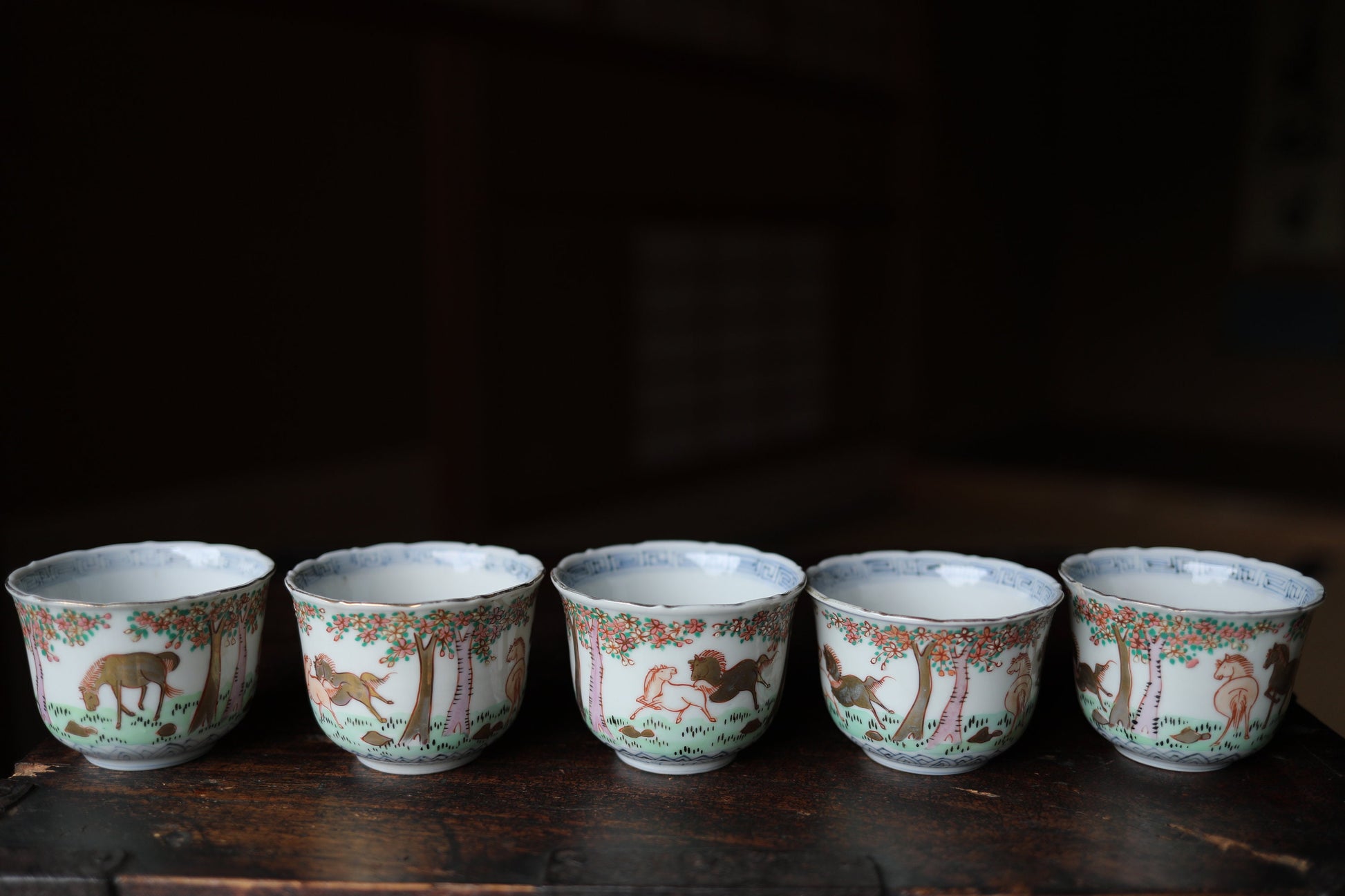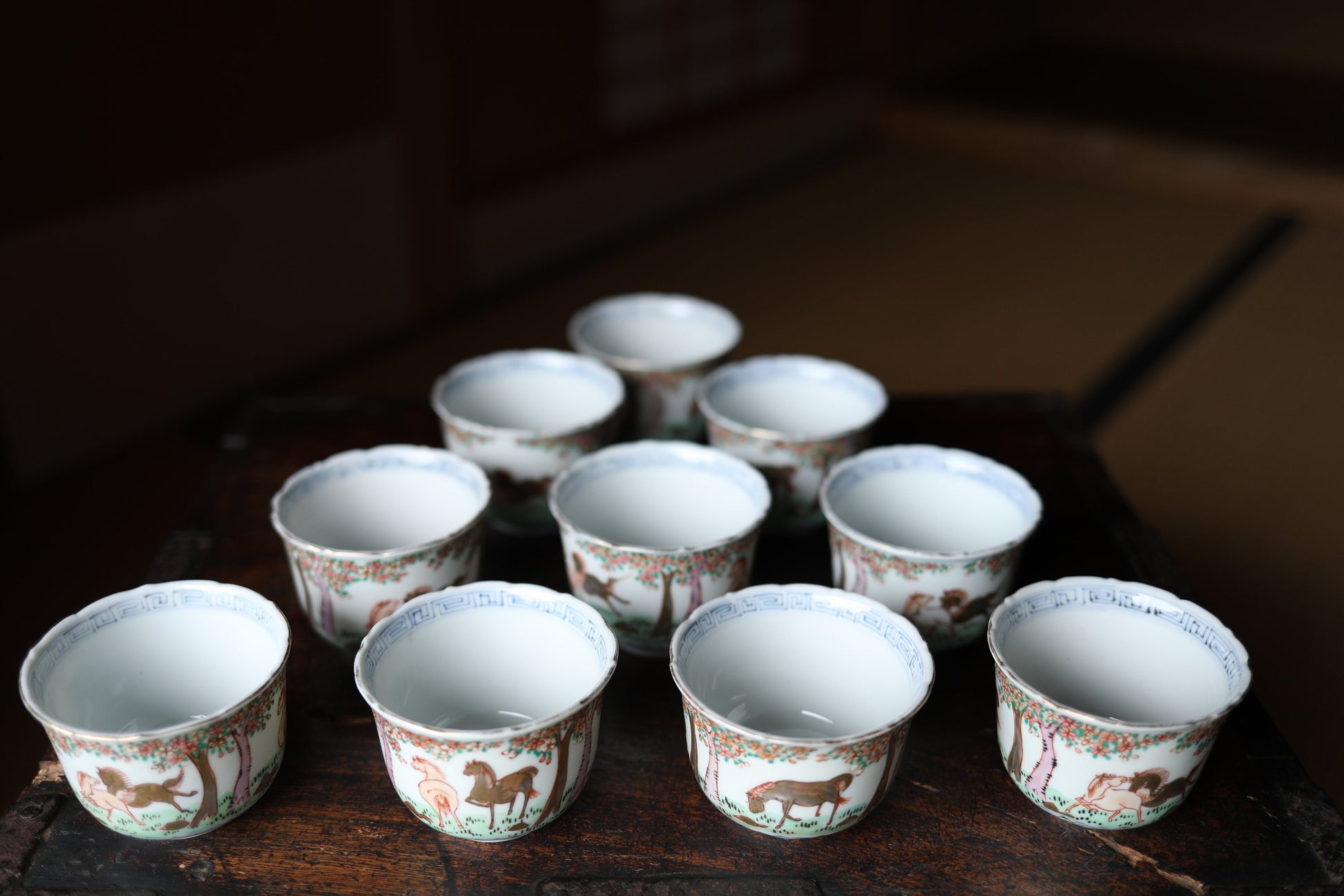 The items came from the storehouse of an aristocratic family, and there are 10 more identical cups. They were made to order and have a very lovely depiction of a couple of horses playing. The rim is made in the shape of a flower, and the inside also has a fine hand-drawn pattern in pale indigo color. The animal design is rare and highly recommended.