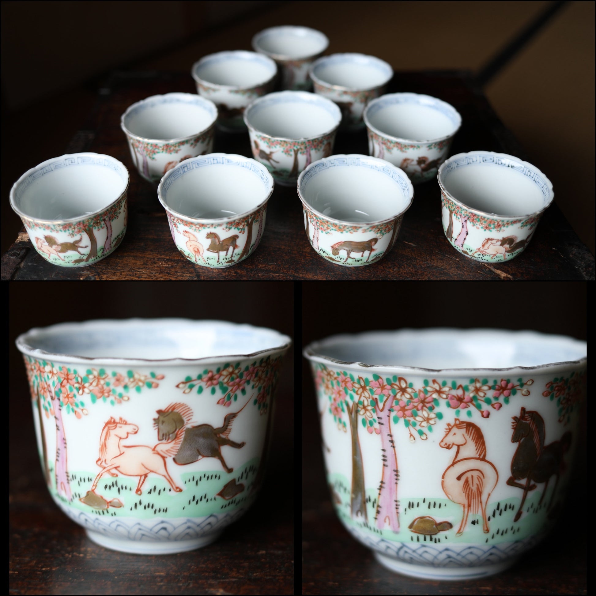 FINE! Japanese antique porcelain 蕎麦猪口SOBACHOKO Beautiful hand painting 10 cups KUTANI horses and floral pattern with kanji signature H2.6in 1890sEdo~Meiji era.