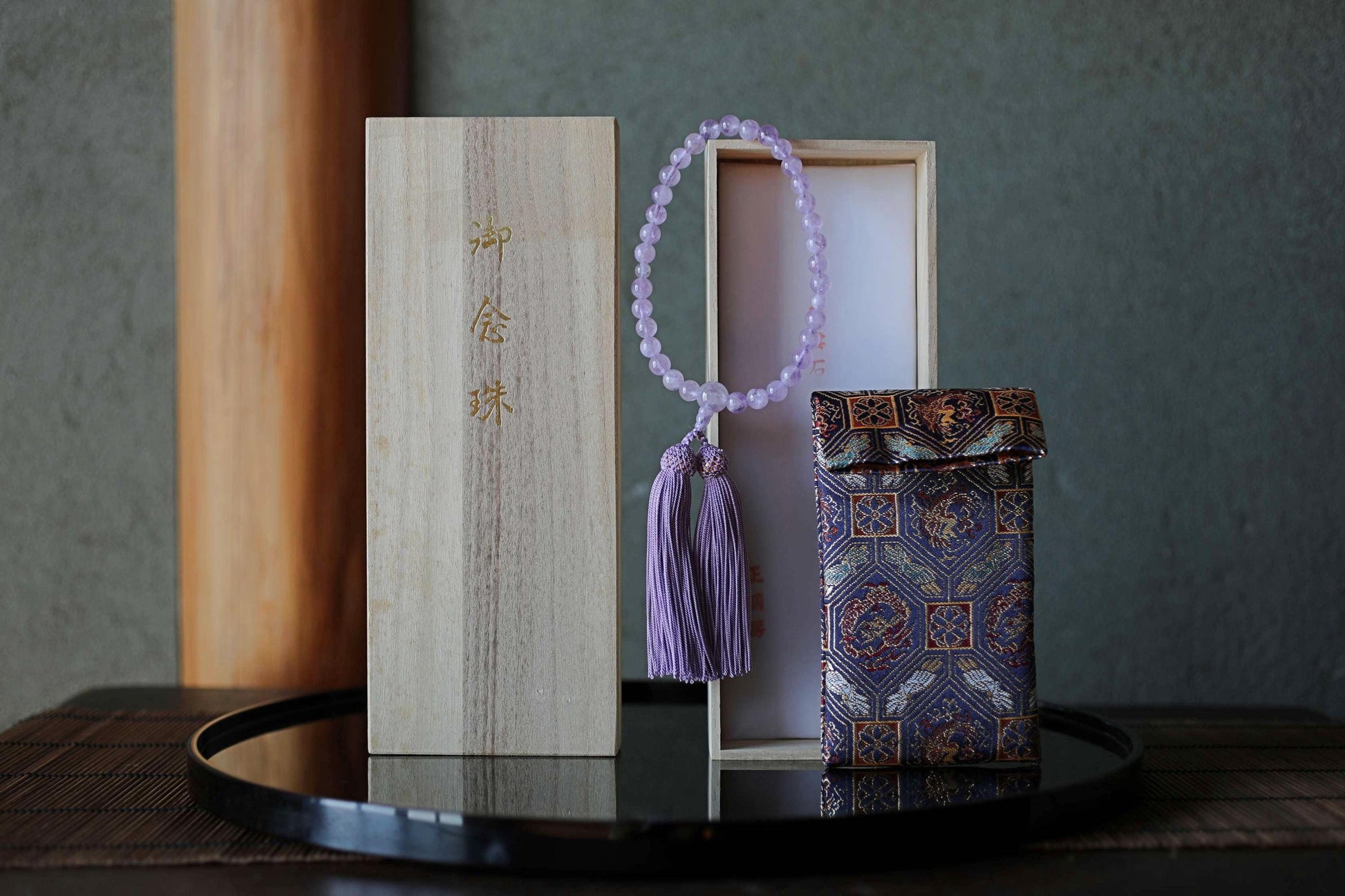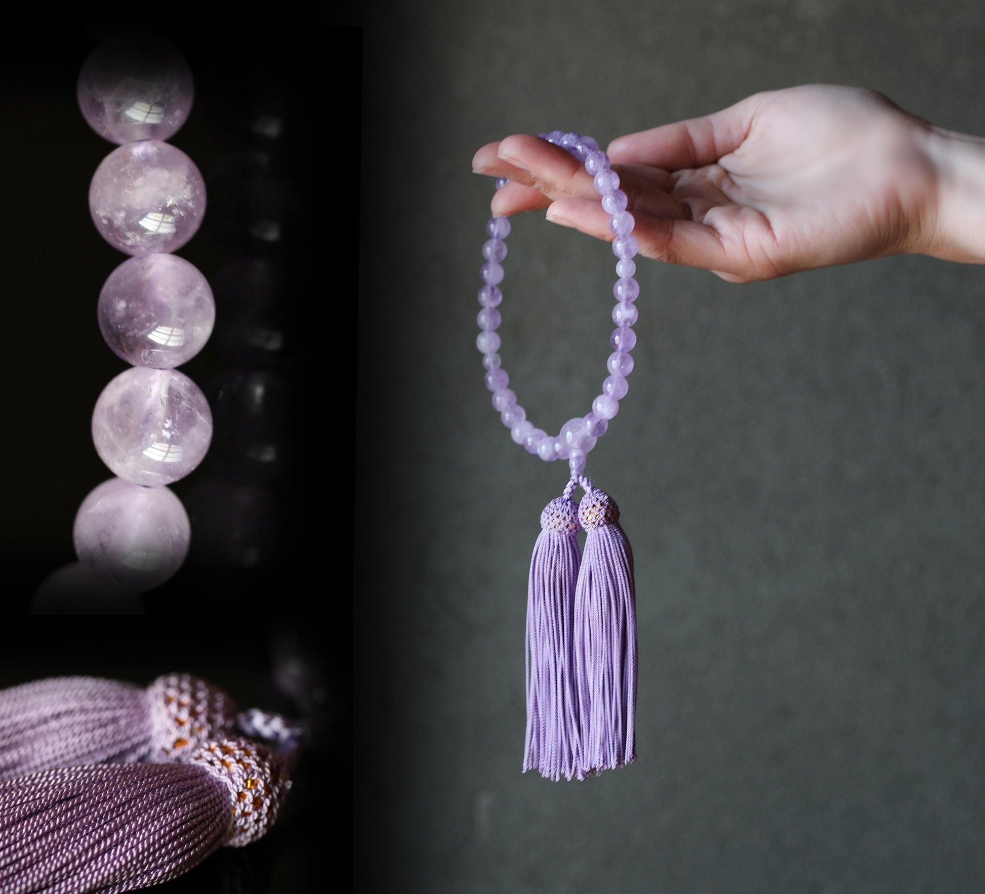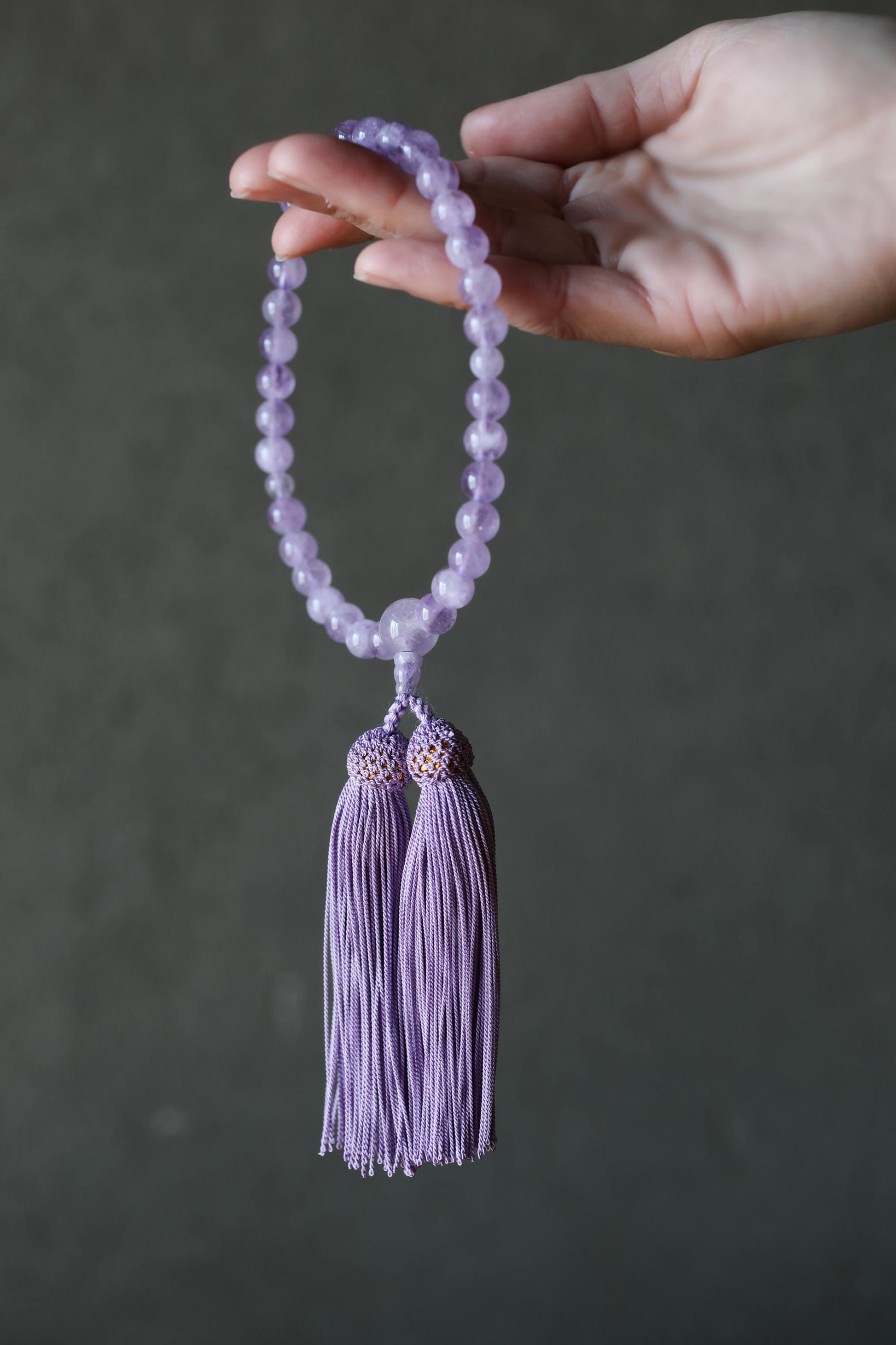 FINE! Japanese buddhist Prayer Rosary made of Amethyst beads and silk, JUZU Power stone Meditation Zen with Silk Pouch wooden box for GIT