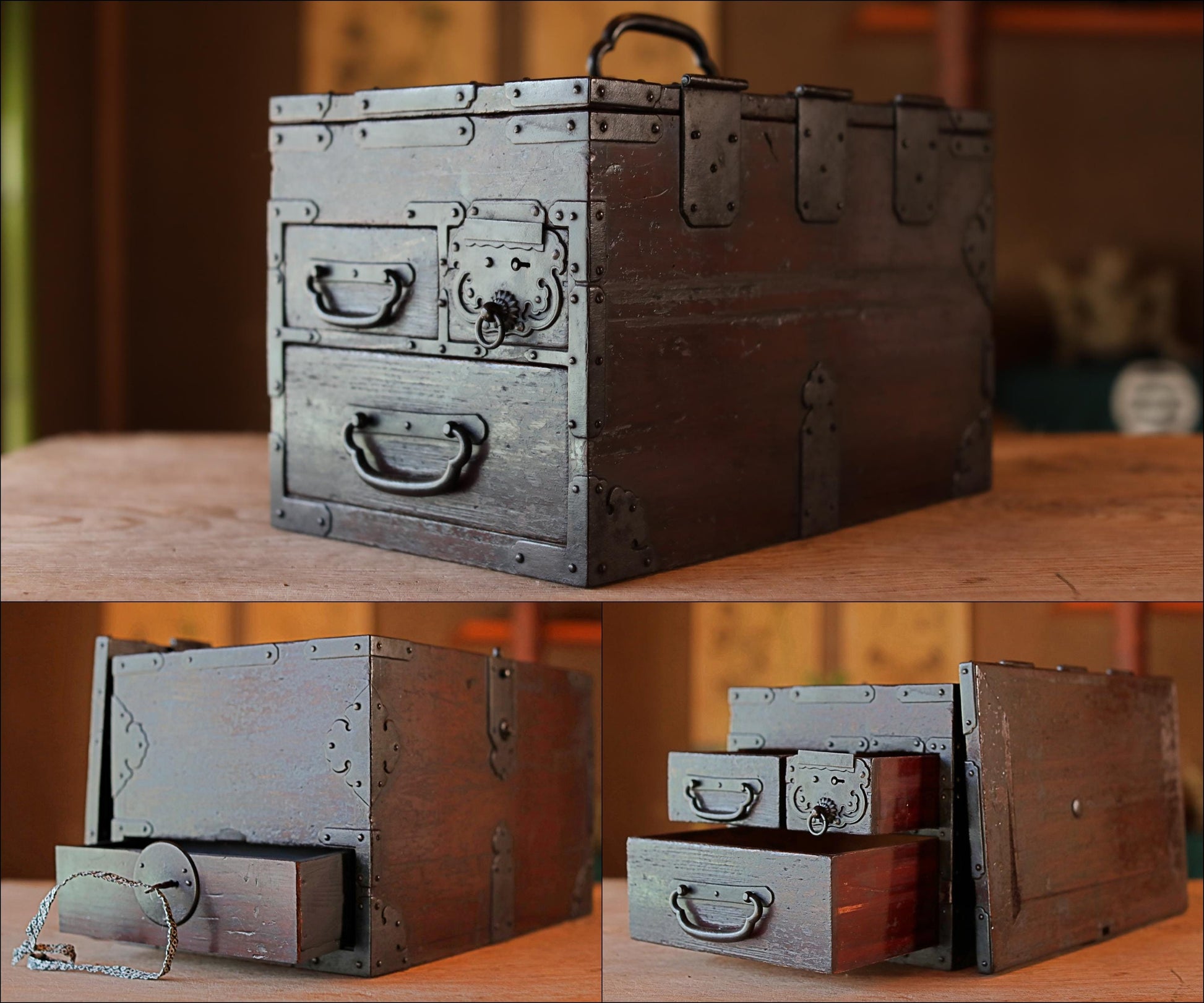 FINE! Japanese furniture Antique Box Chest of Drawers Tansu with key INKSTONE case Suzuribako SAMURAI Crest metal 1870s W14.4in/W36.5cm
