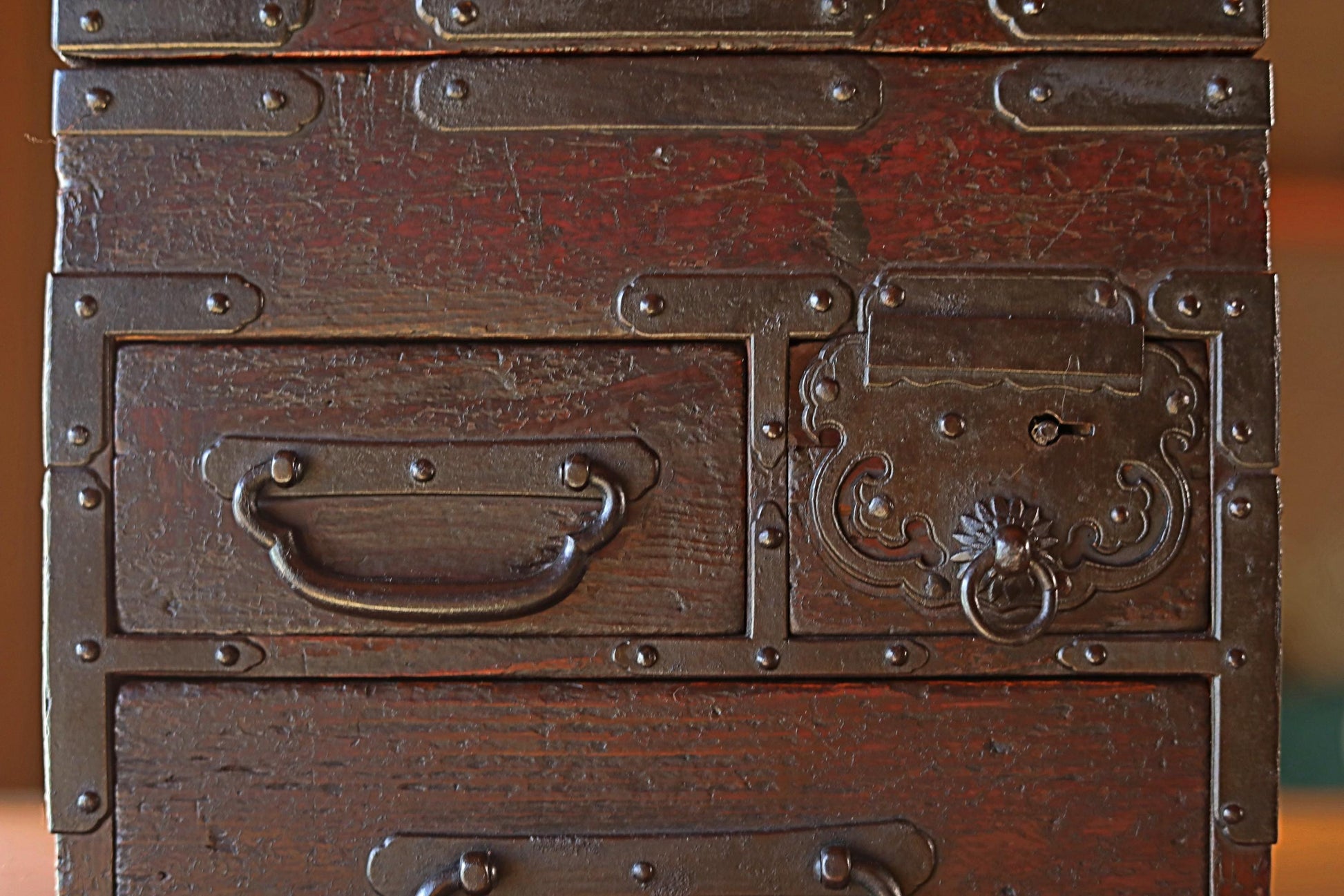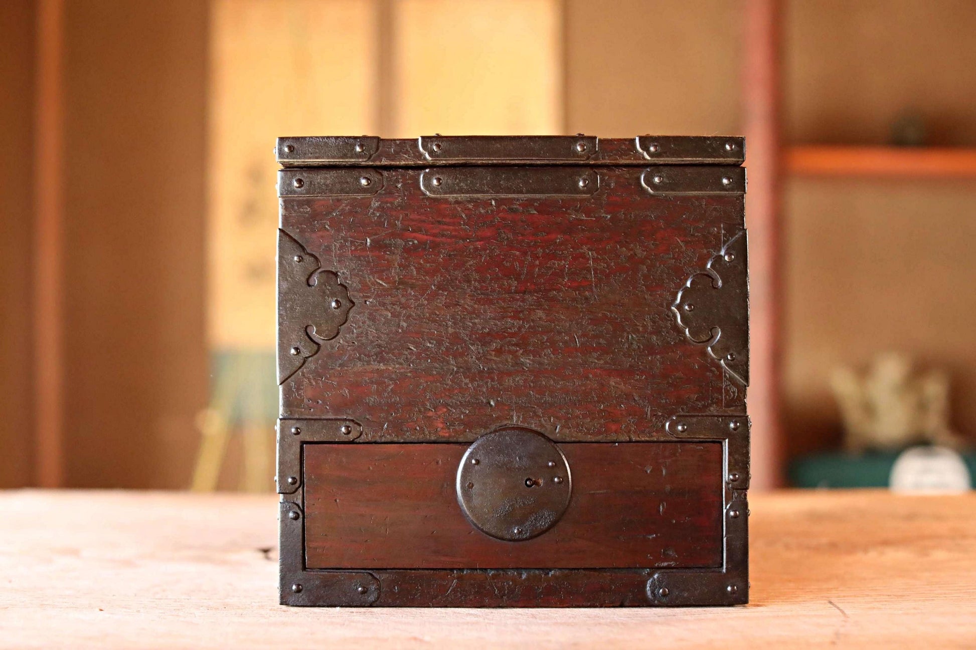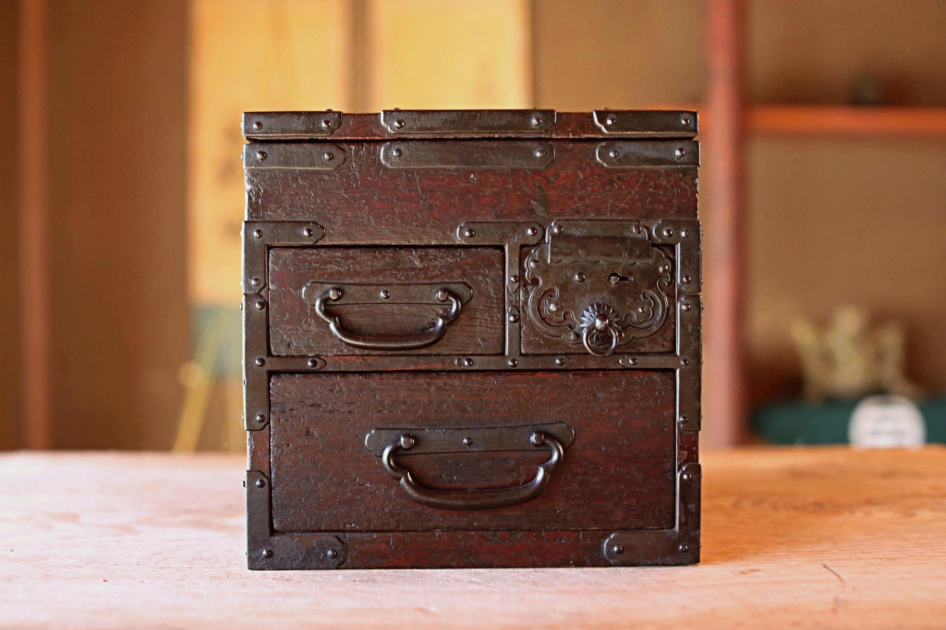 FINE! Japanese furniture Antique Box Chest of Drawers Tansu with key INKSTONE case Suzuribako SAMURAI Crest metal 1870s W14.4in/W36.5cm.