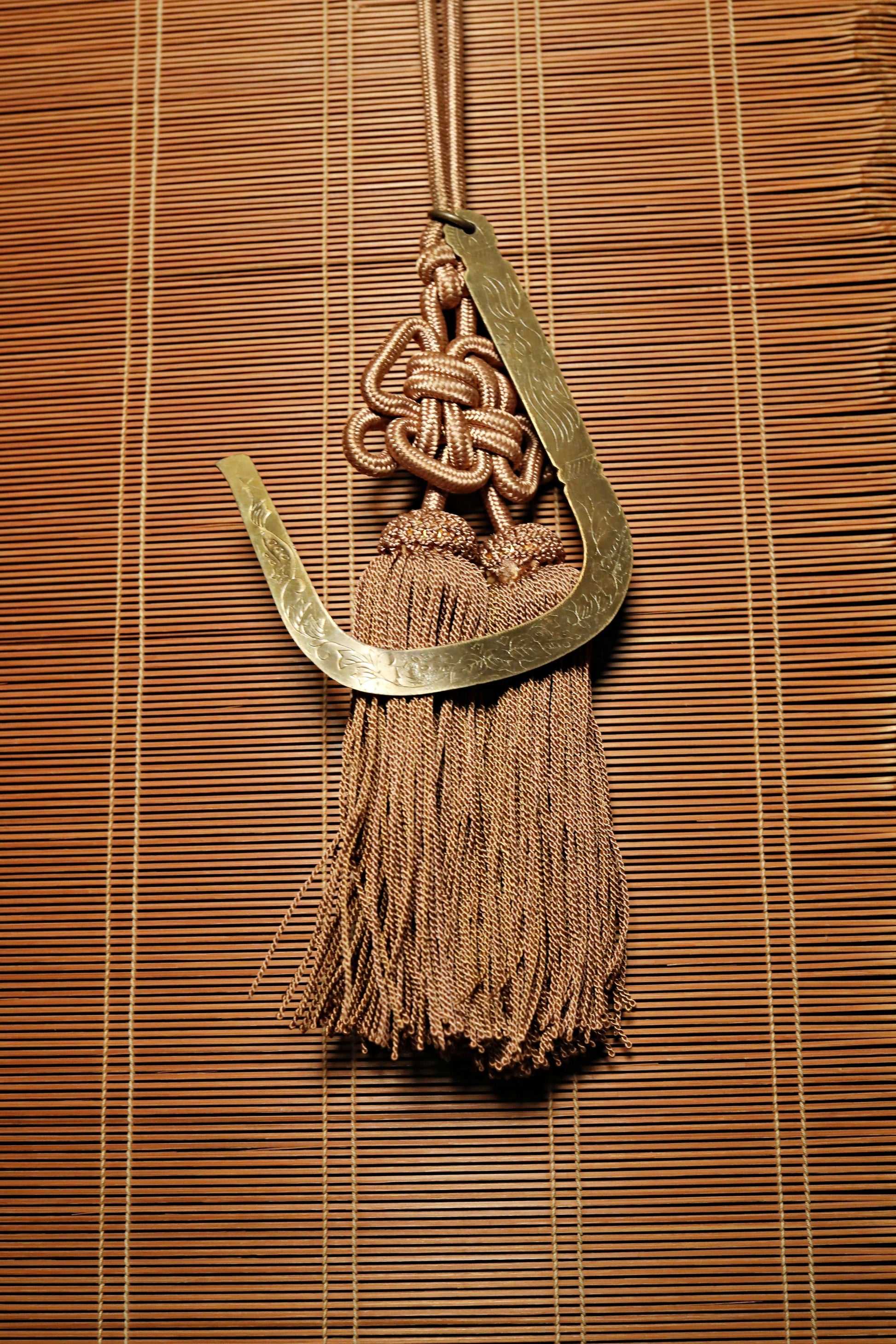 "暖簾Noren” or ”御簾misu.” This item is sold as a single piece. The rim is calm brown with a repeating design featuring circular crest-like symbols in beige, fully made of silk. The tassel is shiny brown with an antique gold hook.