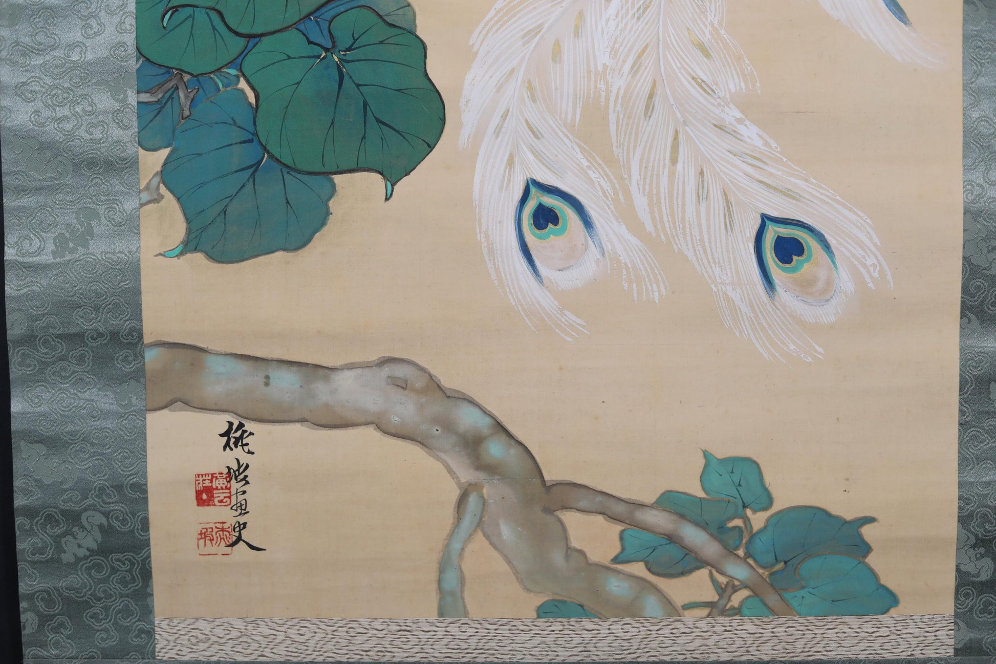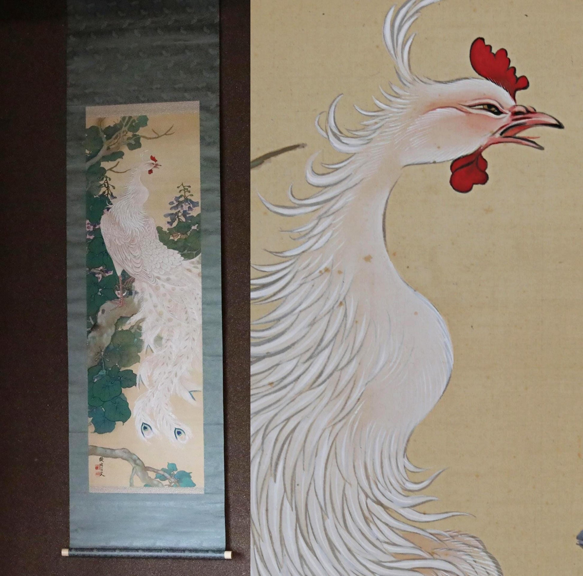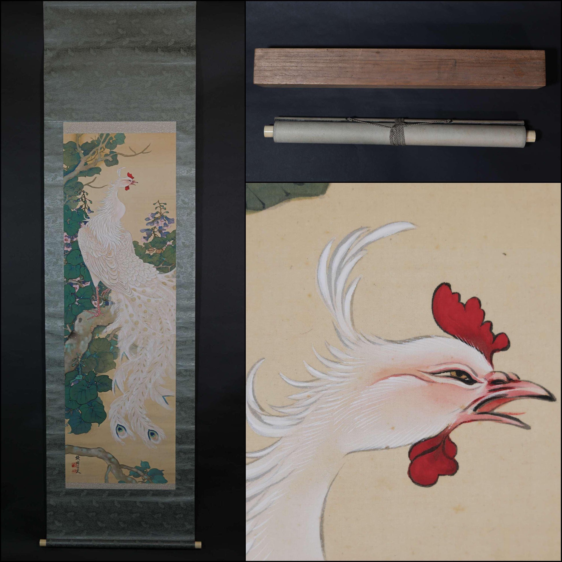 FINE! Japanese hanging scroll water color painting of beautiful phoenix on Paulownia flower with signature 池田 in 1920s Kakejiku H79in/201cm