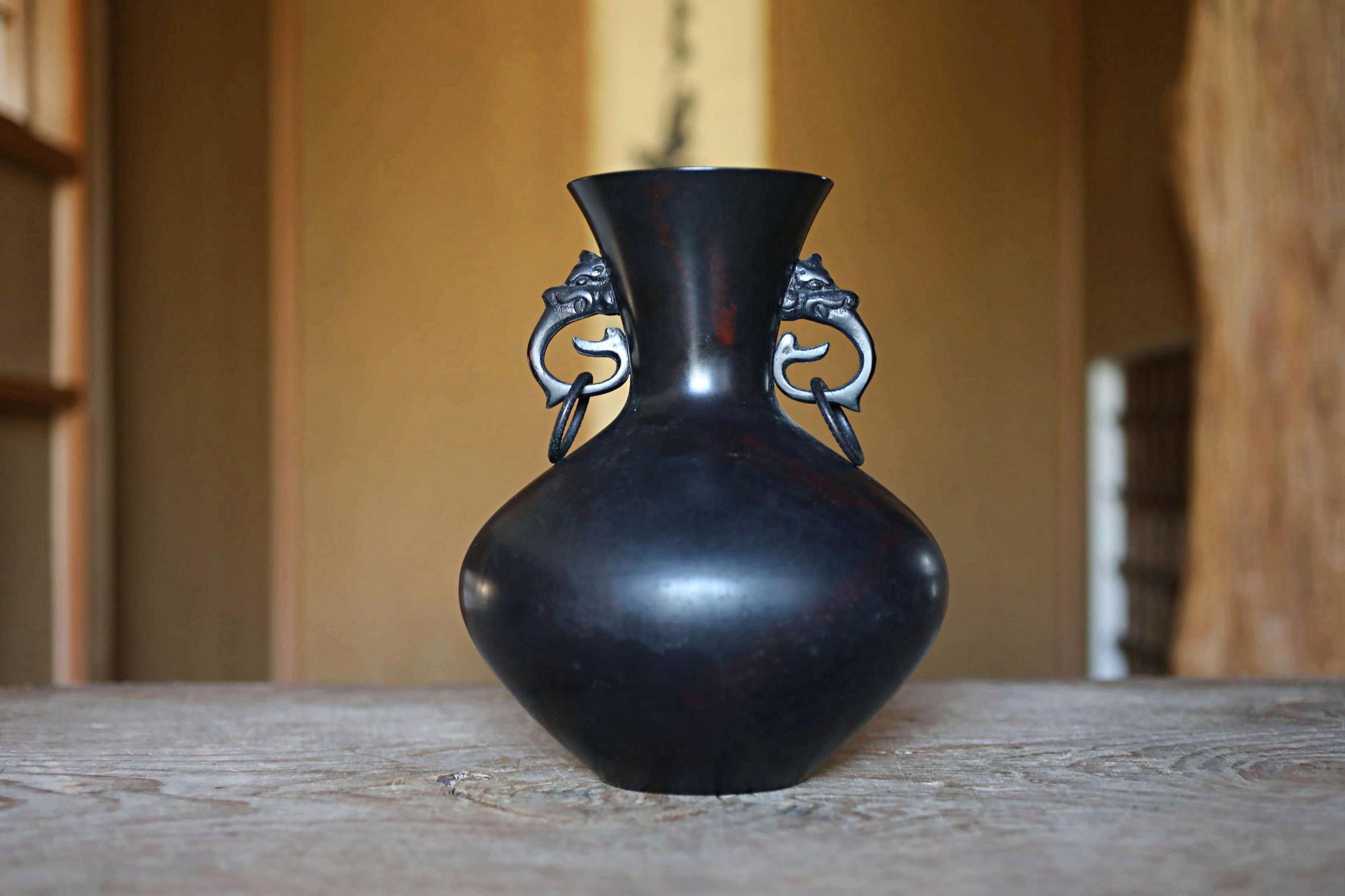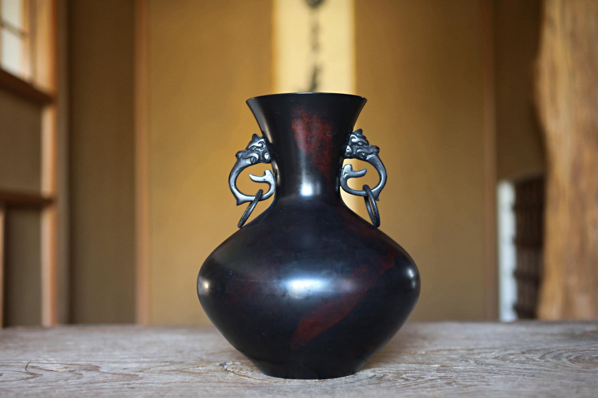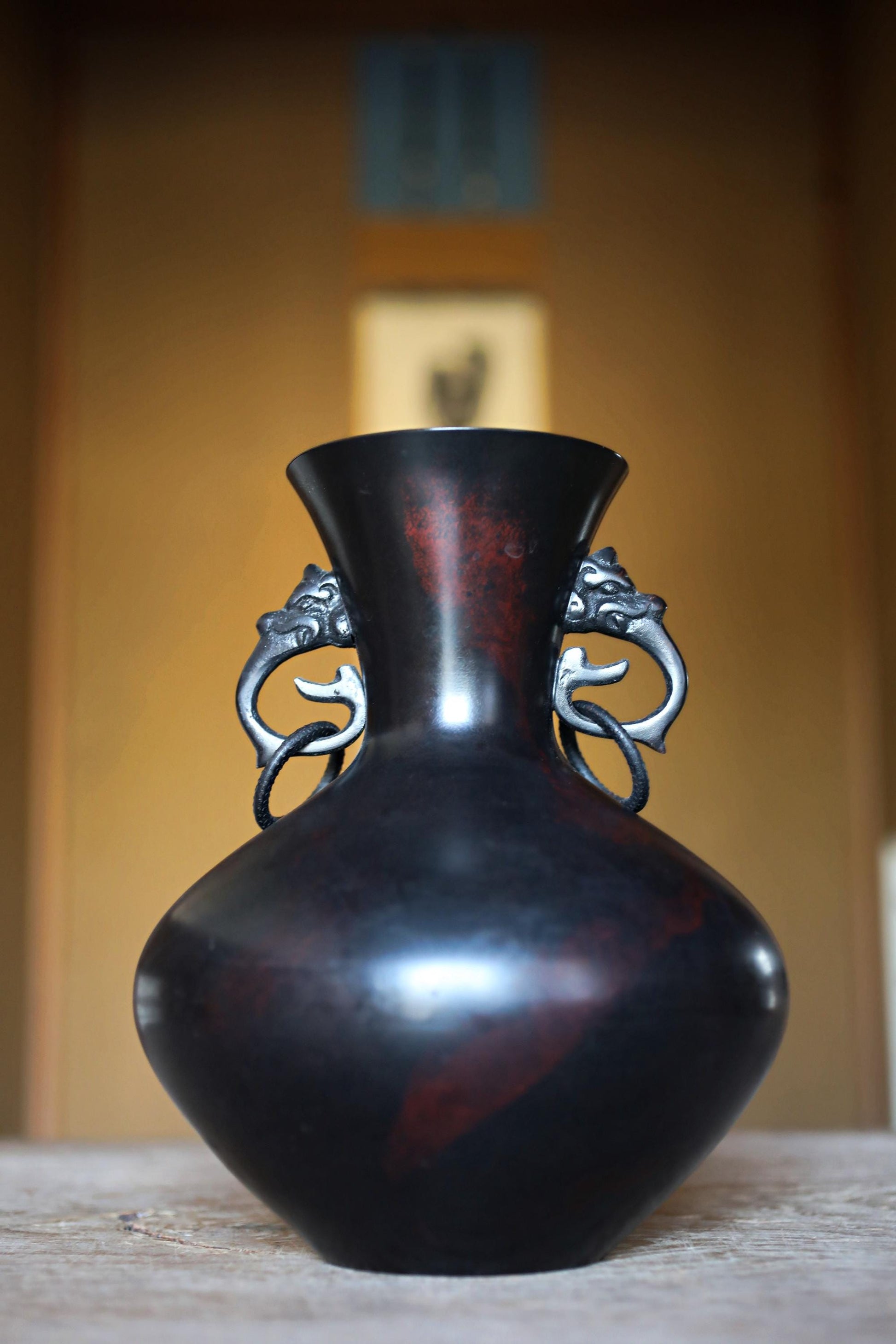 FINE! Japanese vintage 1960s Bronze flower vase black, Slightly red marble with beautiful dragons ears with 龍山 sign furniture H9.4in/H24cm