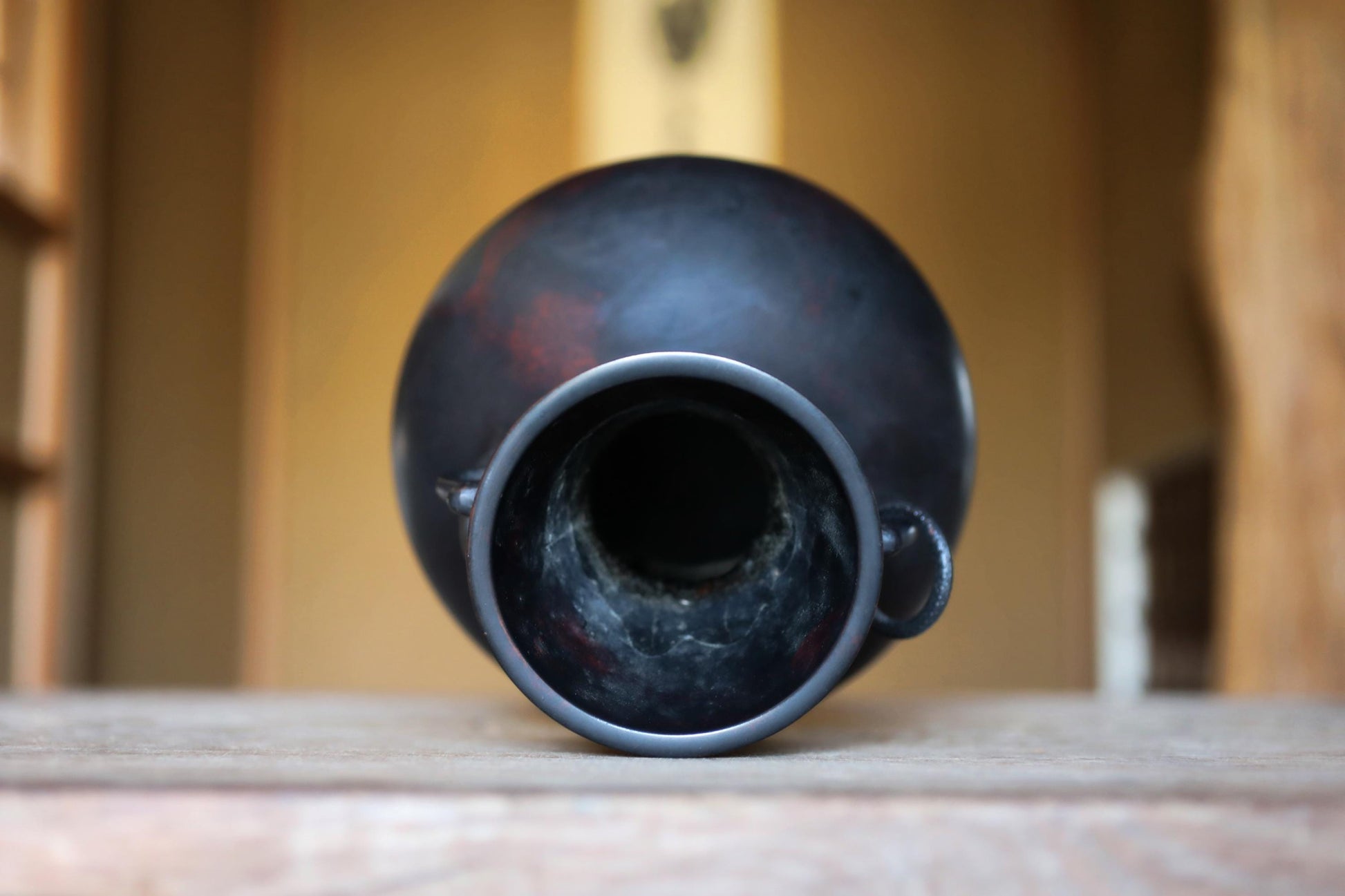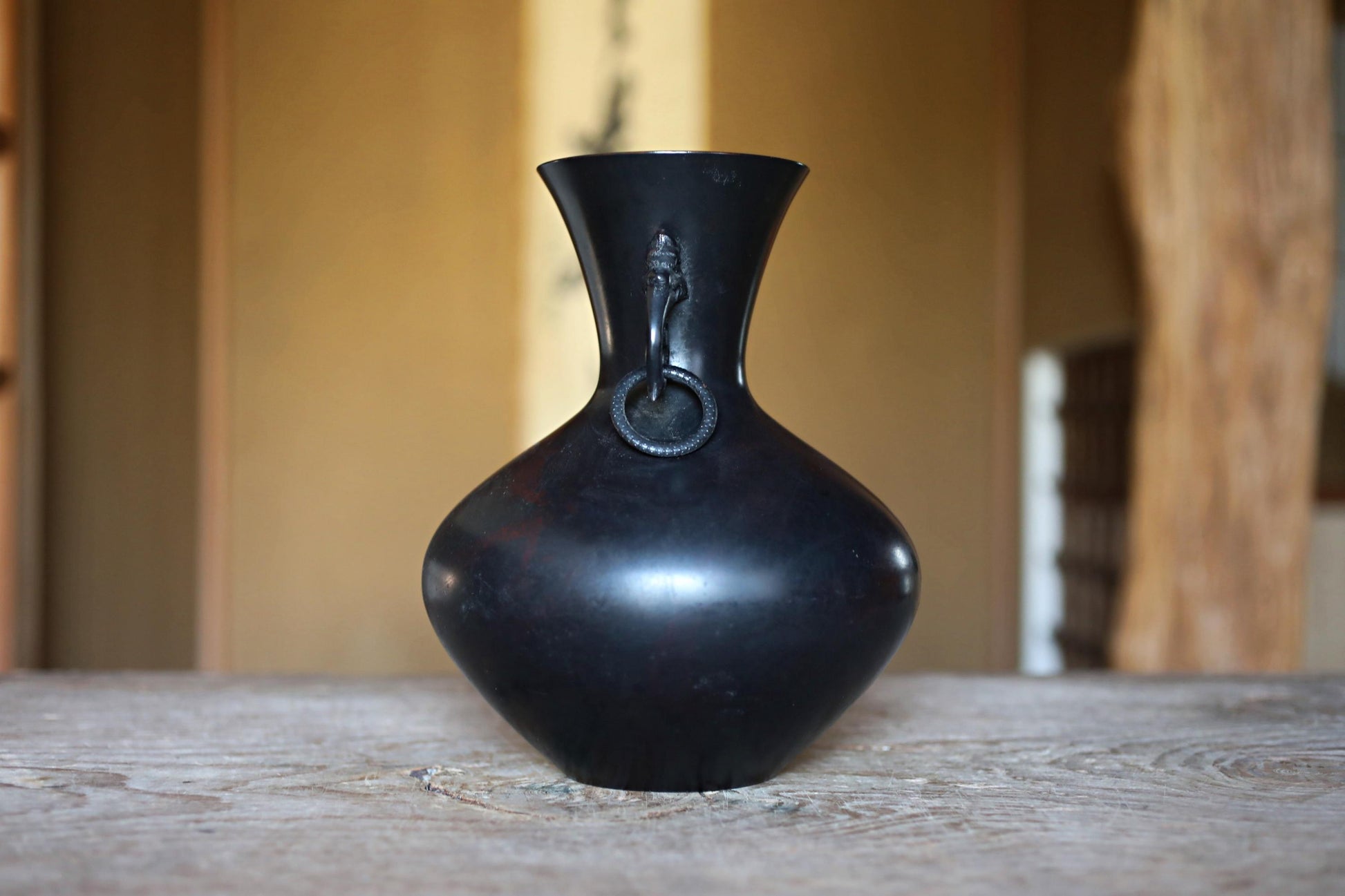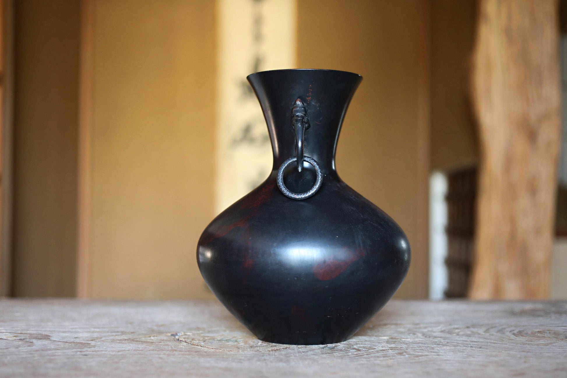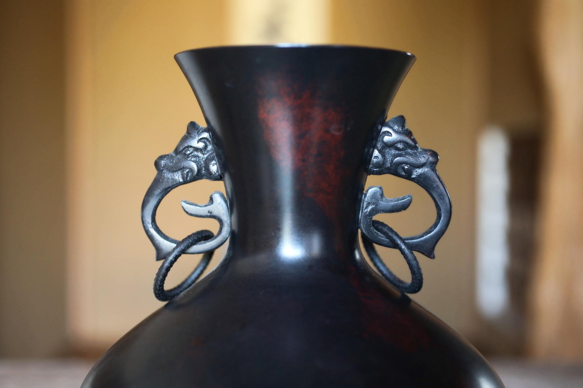 FINE! Japanese vintage 1960s Bronze flower vase black, Slightly red marble with beautiful dragons ears with 龍山 sign furniture H9.4in/H24cm