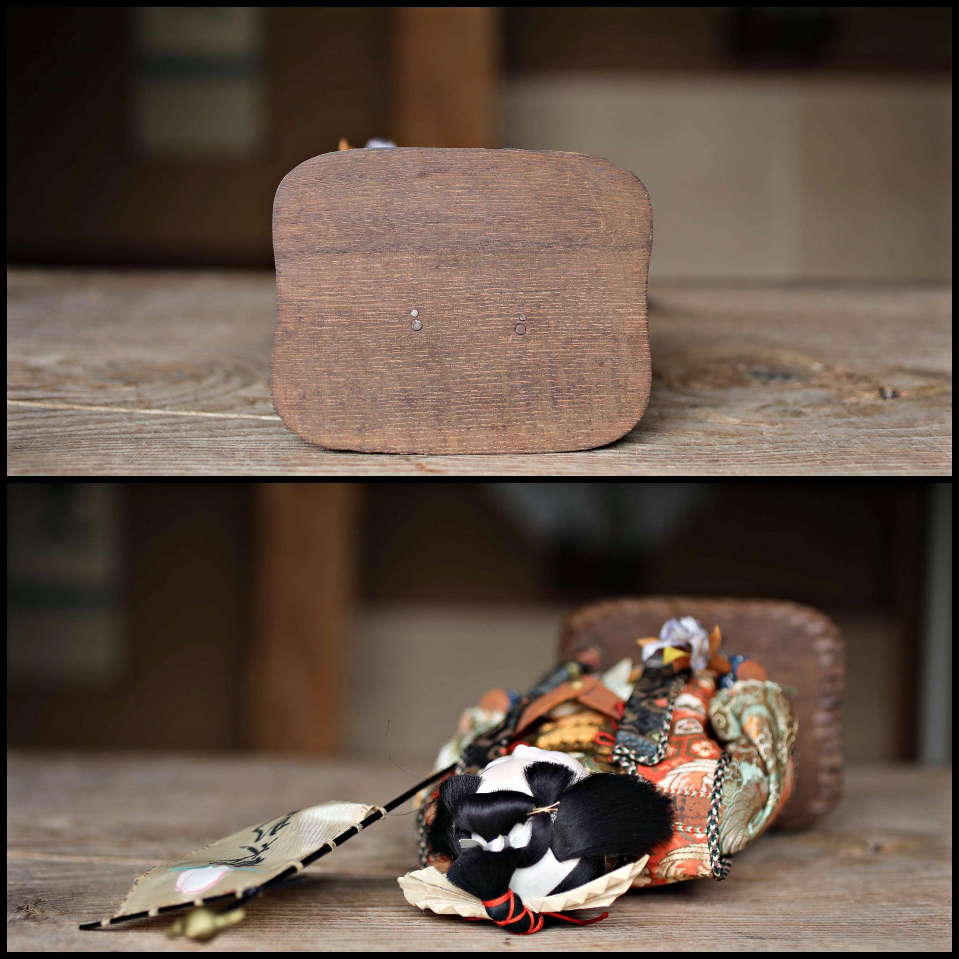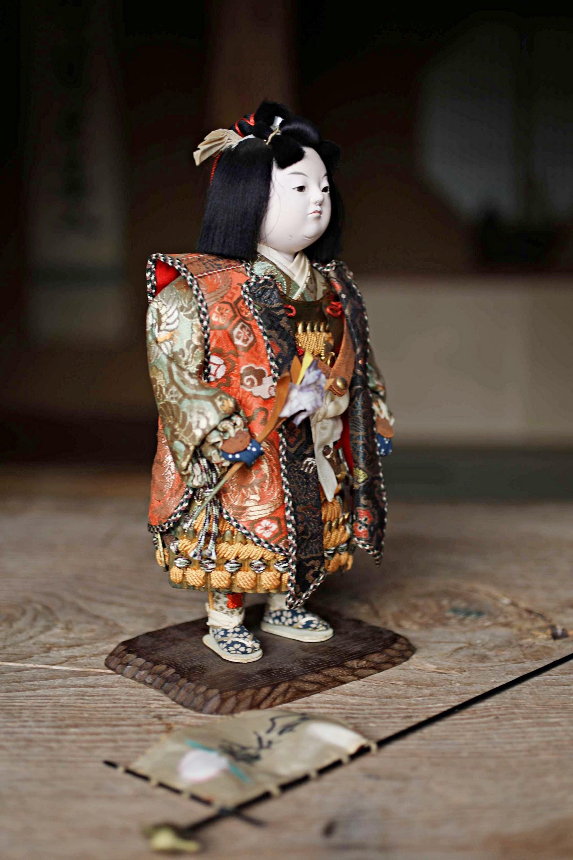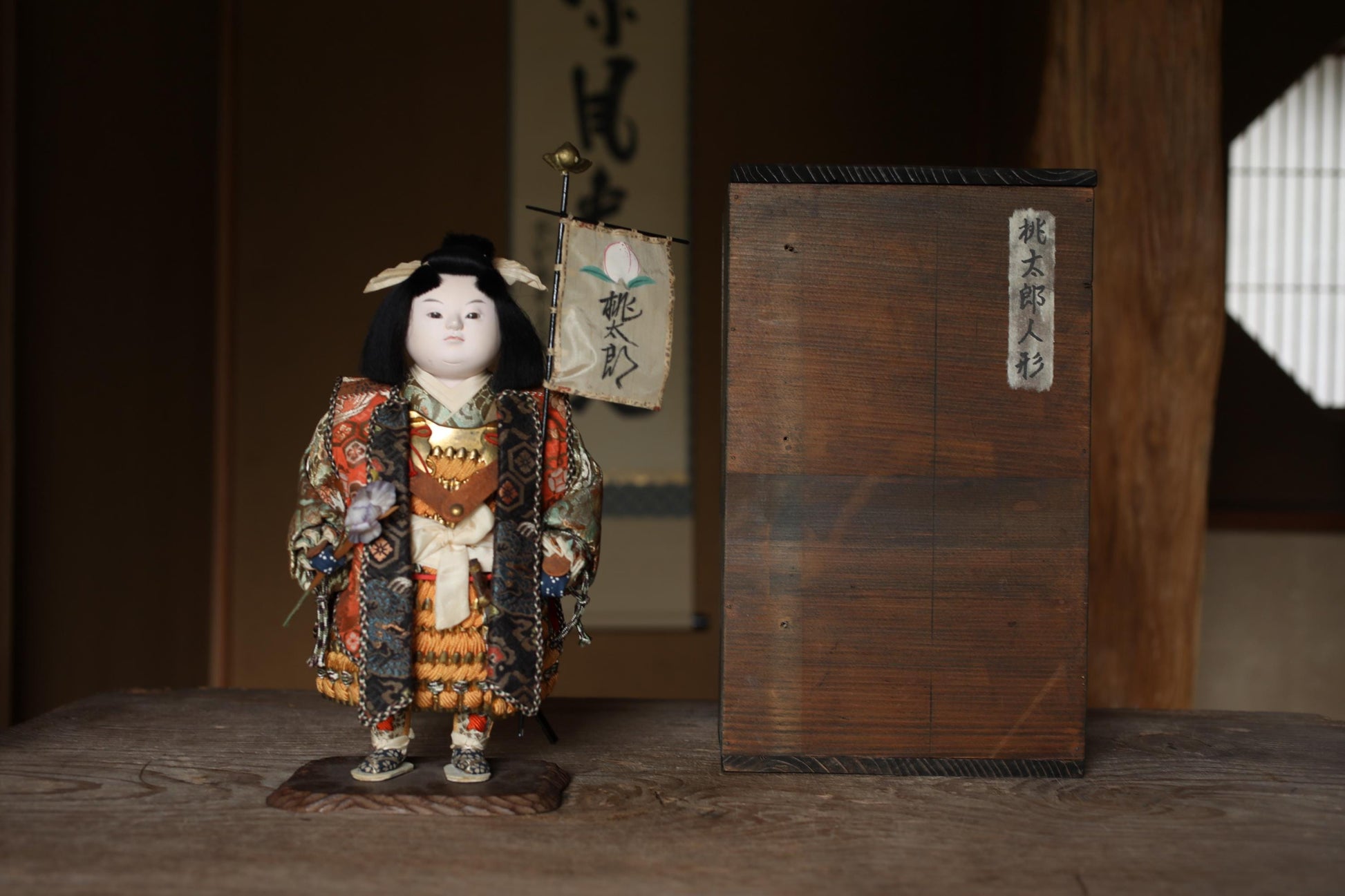 FINE! Japanese vintage 1960s Kabuki doll named "桃太郎 Monster Hunter" made of wood and silk KIMONO for Gift H11.8×6.7in/H30×17cm.