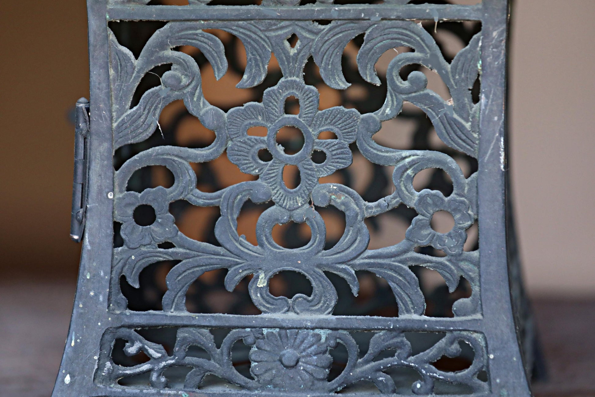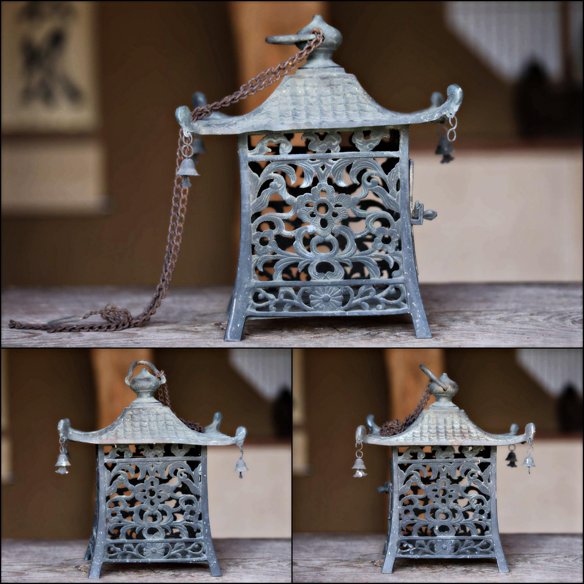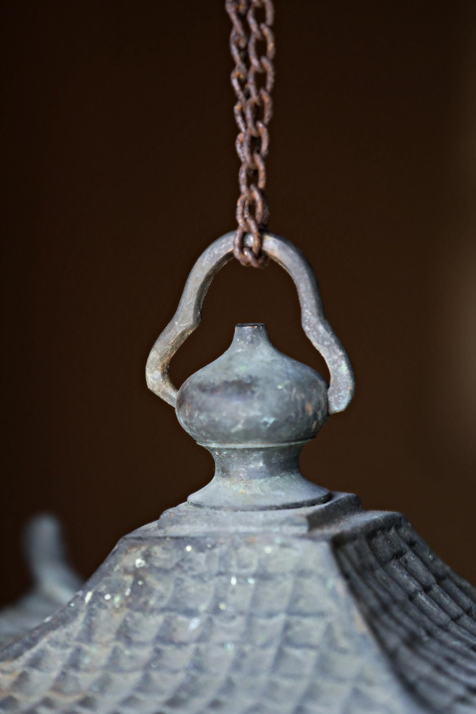 FINE! Japanese vintage bronze Lantern, garden lamp, Hanging Lantern Tsuridoro with chain bells and arabesque open work H10.8in/H27.5cm