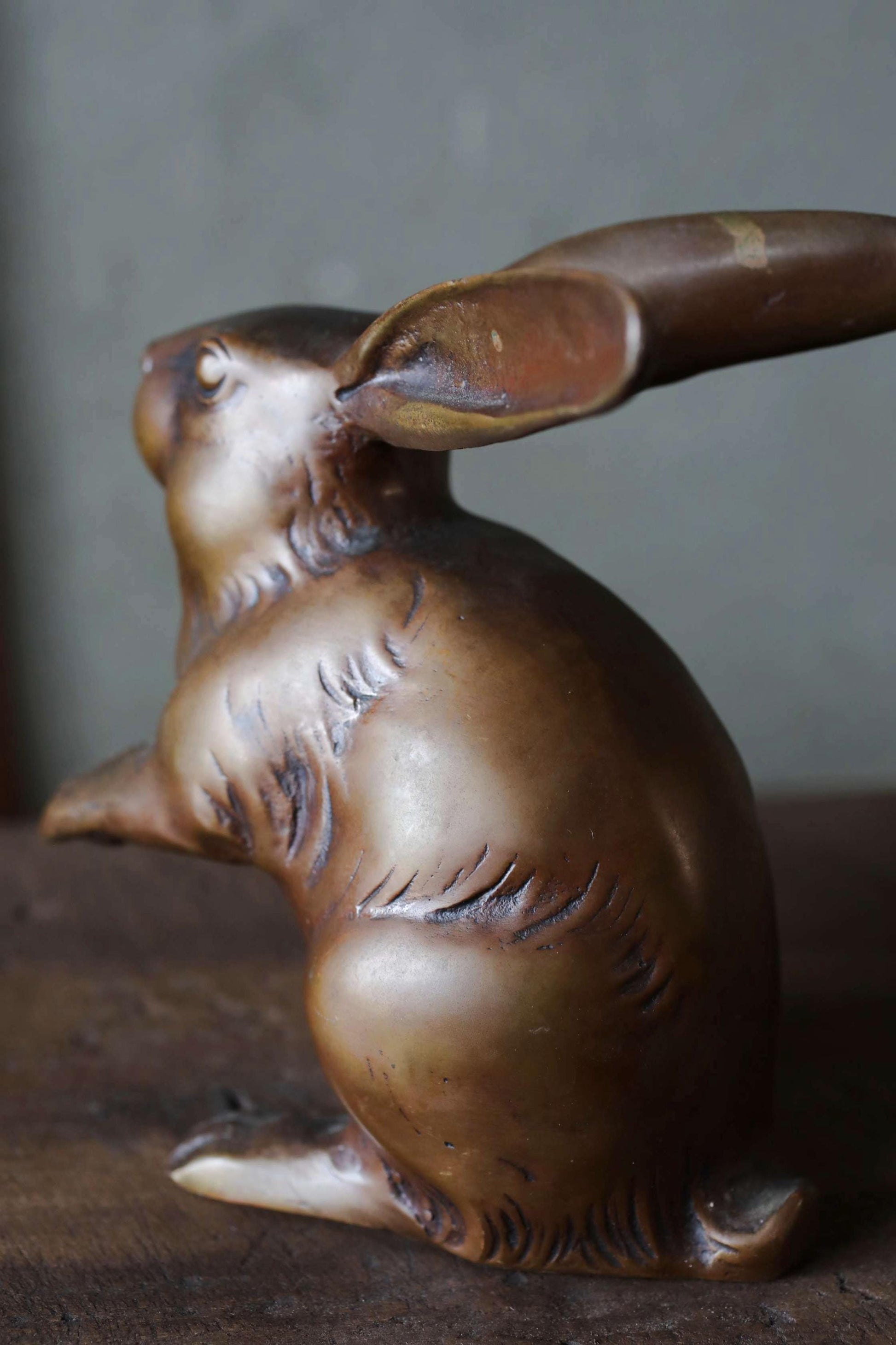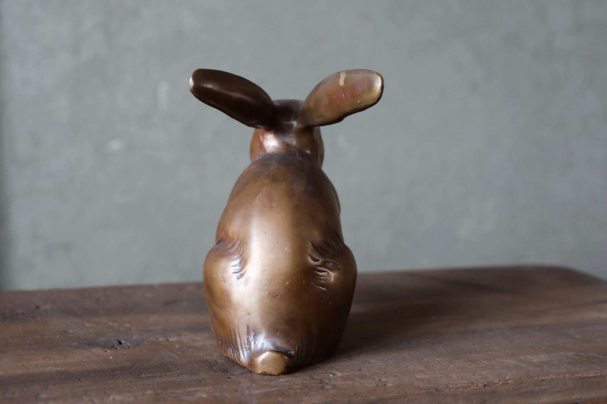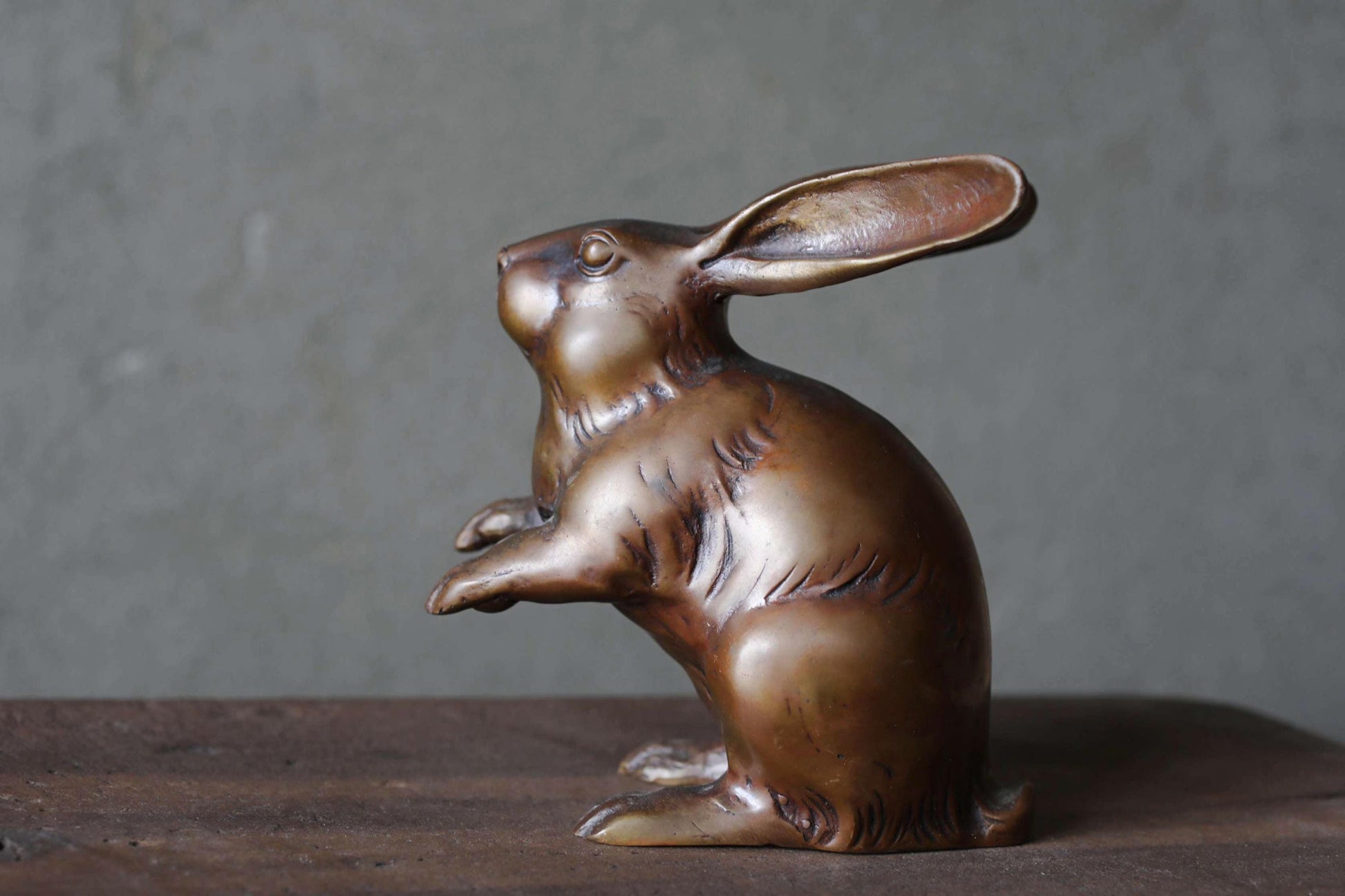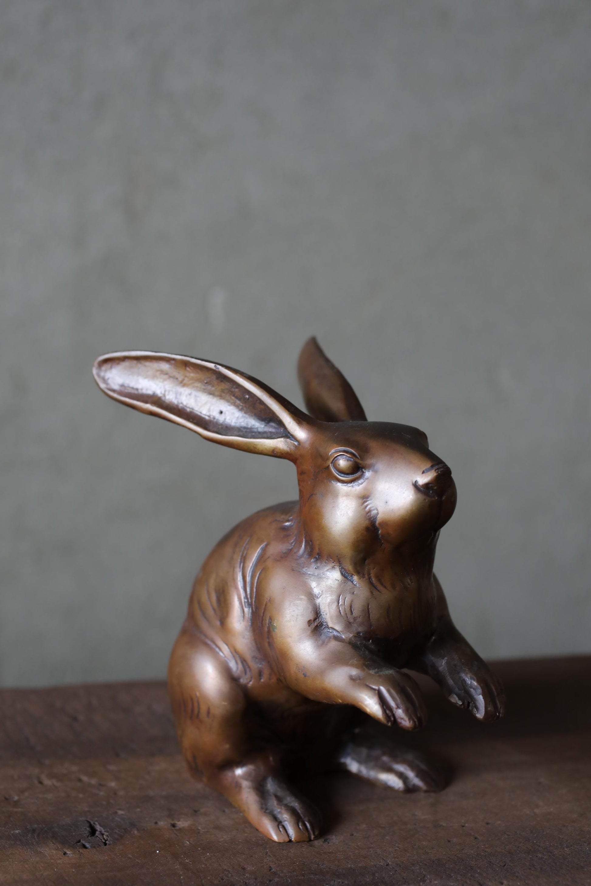 FINE! Japanese vintage bronze rabbit statue ornament doll with Kanji signature 1950s Japanese interior metal animal craft H5.5in/H14cm