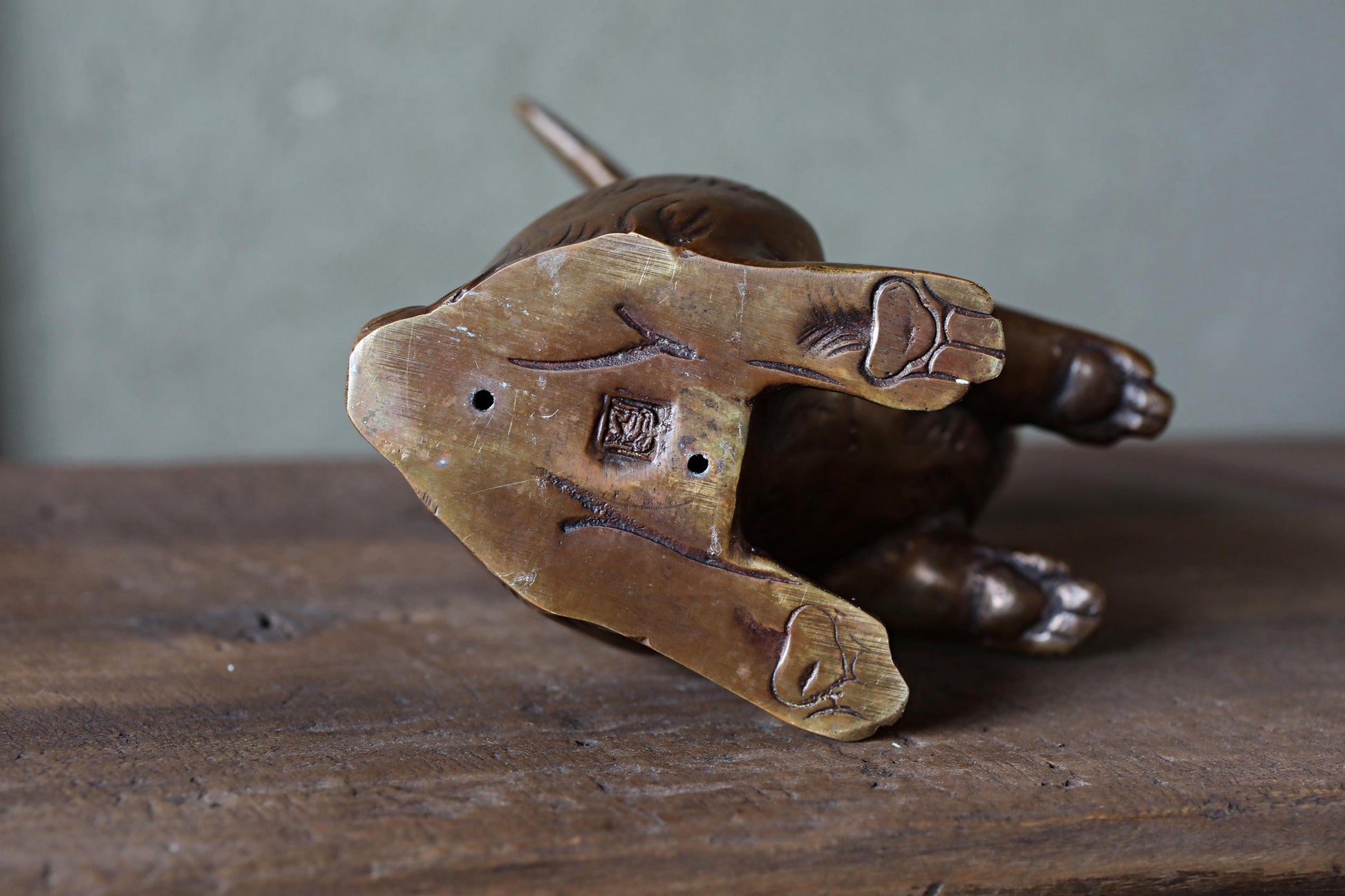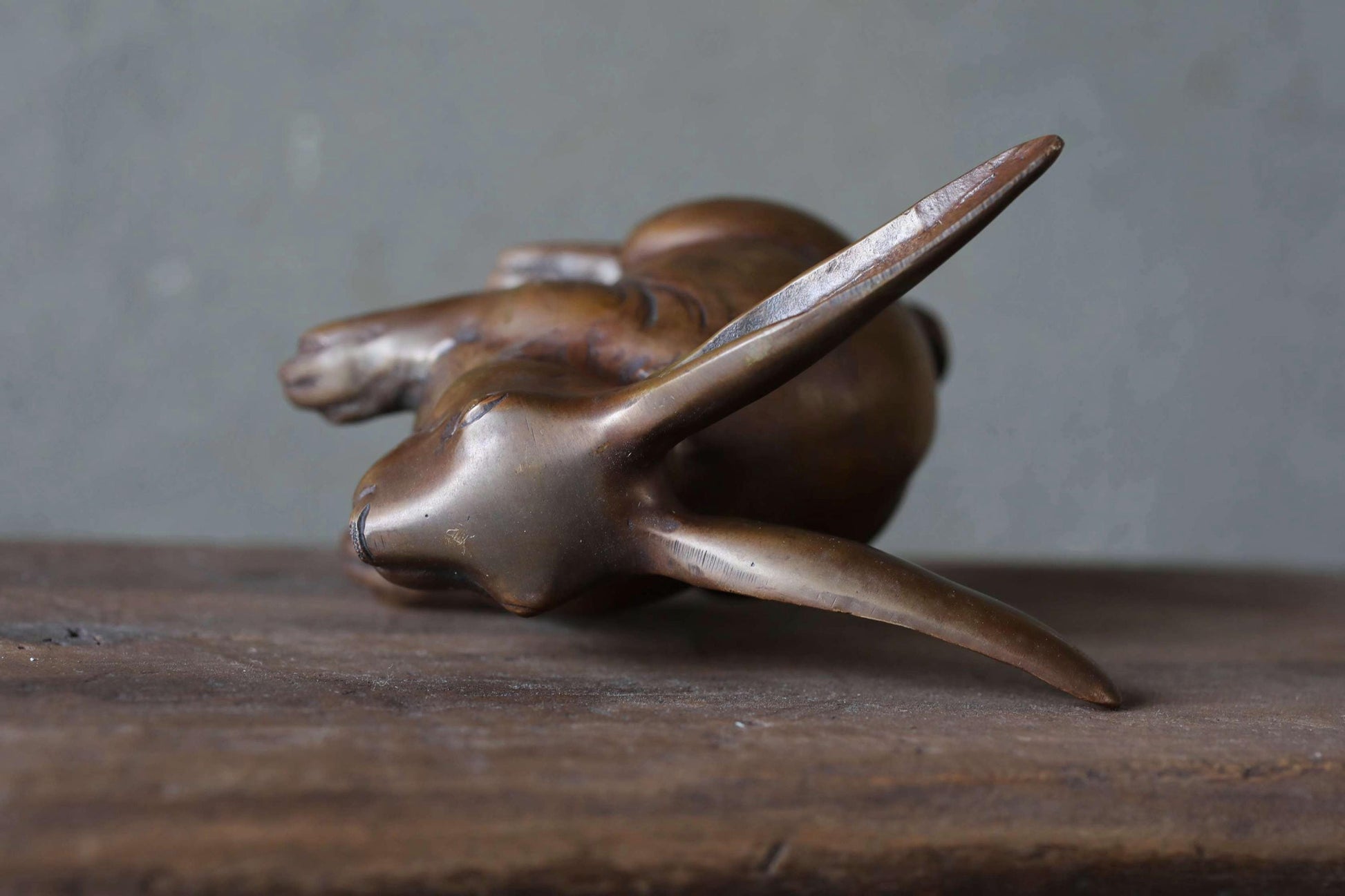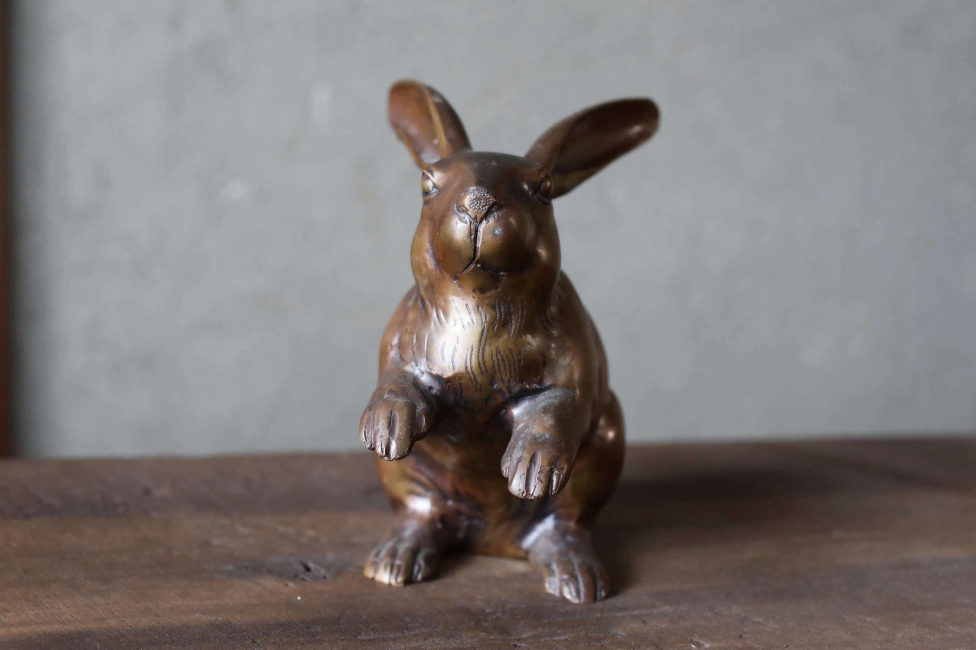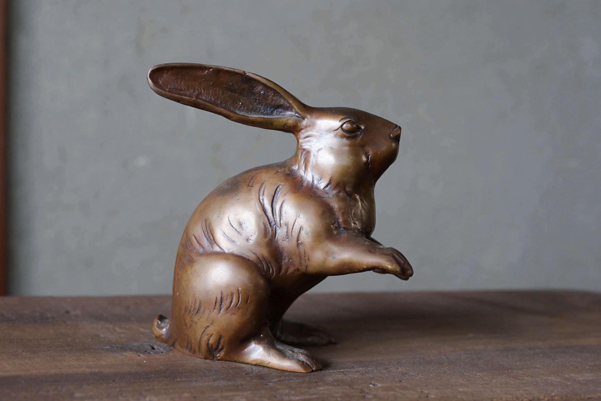 FINE! Japanese vintage bronze rabbit statue ornament doll with Kanji signature 1950s Japanese interior metal animal craft H5.5in/H14cm