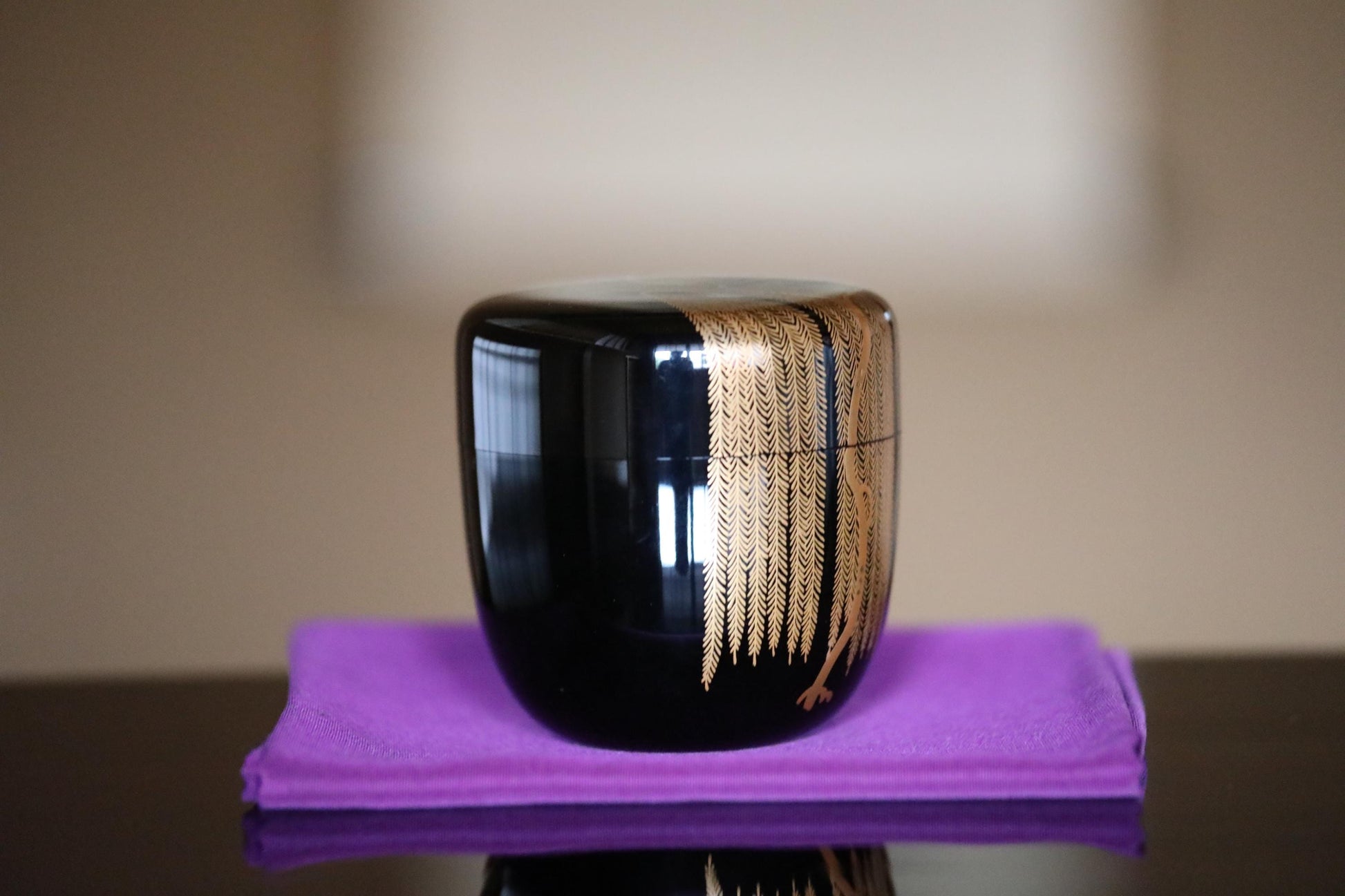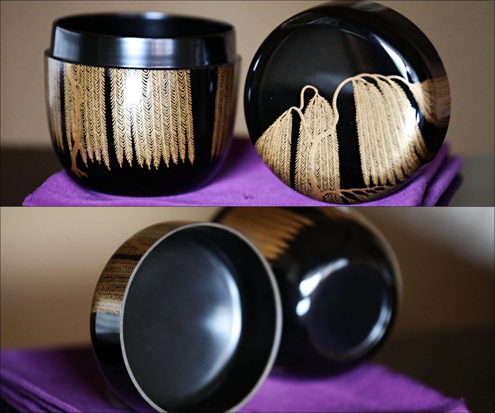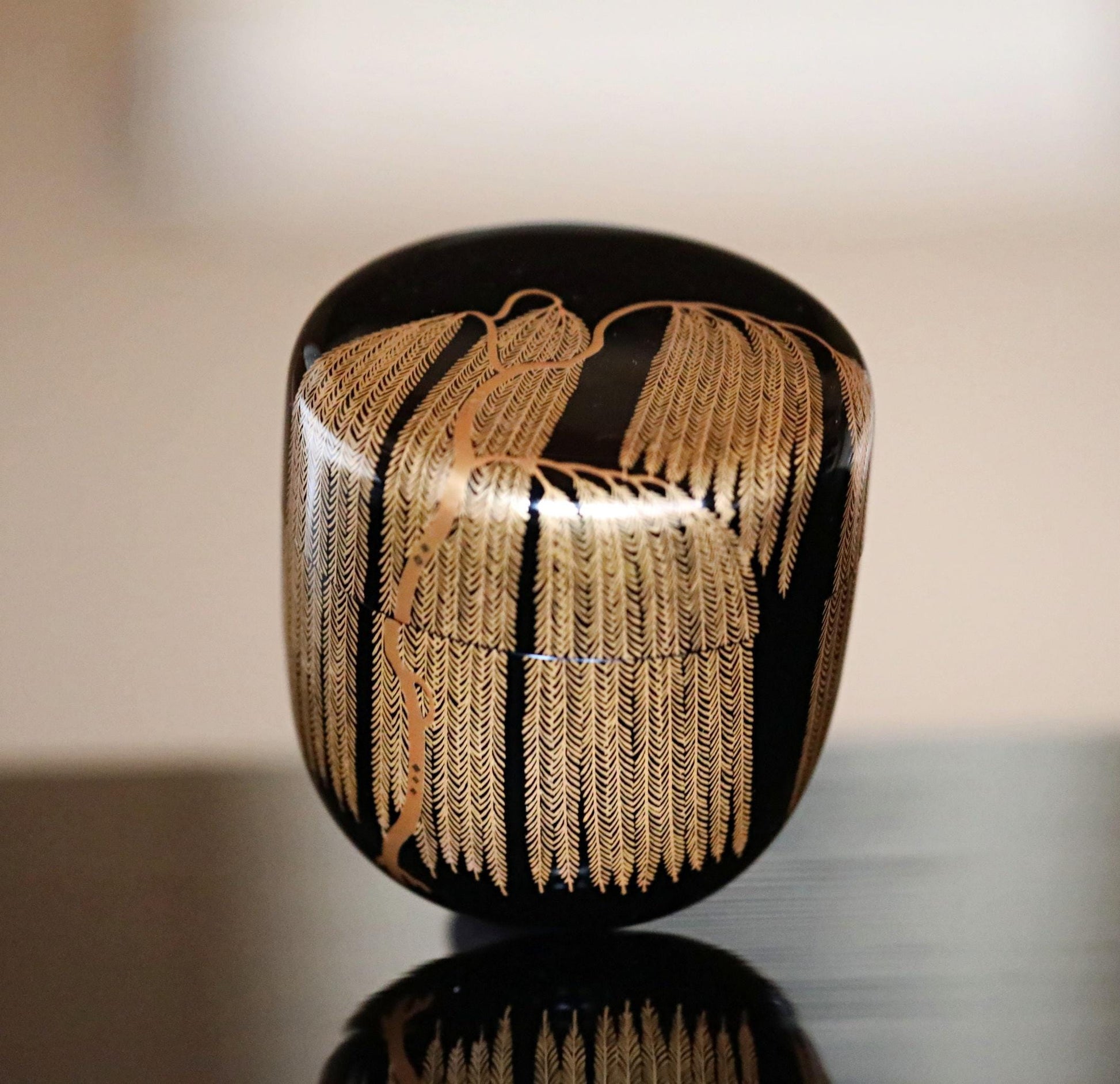 FINE!! Japanese vintage "matcha" green tea caddy with golden willow tree, "棗 natsume", for tea ceremony 1970s H3in/H7.5cm.