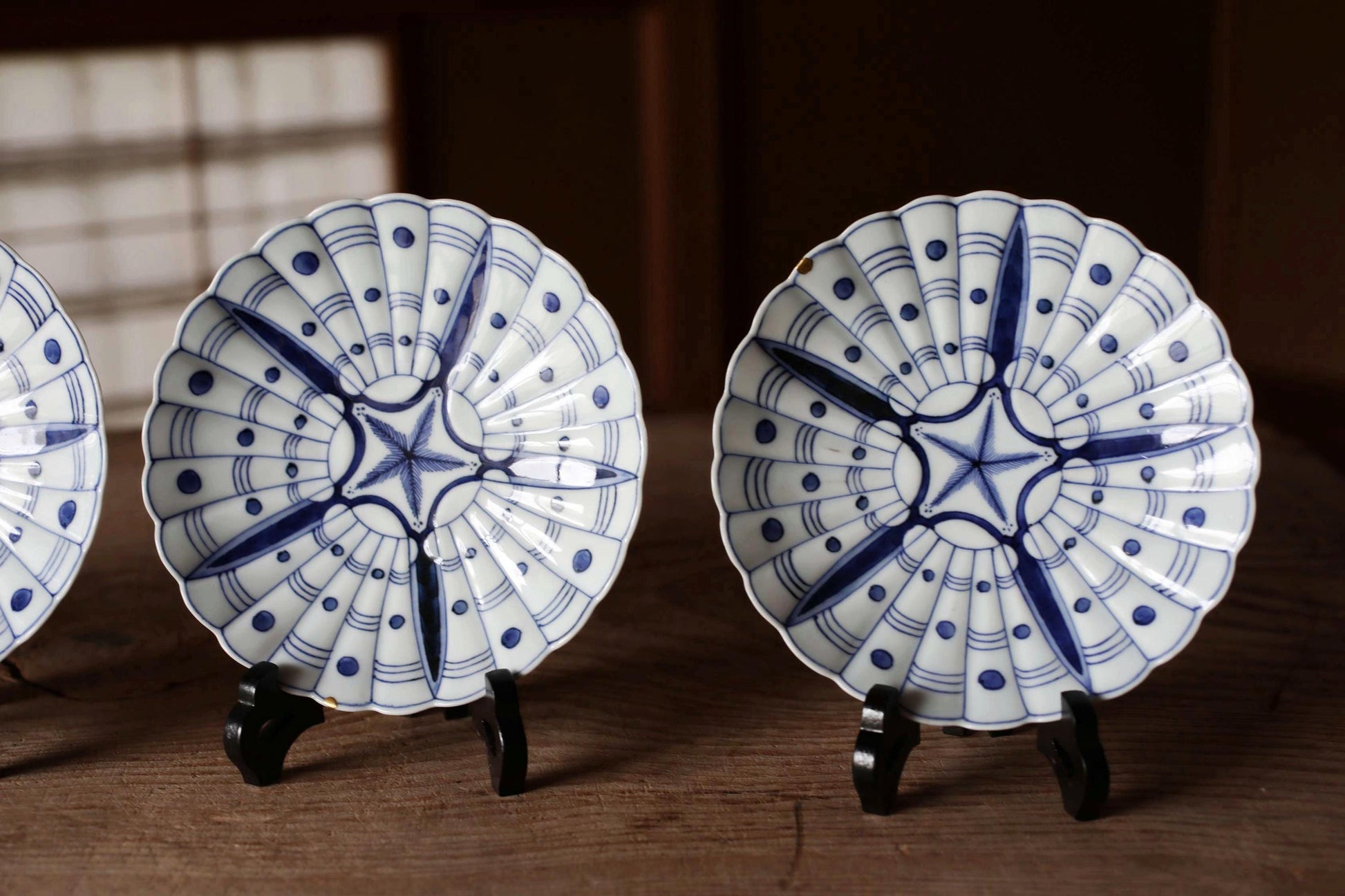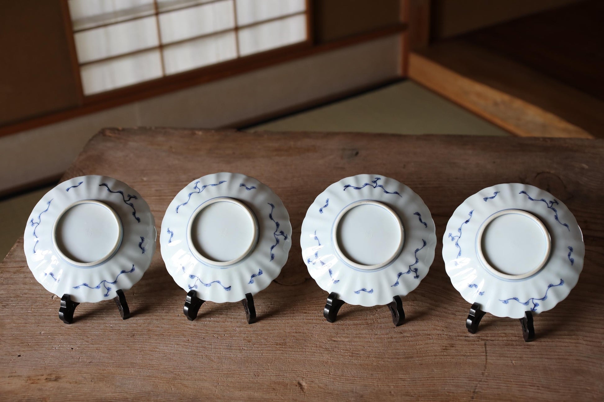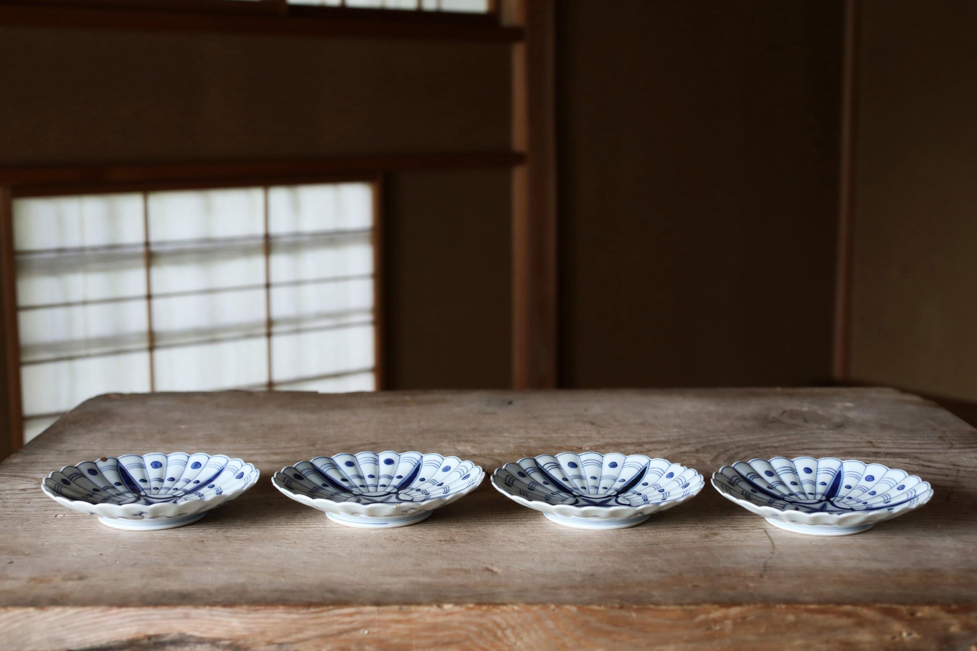 FINE! RARE! beautiful set of 4 plates Japanese antiques porcelain ceramic hand paint dish Indigo Blue White shell pattern KOIMARI 1800s.