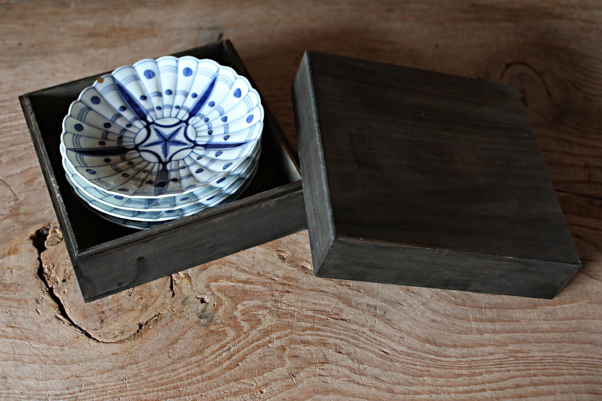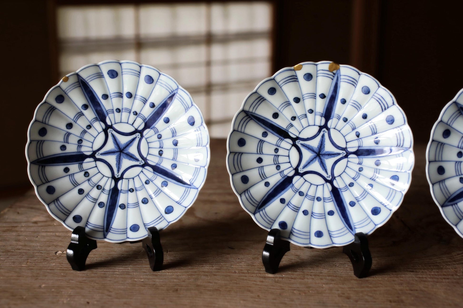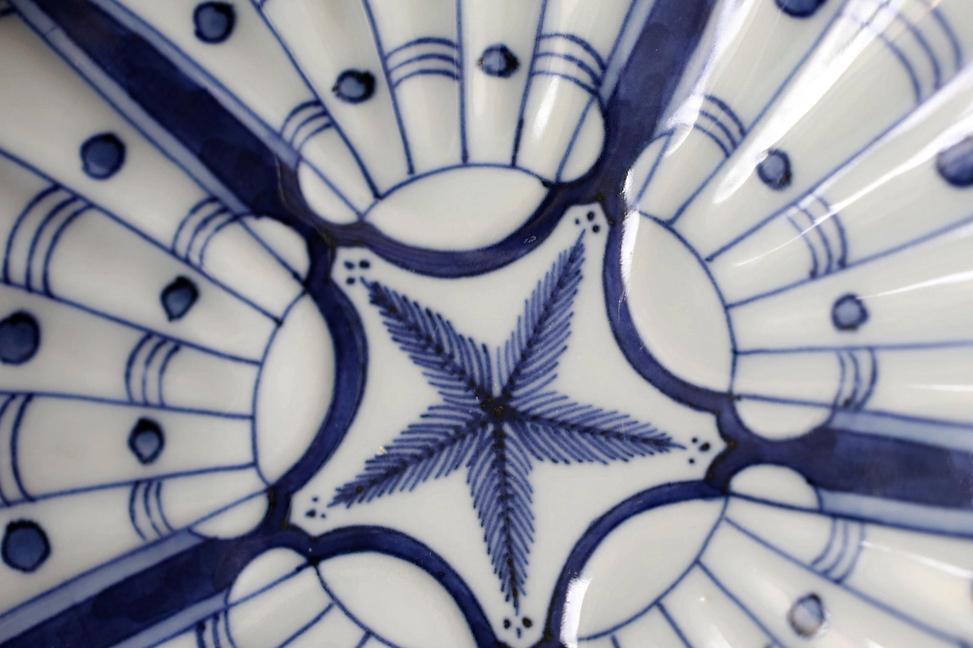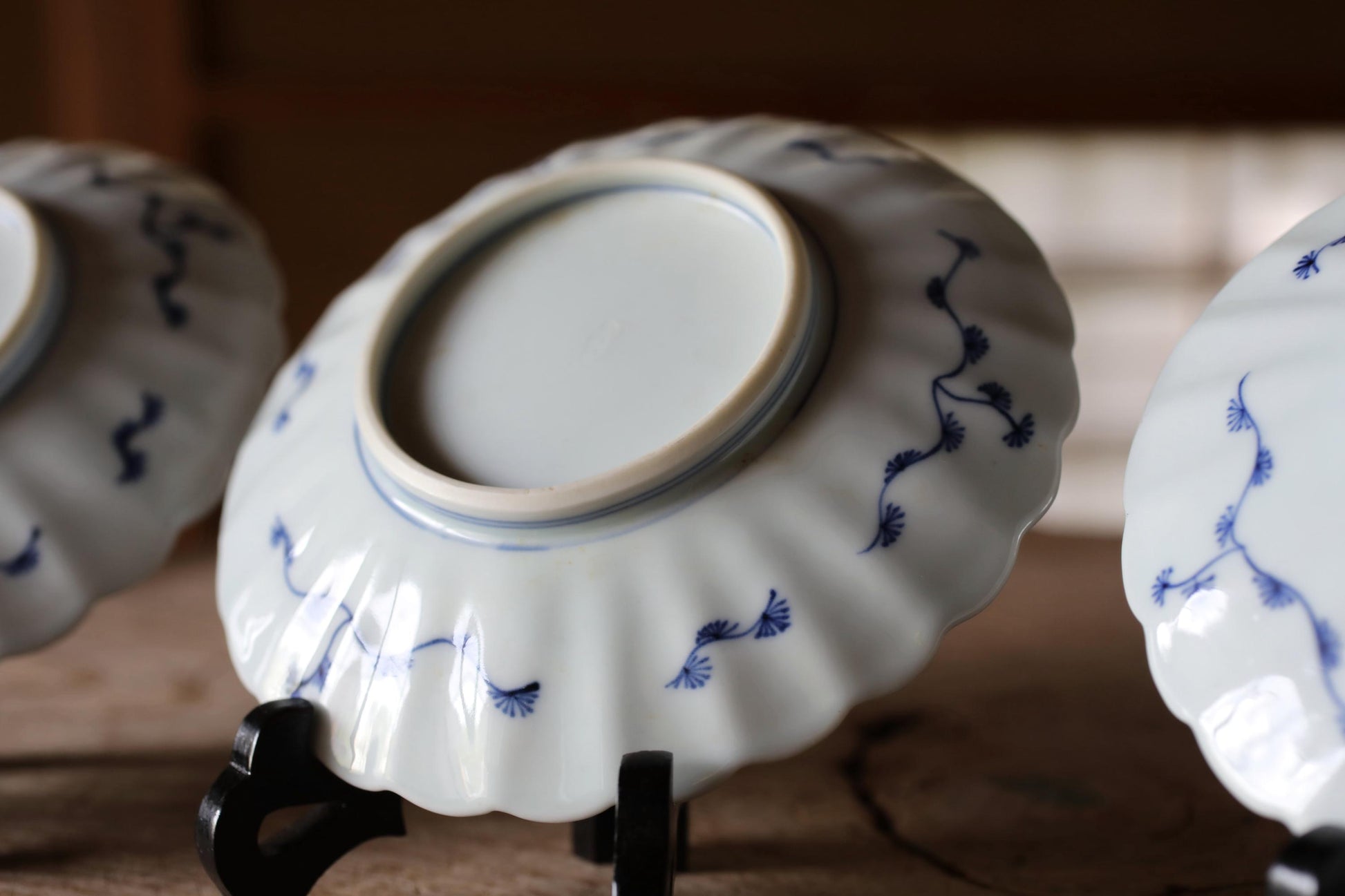 FINE! RARE! beautiful set of 4 plates Japanese antiques porcelain ceramic hand paint dish Indigo Blue White shell pattern KOIMARI 1800s.