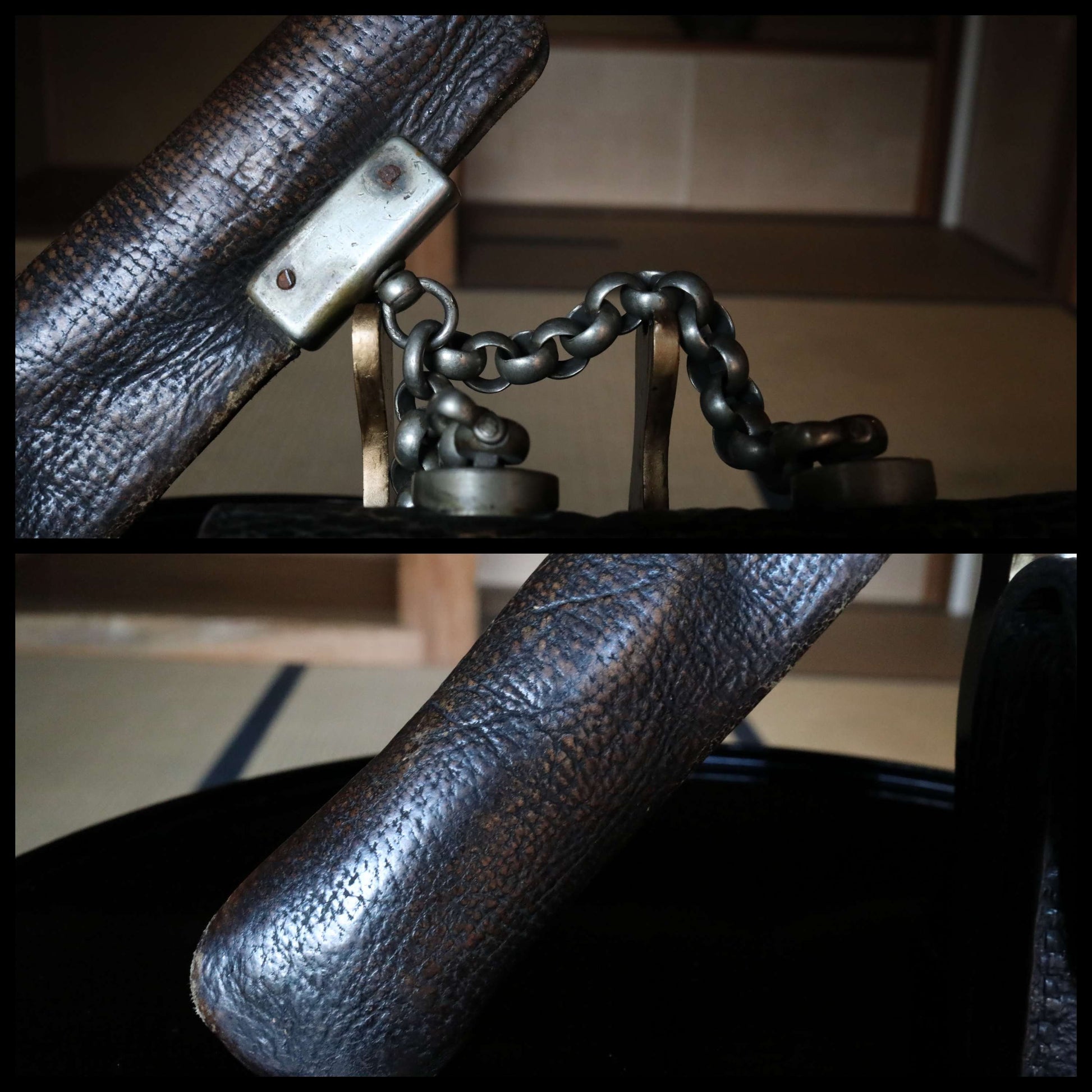 For this reason, the chains attached to the case are very rugged, large, and conspicuous. The case is also very cool. Overall, it is very large and made of thick leather. The large chains are all made of silver, and the case has a beautiful, precise dragon engraving on it.