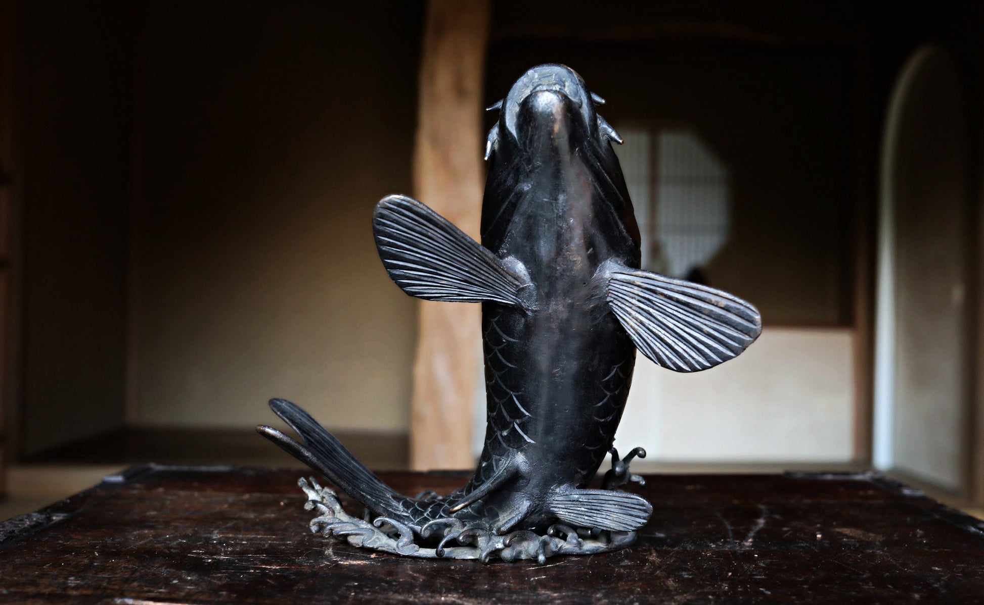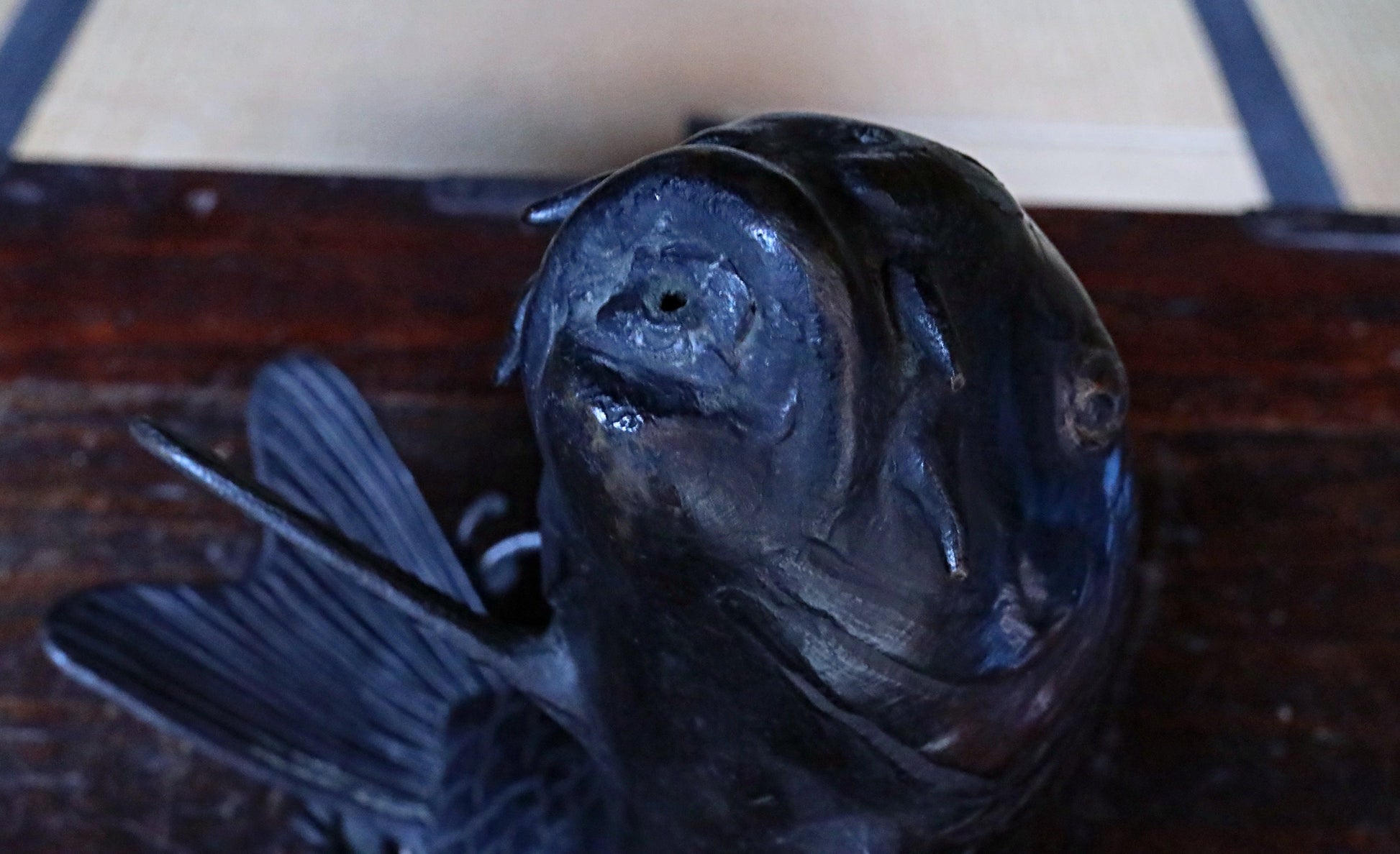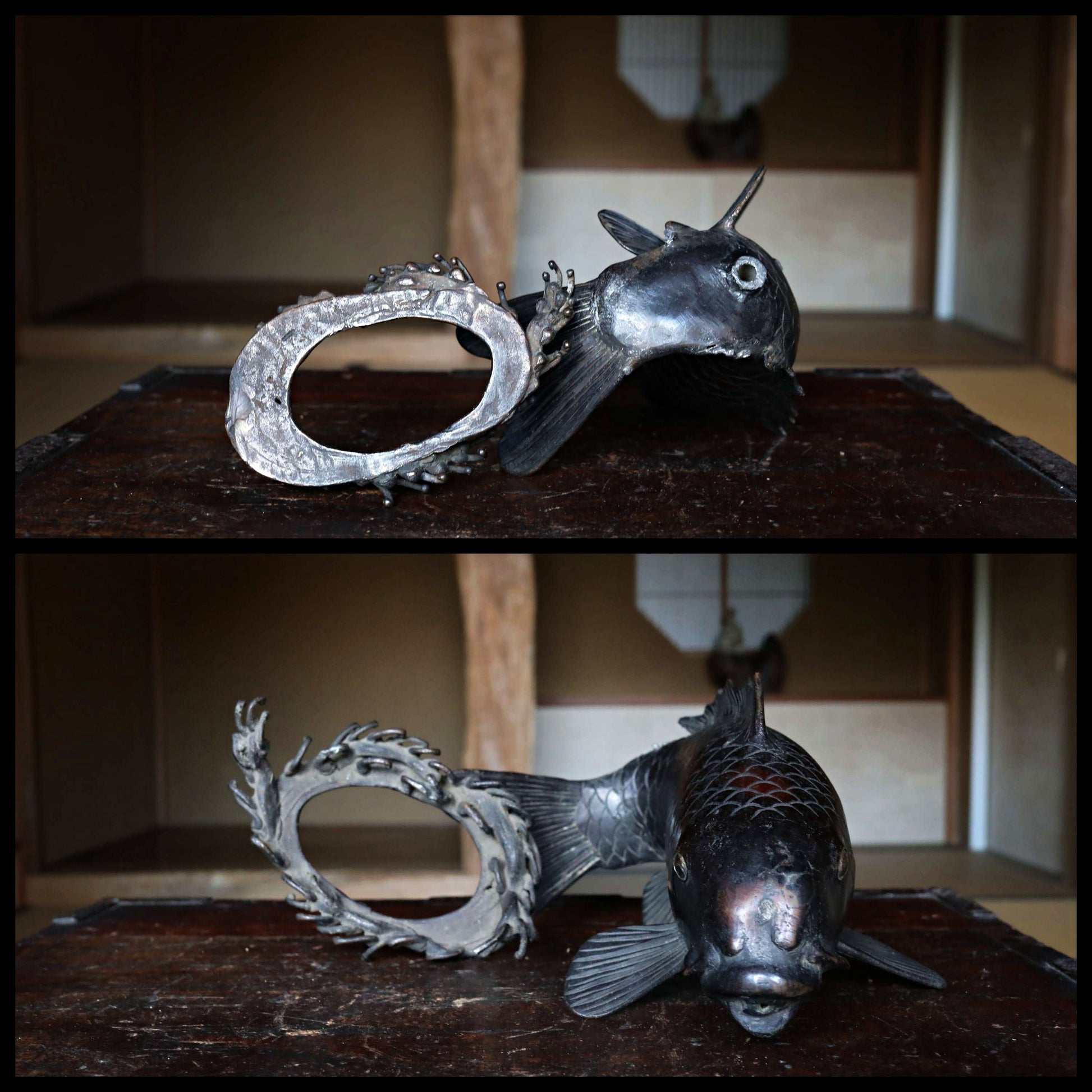 This was used as a fountain. There is a hole in the mouth, through which water comes out. It can be separated from the wave-shaped part, and the koi can be tilted at any angle you like. It can also stand on its own like a wave.