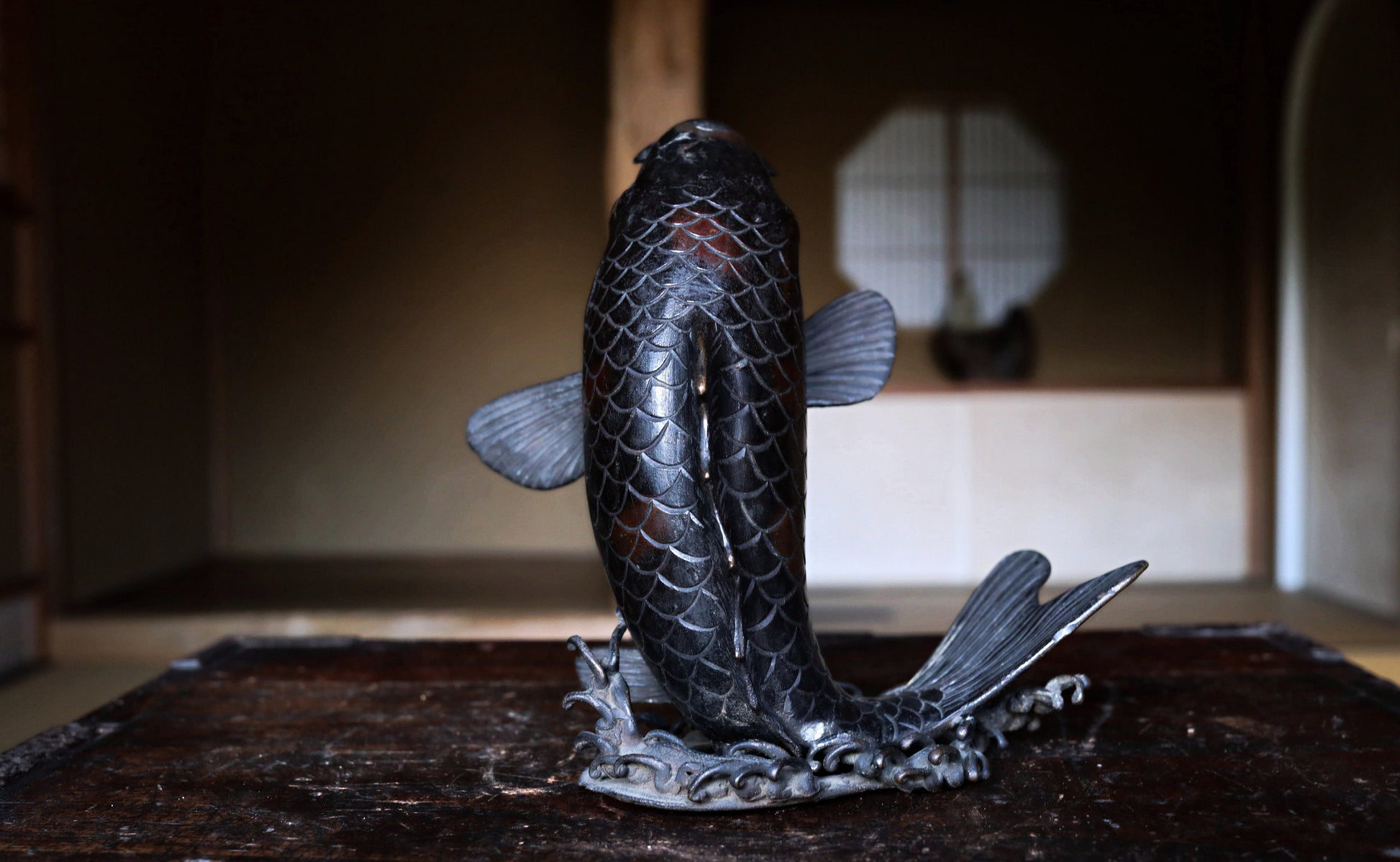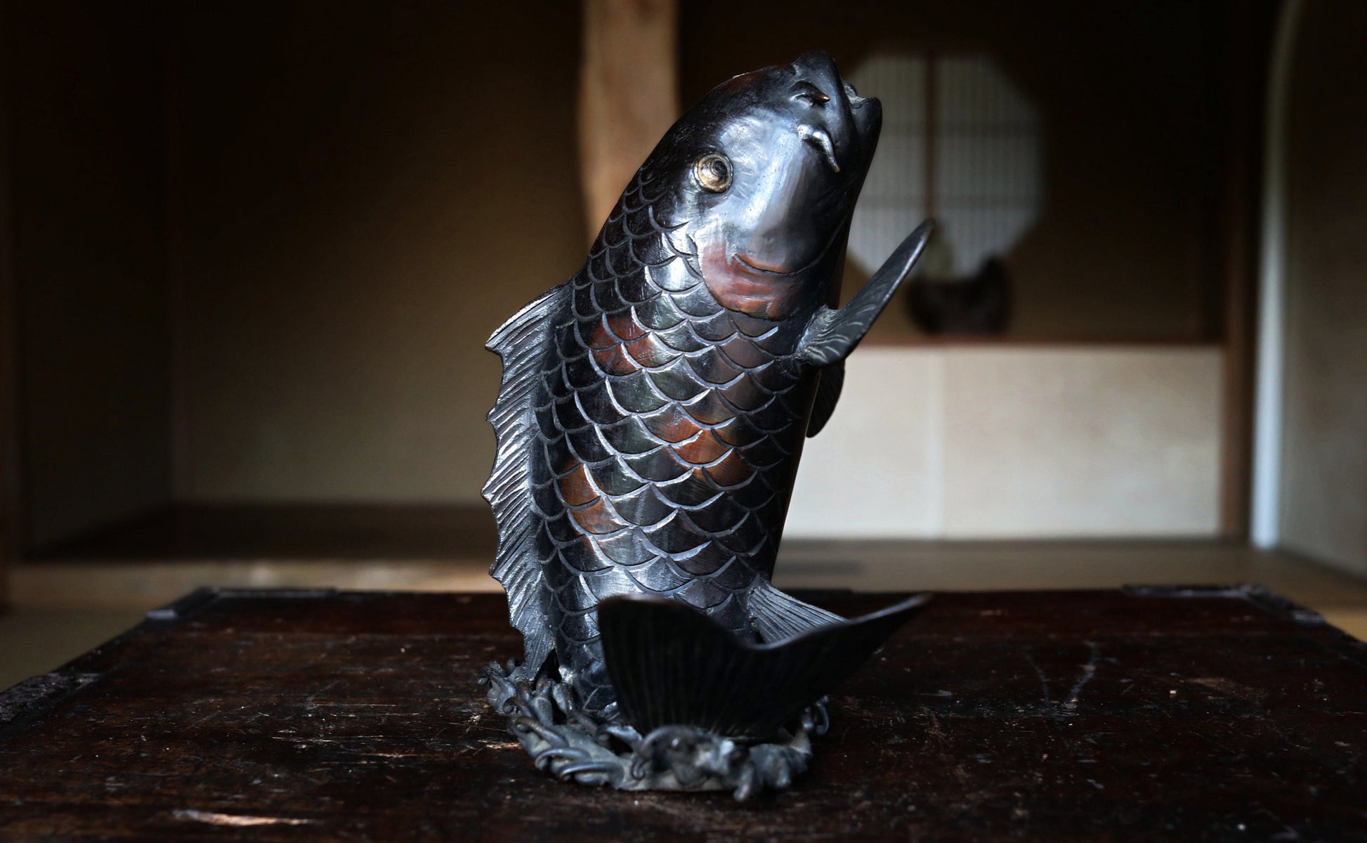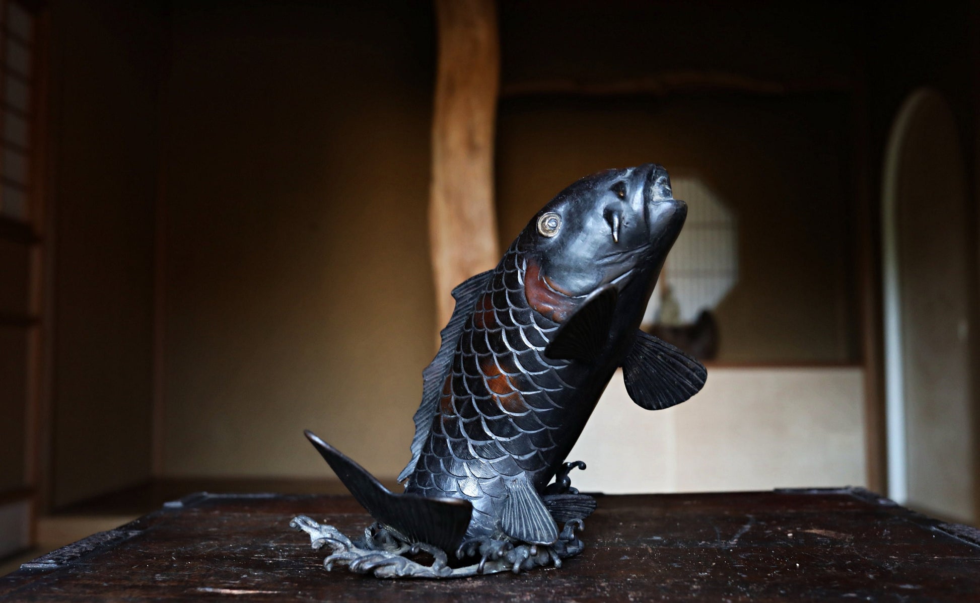 This was used as a fountain. There is a hole in the mouth, through which water comes out. It can be separated from the wave-shaped part, and the koi can be tilted at any angle you like. It can also stand on its own like a wave.