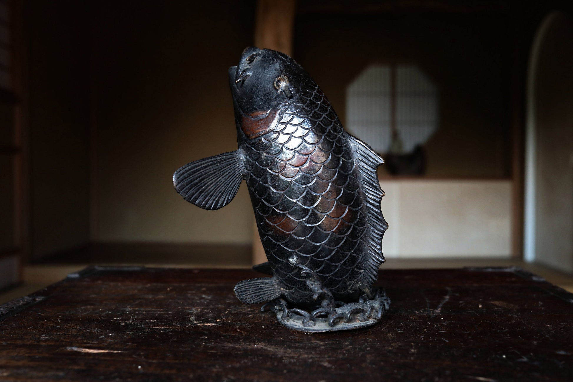 Although dragon faucets are seen in Japanese shrines, they are rarely made of carp and are very precious. The color of the time-worn copper is beautiful, and the sculpture expresses dynamic movement and is in good condition. Waves and other elements are also delicately expressed.