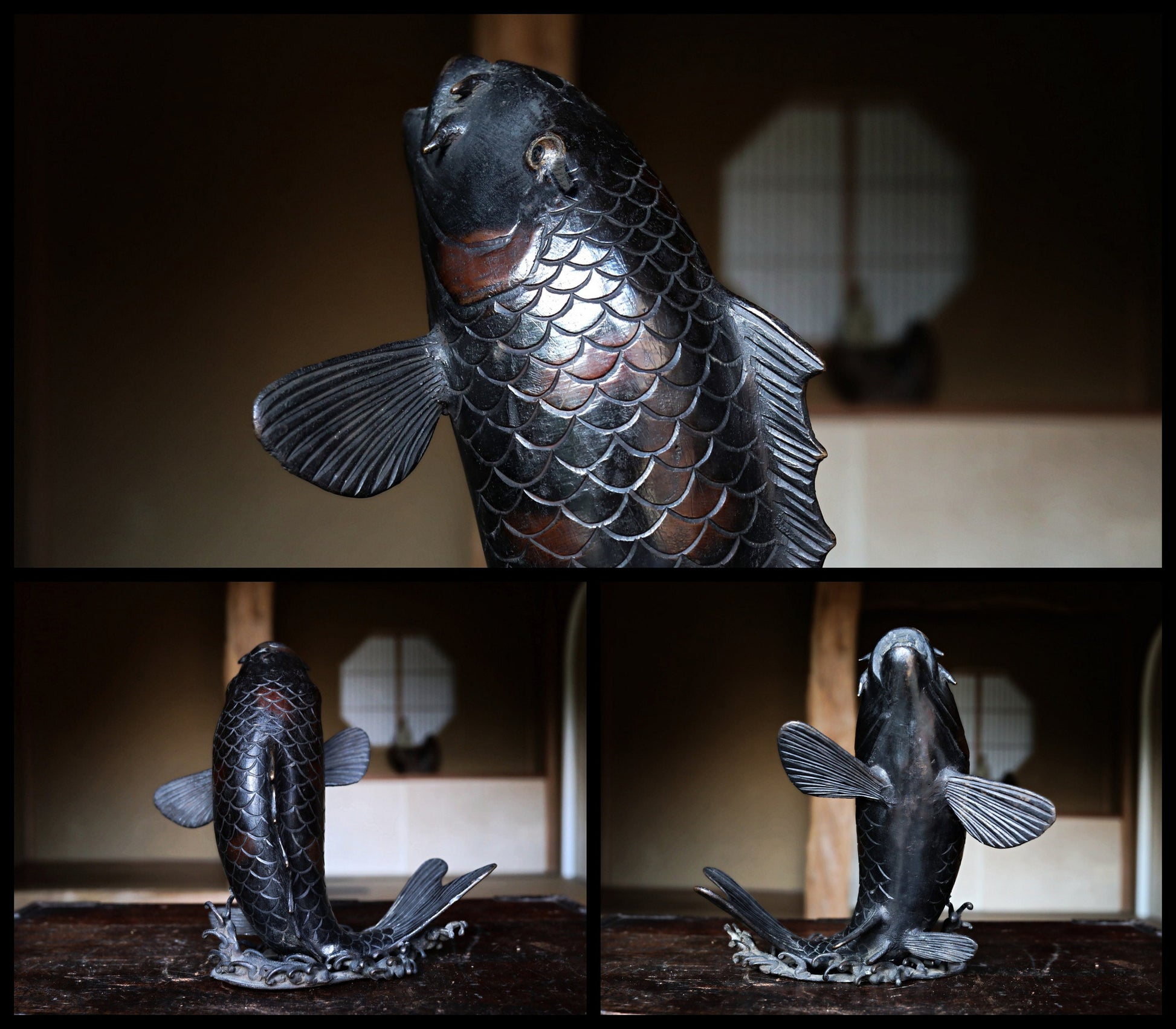 This copper 鯉KOI carp and wave sculpture piece is a rather rare custom-made piece. This is not just an ornament, it can be used as the mouth of a fountain!