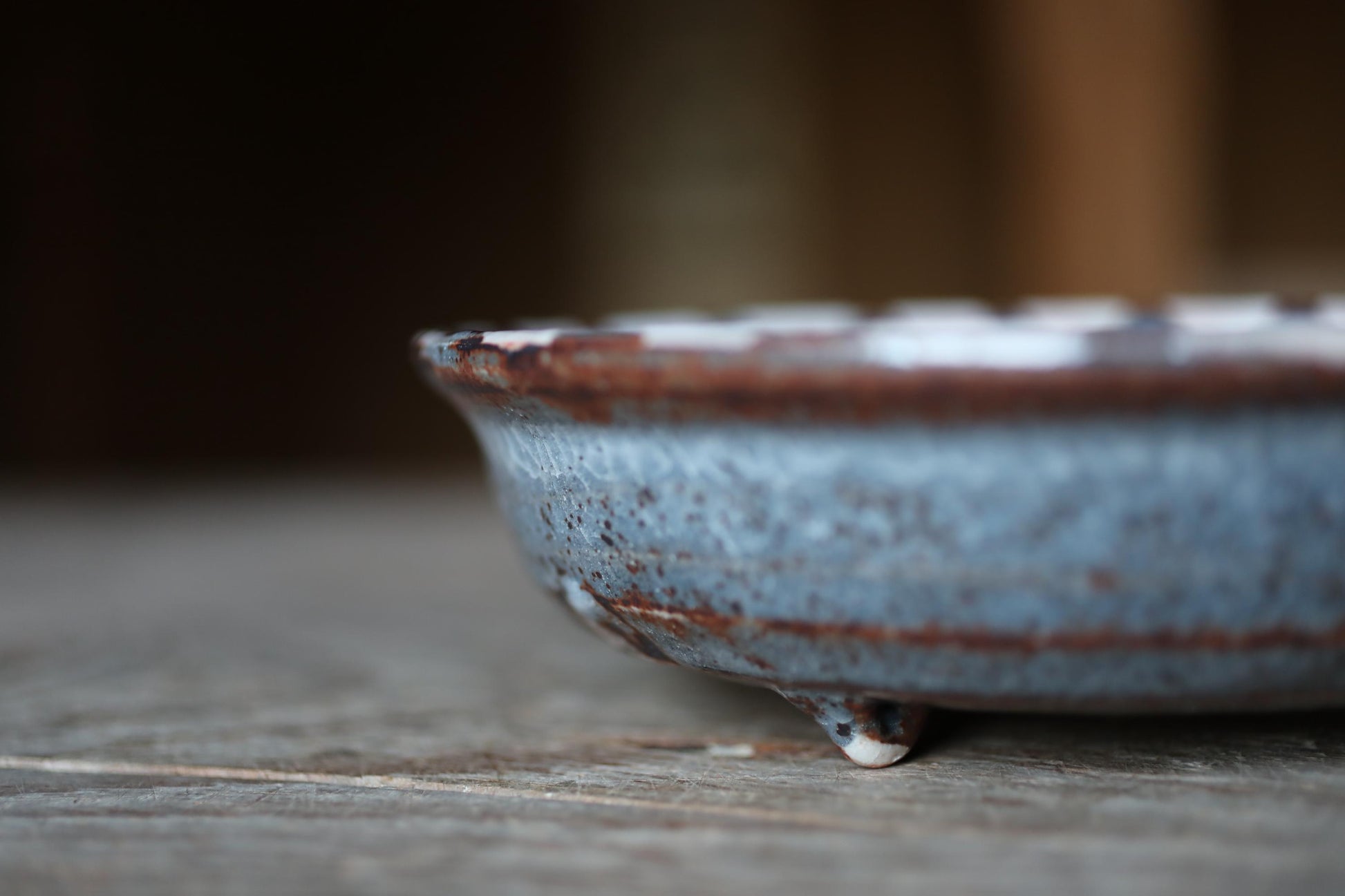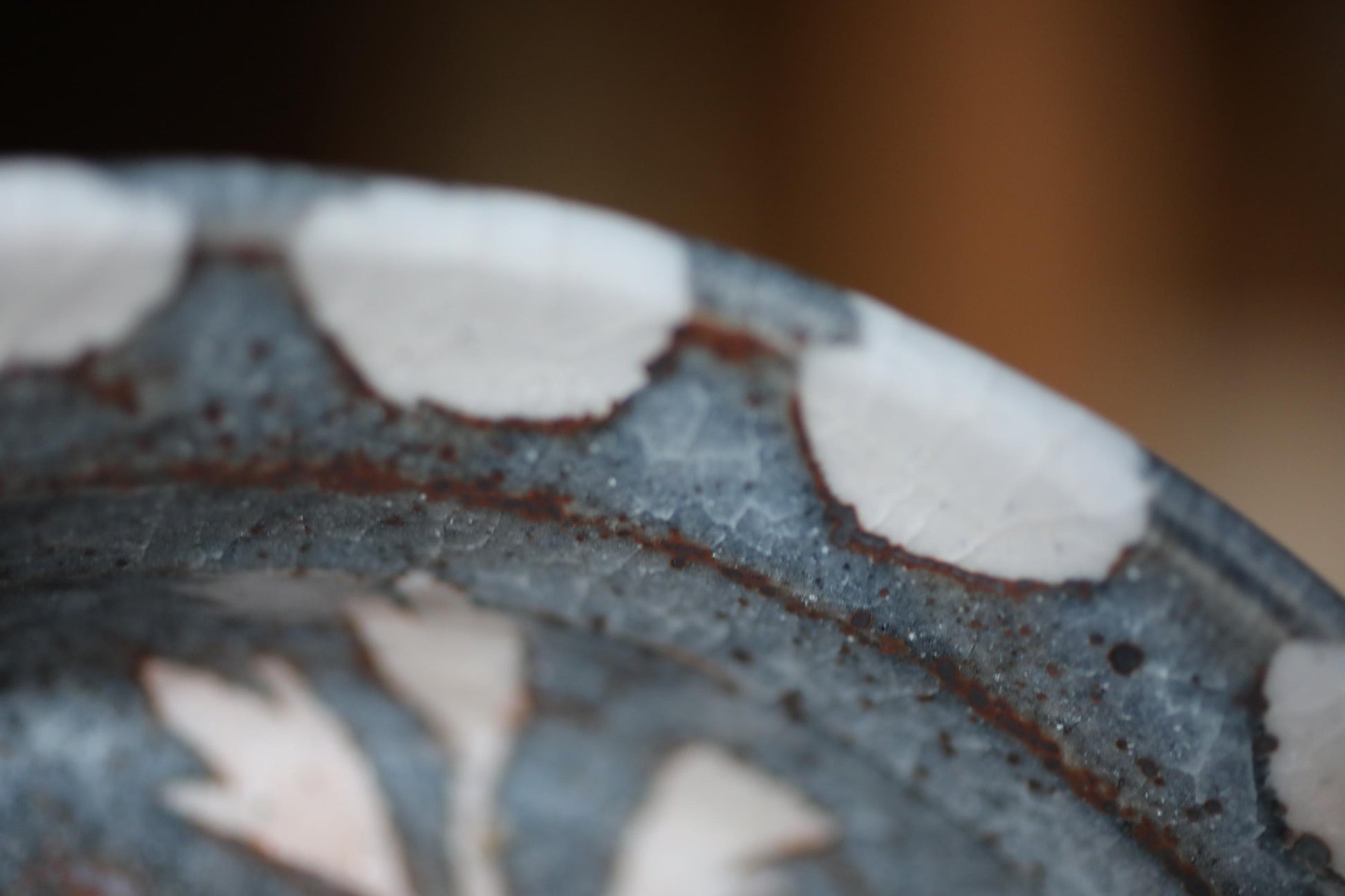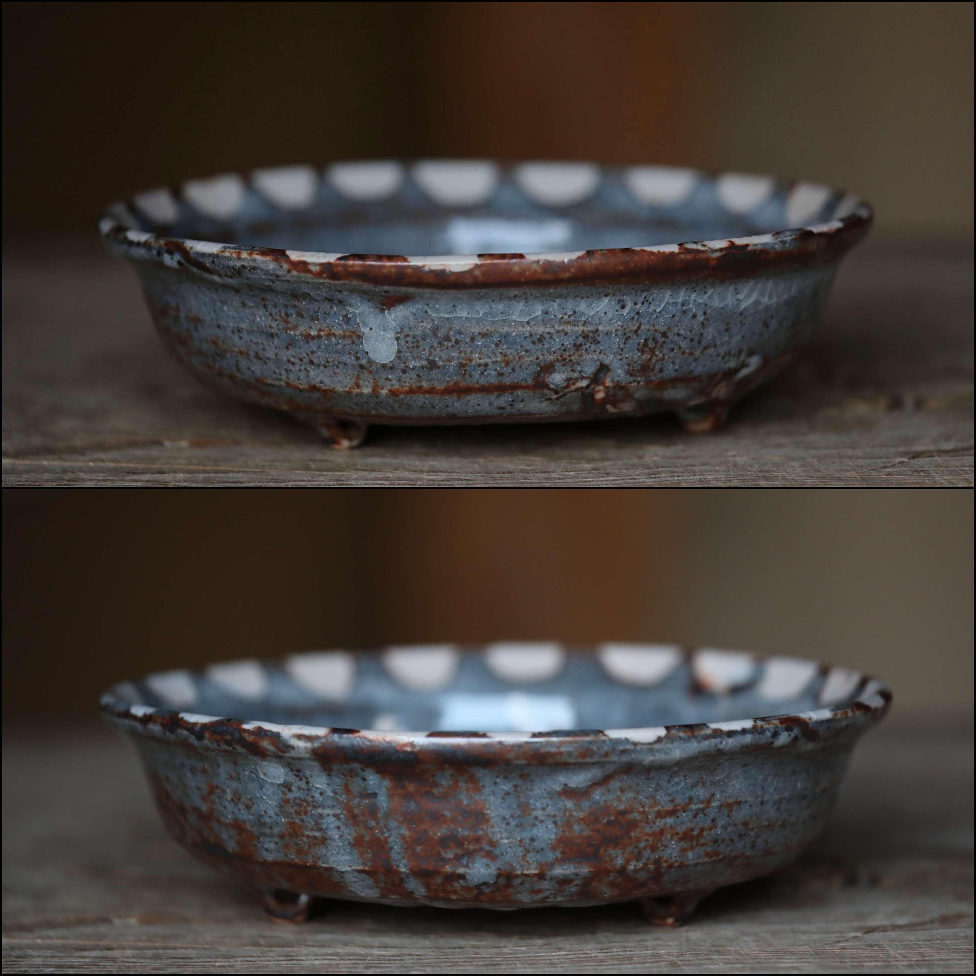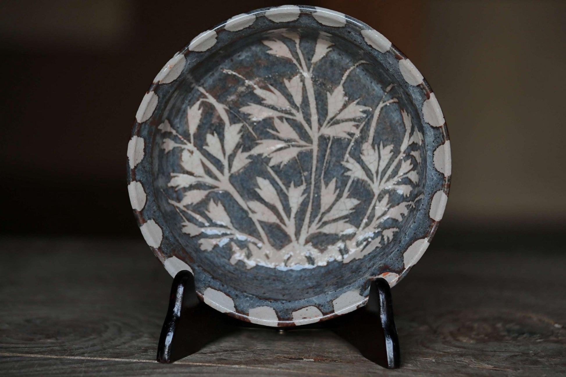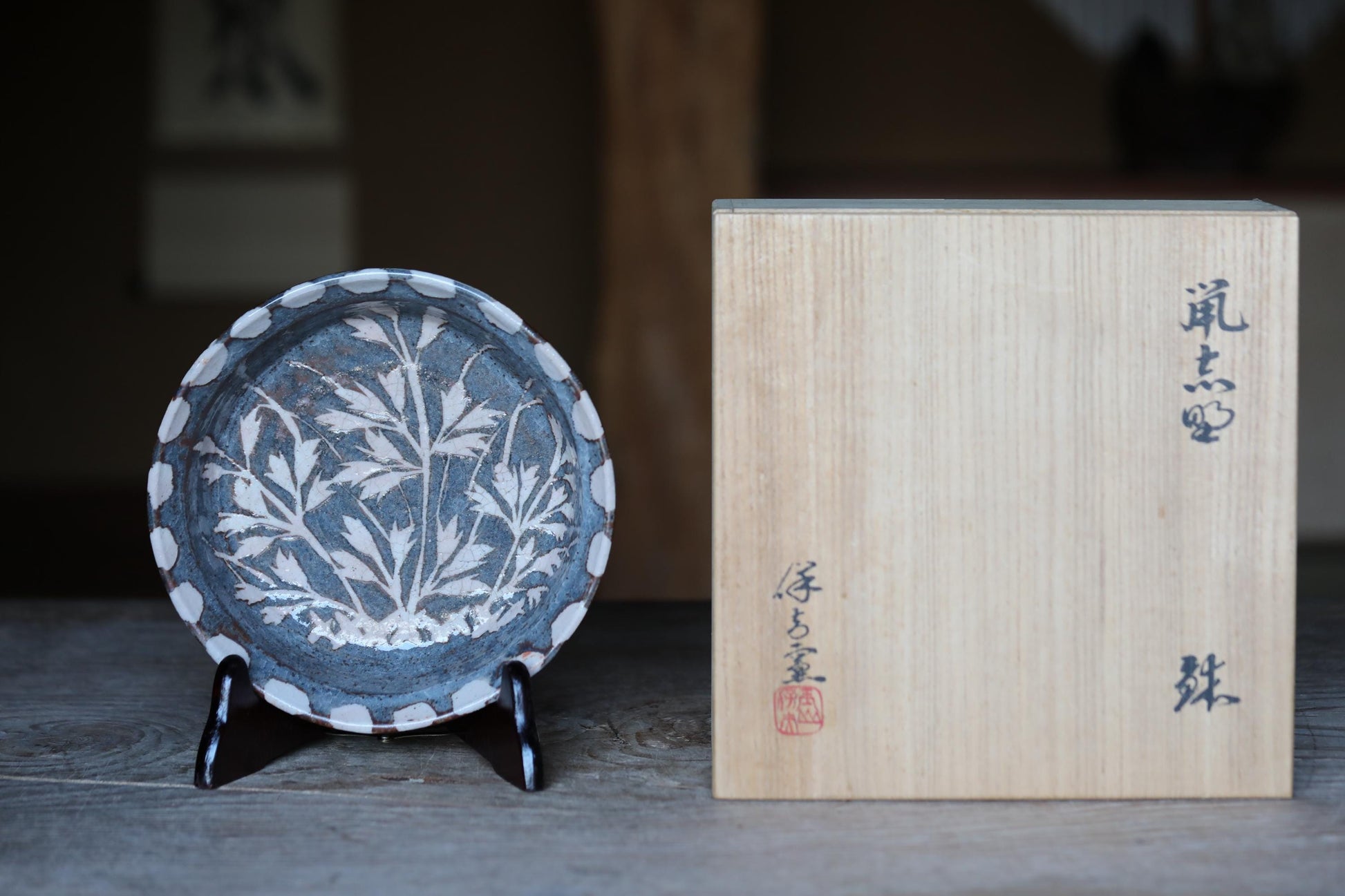 It is called " 鼠志野 Nezumi-Shino" and has a beautiful, elegant gray glaze. The surface has beautiful cracks in the glaze and is painted with botankcal pictures.