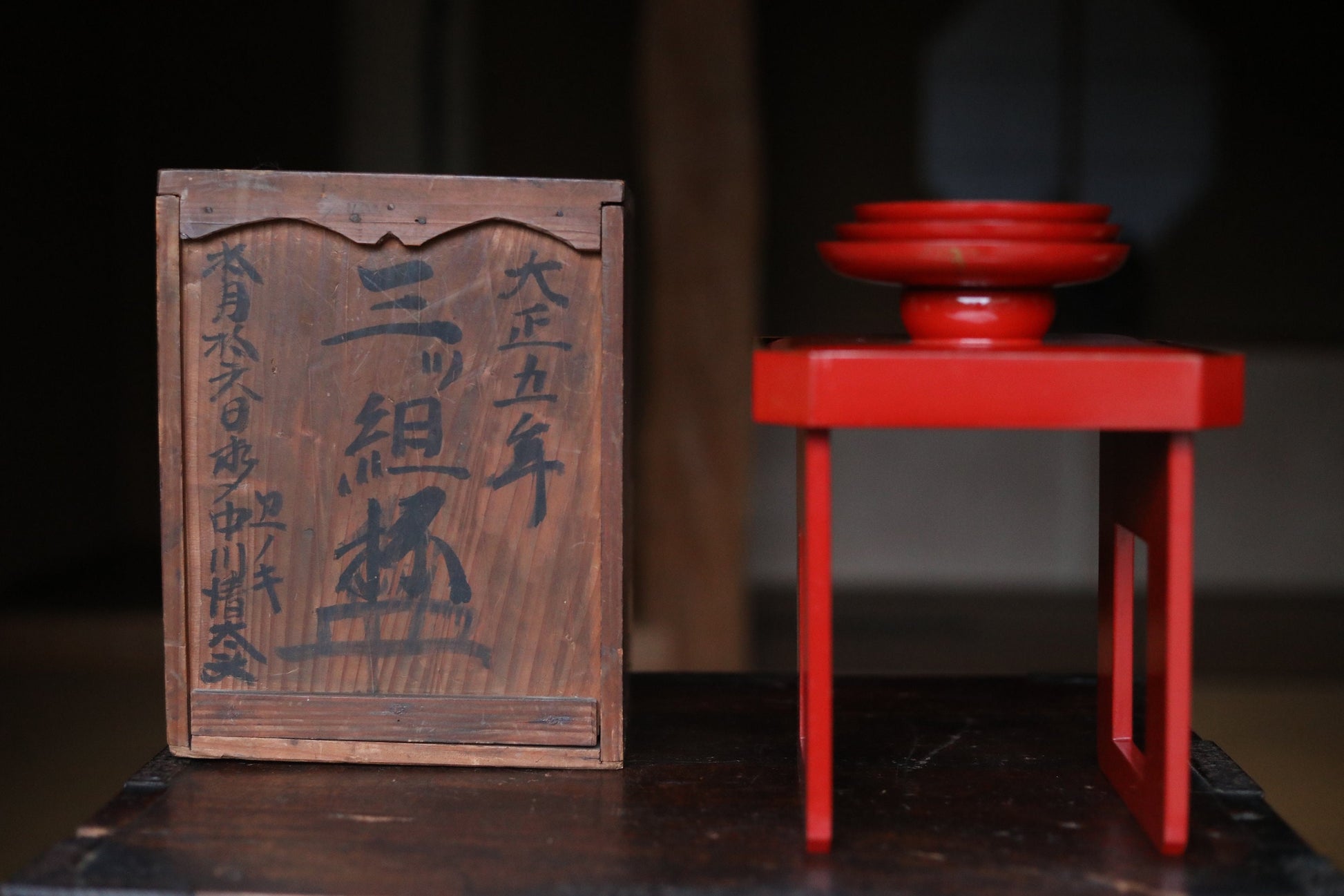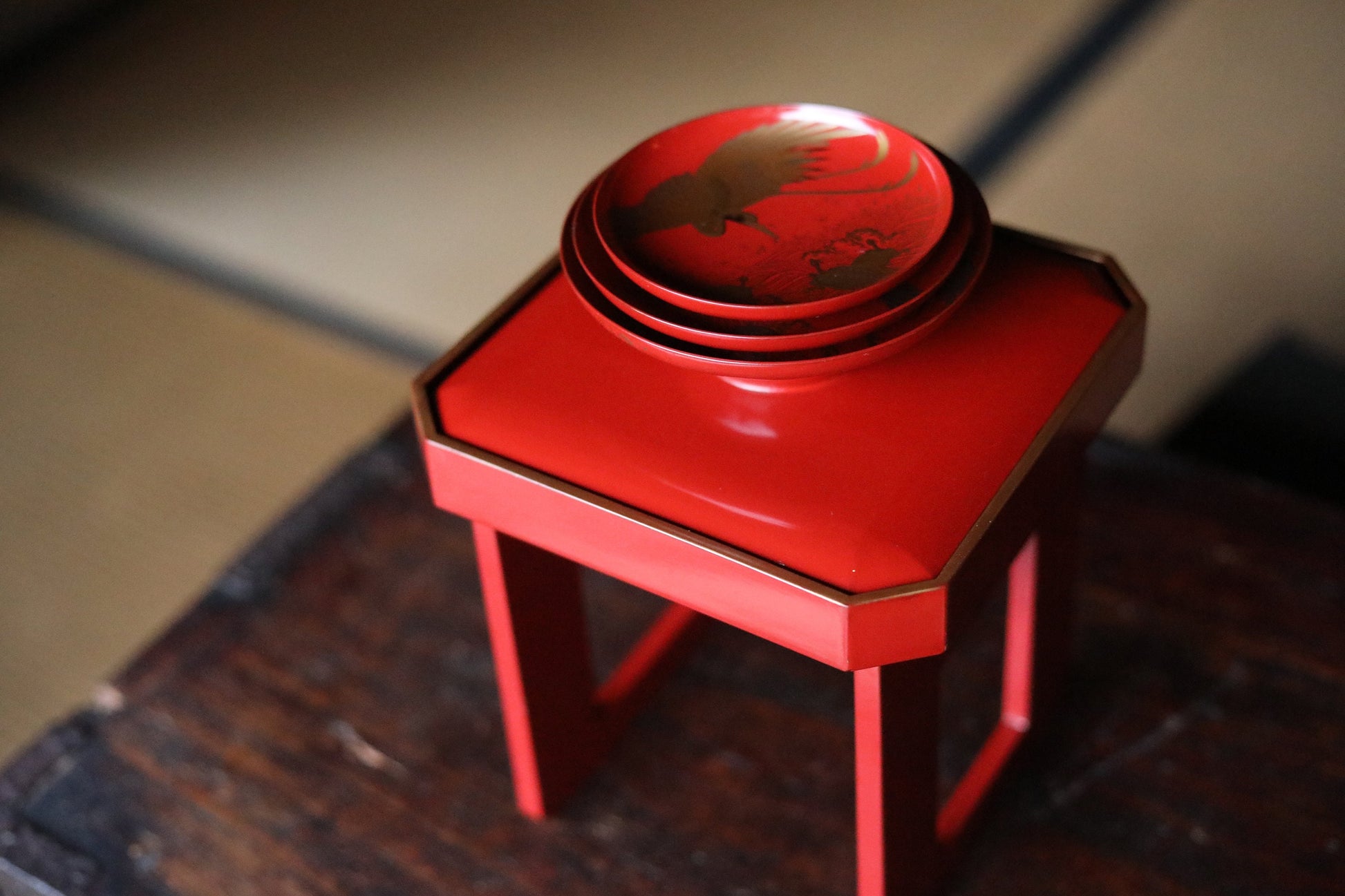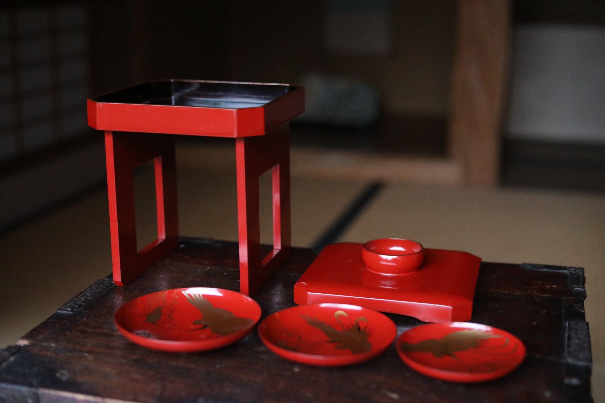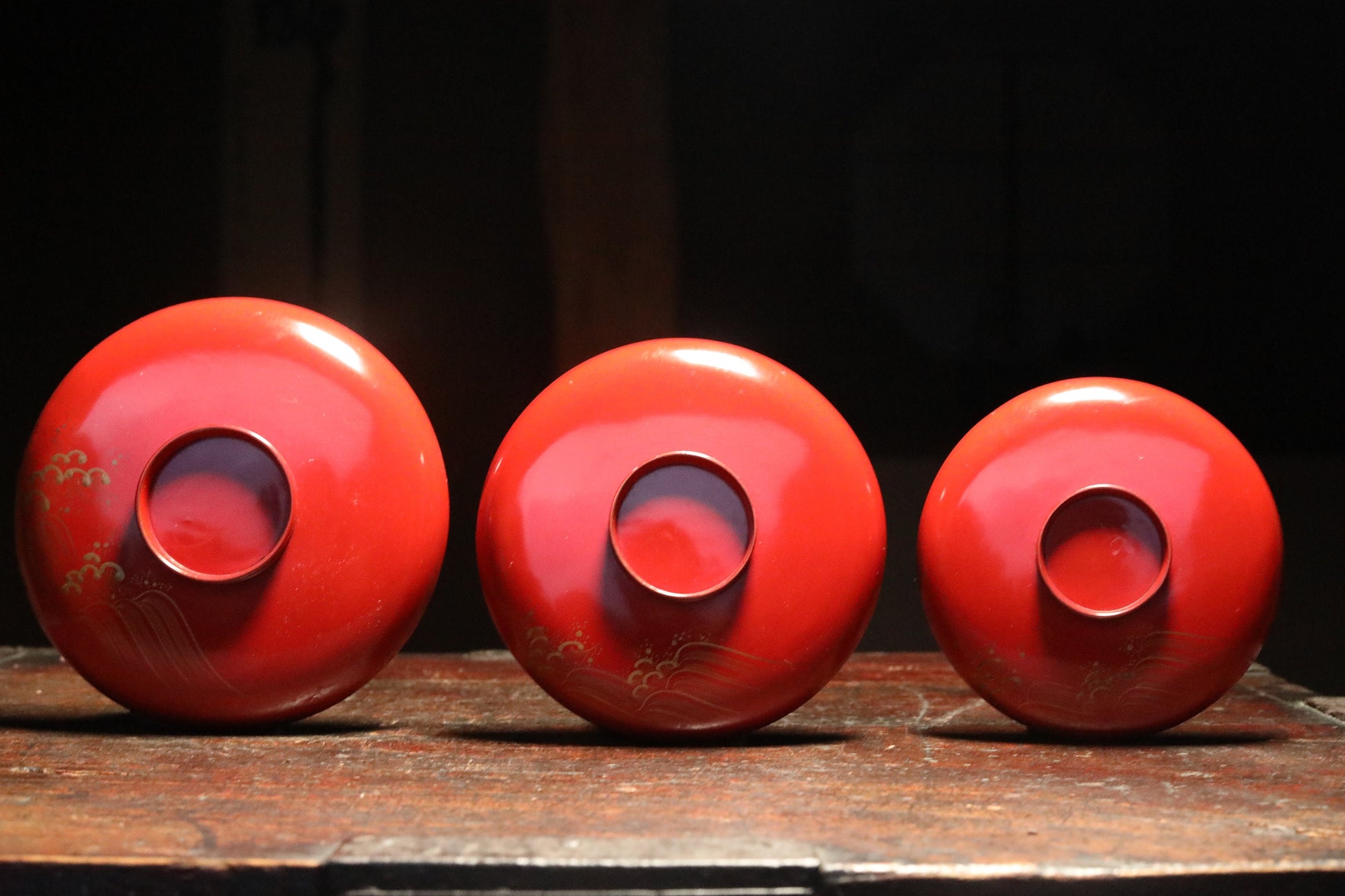 FINE! Set of 3 red gold lacquer MAKIE wooden sake cups with bards crane and turtles, Japanese Antique 1916s sakazuki urushi 4.9in/12.5cm