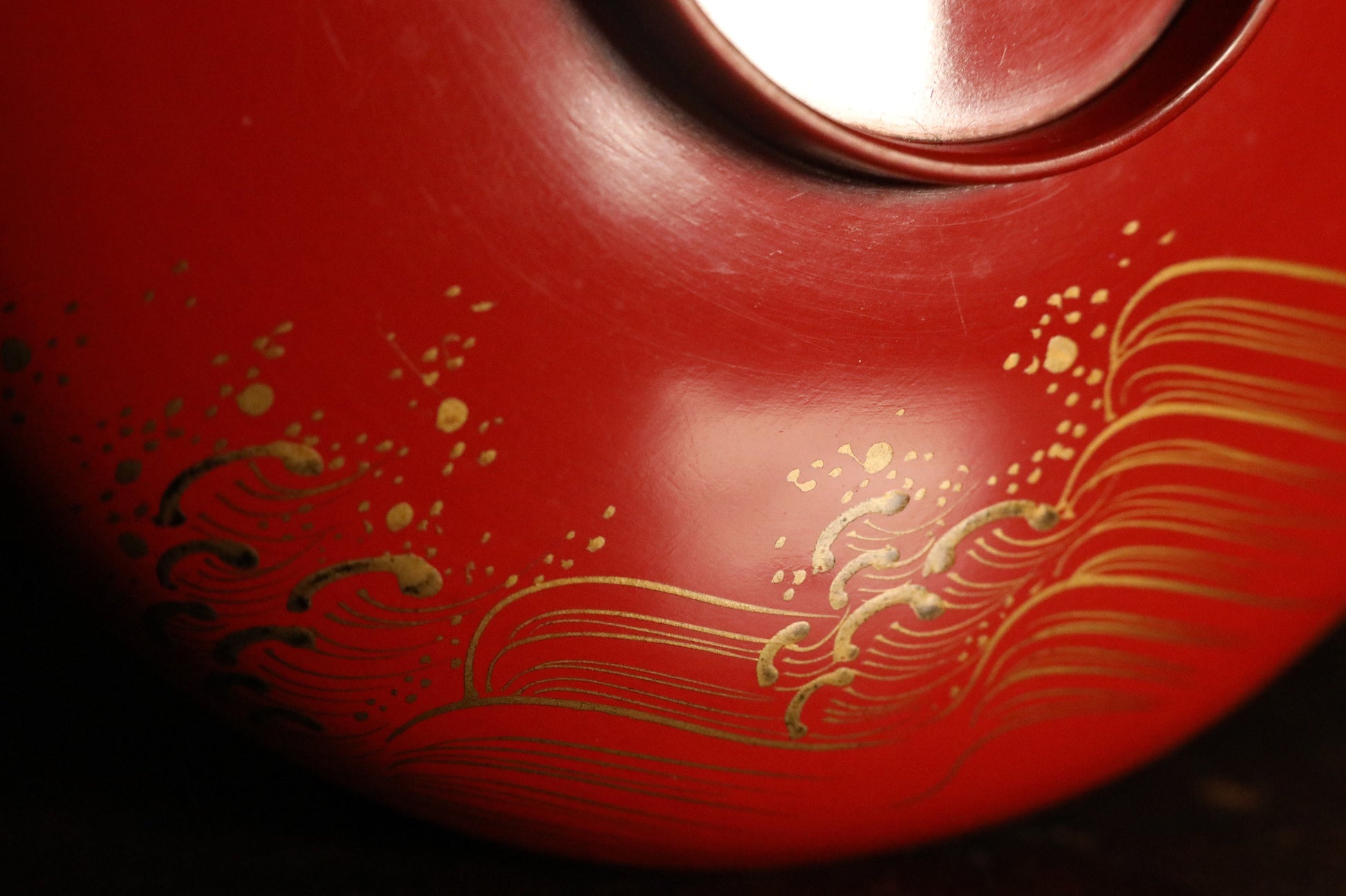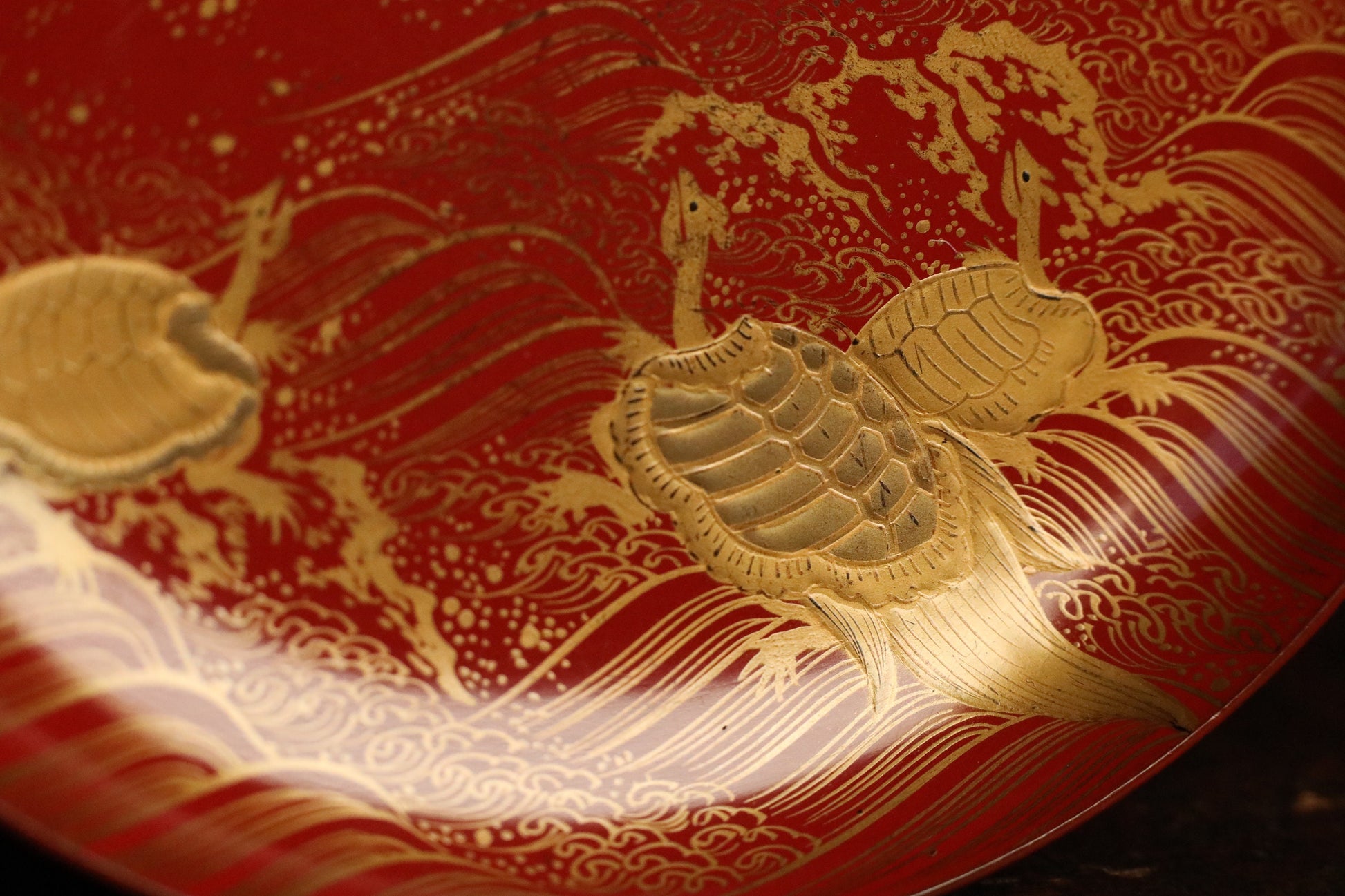 This sake cup is decorated with cranes, turtles, and waves using a lacquer technique called 蒔絵maki-e.