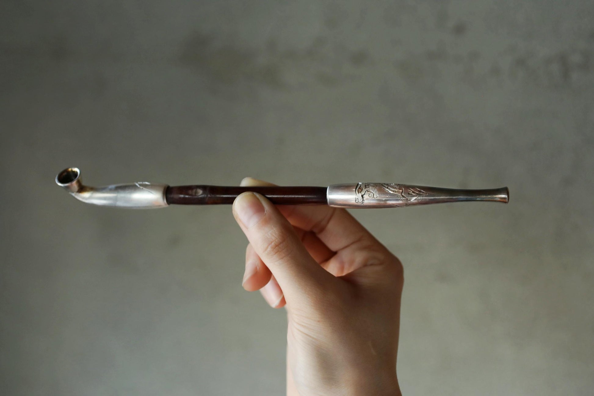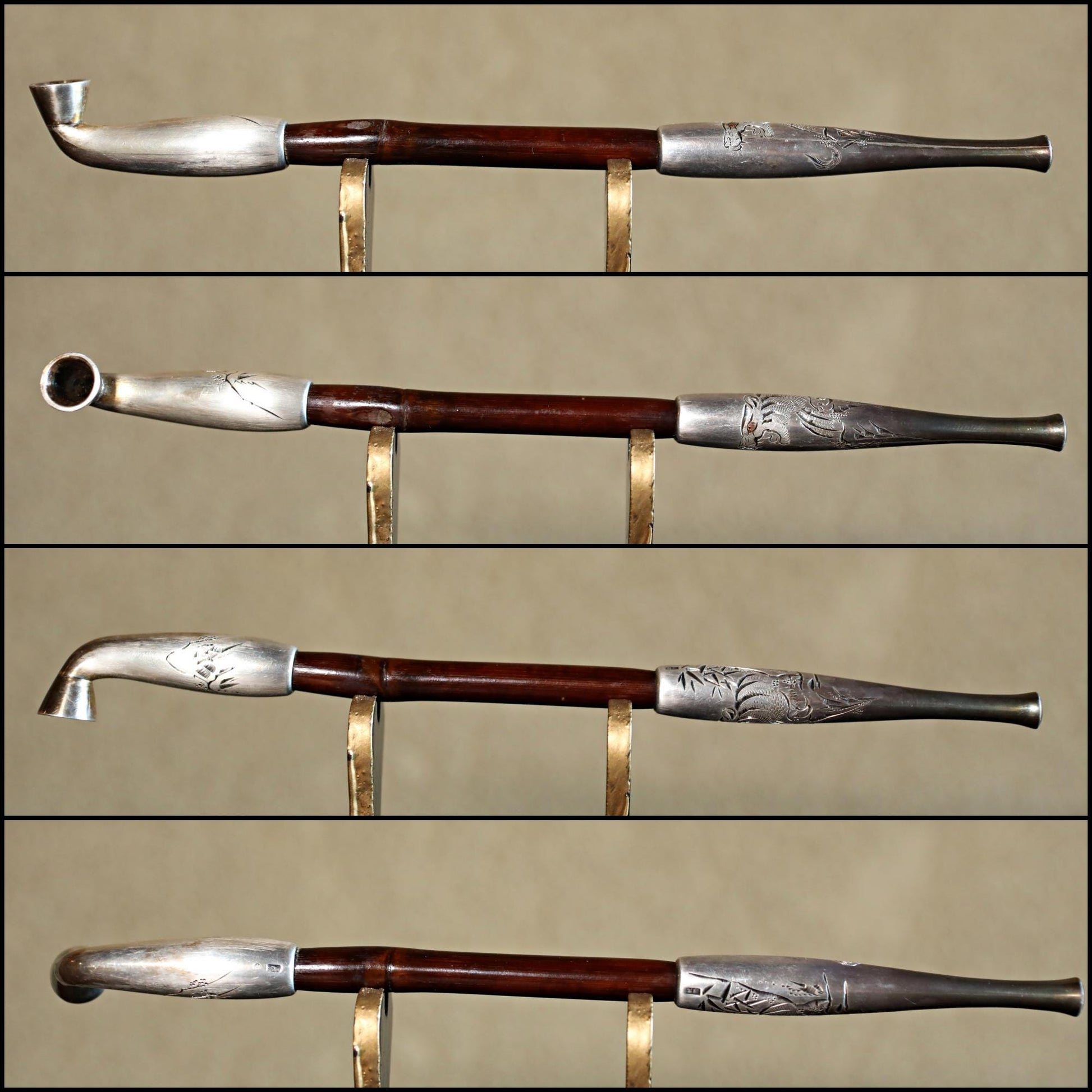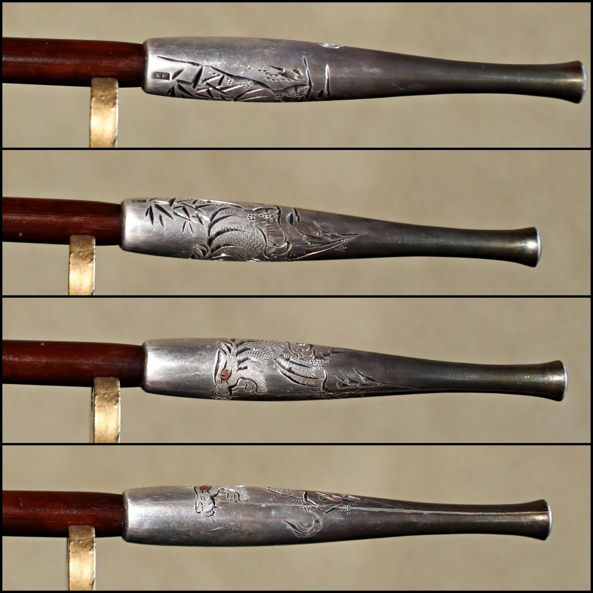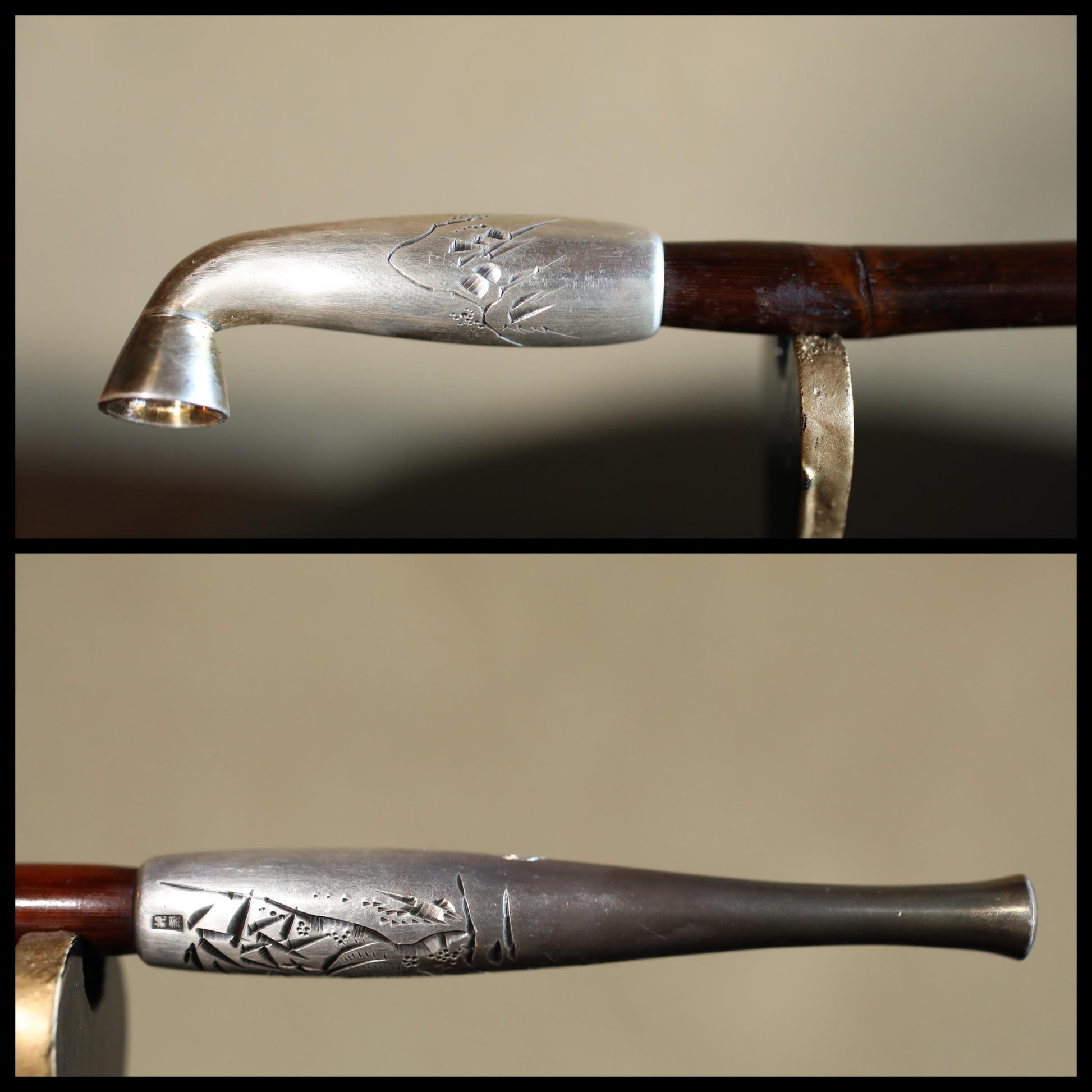 In Japan, the part to fill with tobacco is called 雁首GAN-KUBI (gooseneck). The other side, called "吸い口SUI-KUCHI"(mouthpiece), is made of sterling silver. It is stamped "純銀sterling silver" in kanji characters. Engraved on the silver are a bamboo and a 虎TORA tiger. The tiger is very cool. In Japan, the combination of bamboo and tiger is an example of good luck. There is an old Japanese proverb that says, "Peony and lion, bamboo and tiger. The meaning of this saying is a metaphor for a picturesque combination of things.
