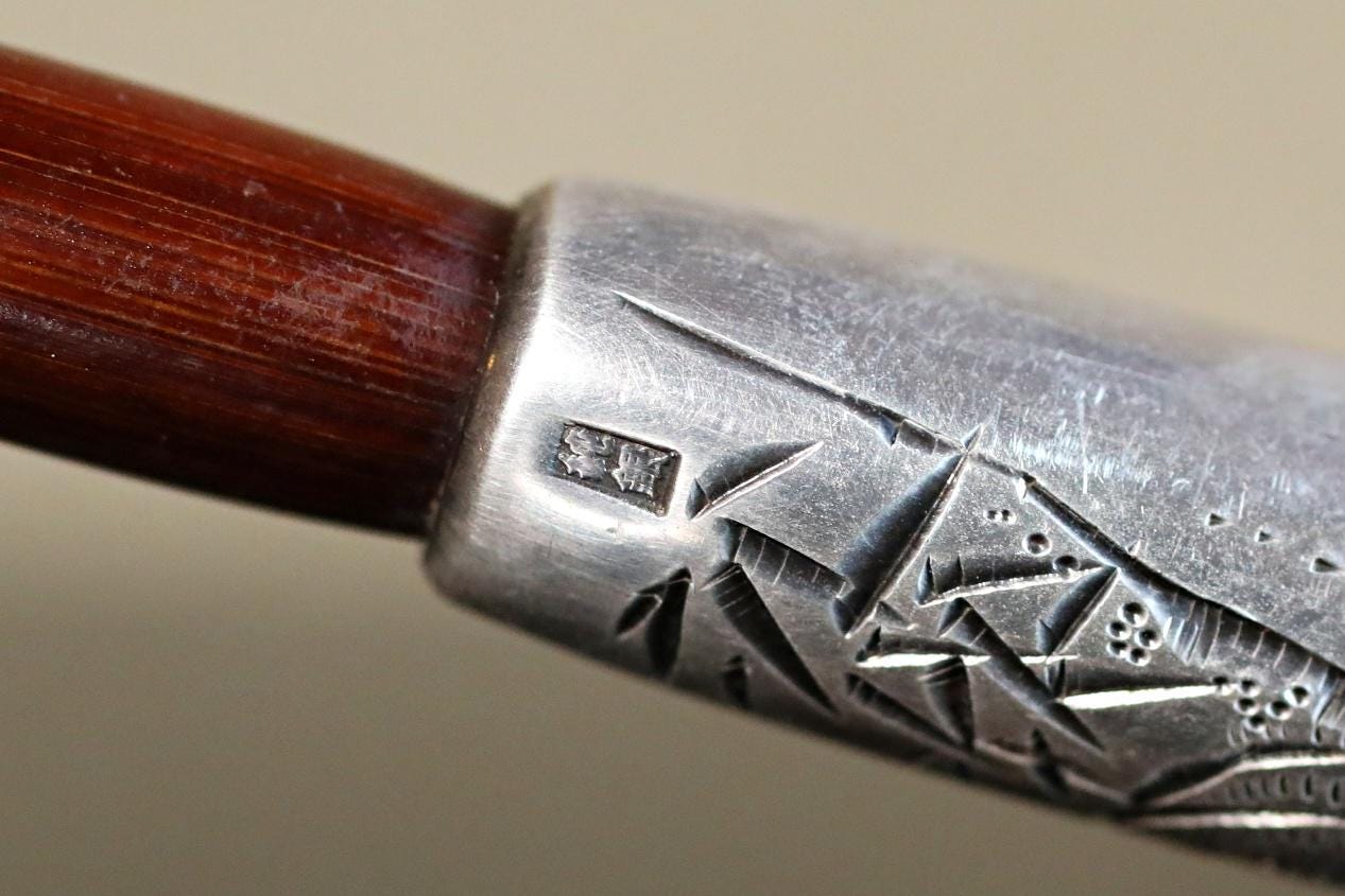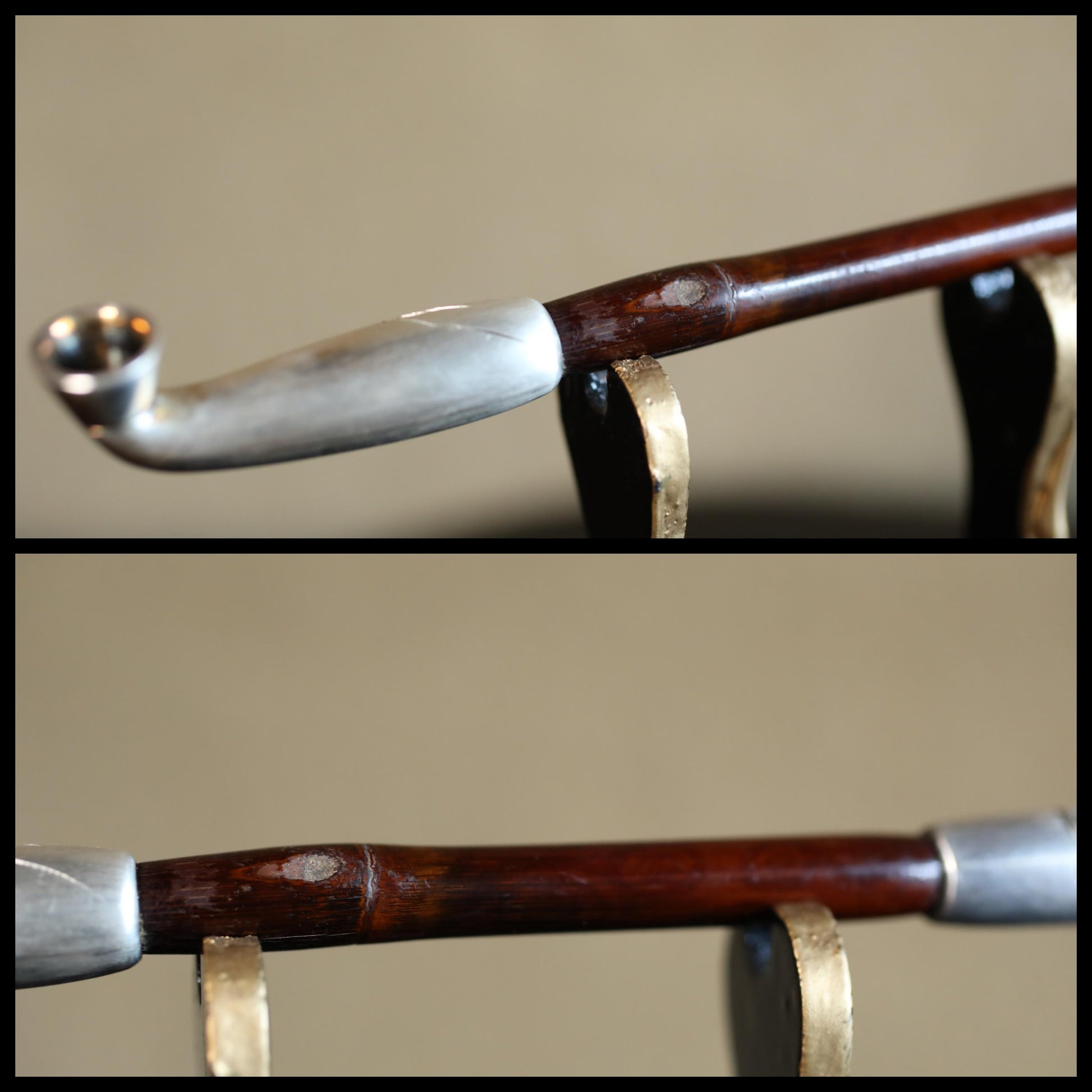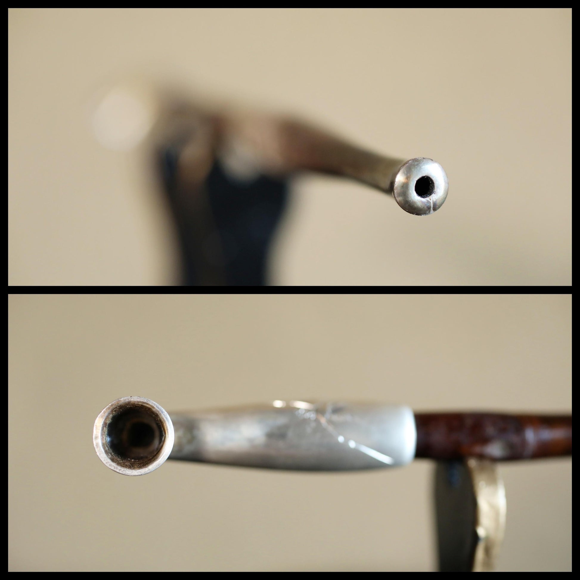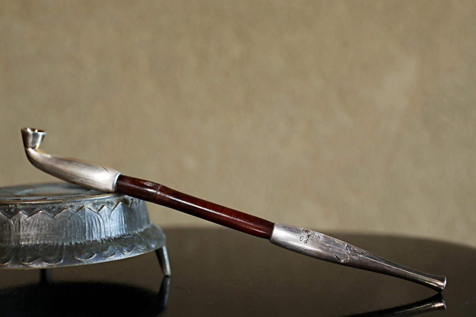 In Japan, the part to fill with tobacco is called 雁首GAN-KUBI (gooseneck). The other side, called "吸い口SUI-KUCHI"(mouthpiece), is made of sterling silver. It is stamped "純銀sterling silver" in kanji characters. Engraved on the silver are a bamboo and a 虎TORA tiger. The tiger is very cool. In Japan, the combination of bamboo and tiger is an example of good luck. There is an old Japanese proverb that says, "Peony and lion, bamboo and tiger. The meaning of this saying is a metaphor for a picturesque combination of things.