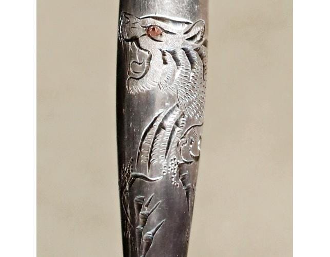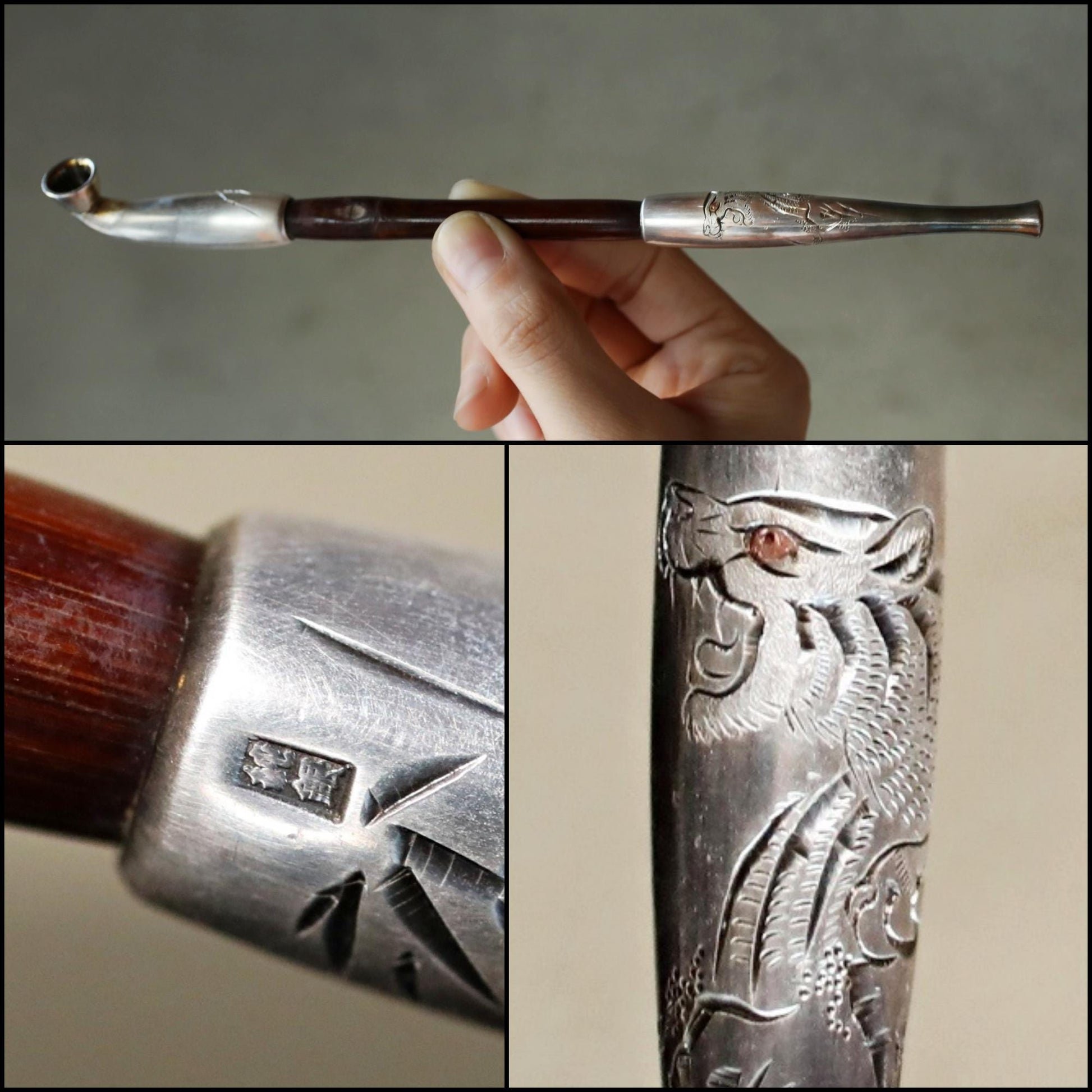 FINE! SILVER! 1910s Japanese antique tobacco smoking pipe Genuine silver kanji with Carved Tiger and Bamboo craft KISERU hand craft.