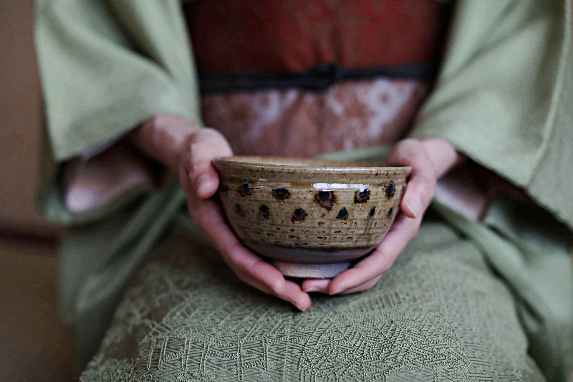 Green tea bowl Japanese vintage CHAWAN KI SETO kiln ware handmade Matcha Cup Tea Ceremony pottery with box signature H2.2×6.3in/5.5×16cm