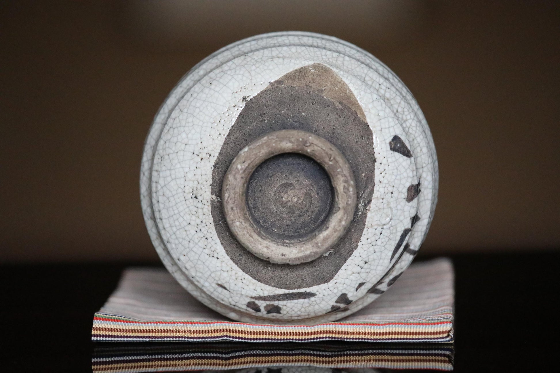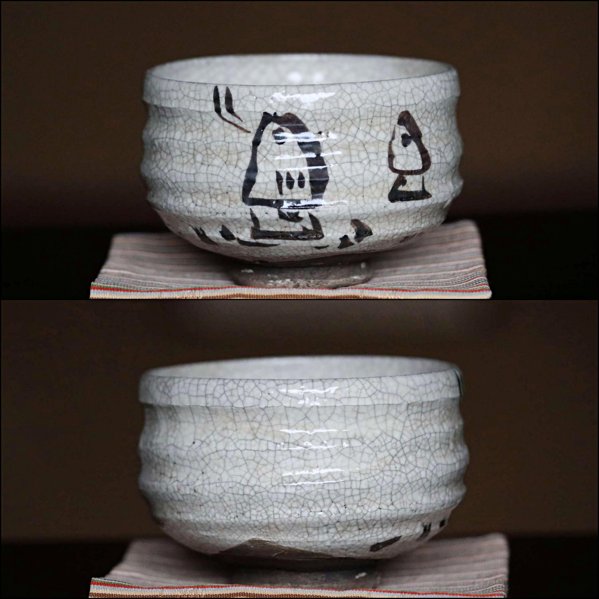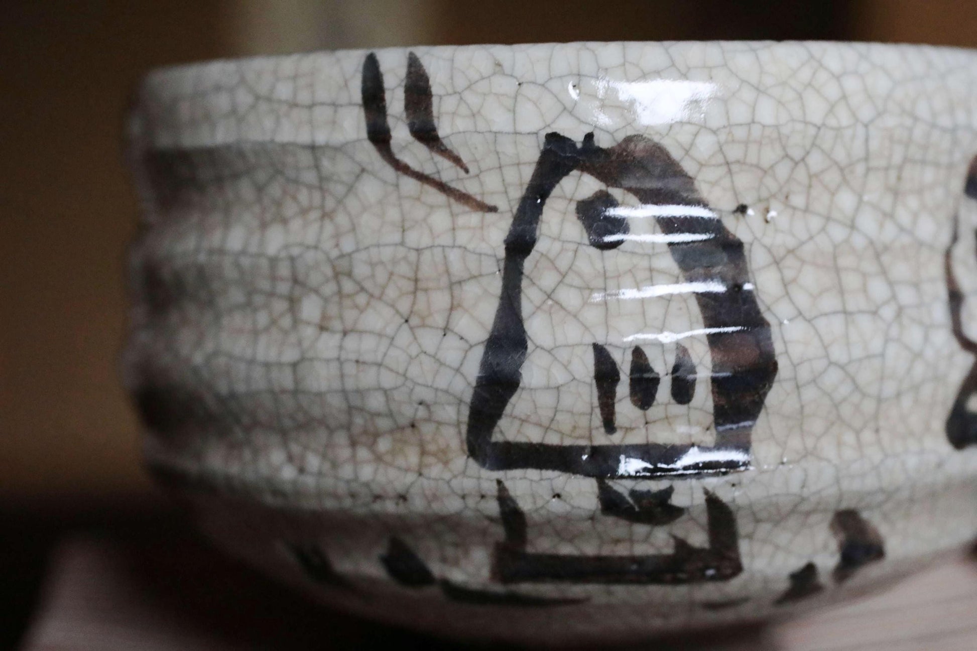 This work is called 志野Shino tea bowl and is said to be the most Japanese-style pottery. This piece is called Shino Tea Bowl and is considered the most Japanese pottery. It has a characteristic white glaze and fine cracks. The design, which looks like a child's doodle, is unique and is one of the charms of Shino teacups. It looks like an old house.