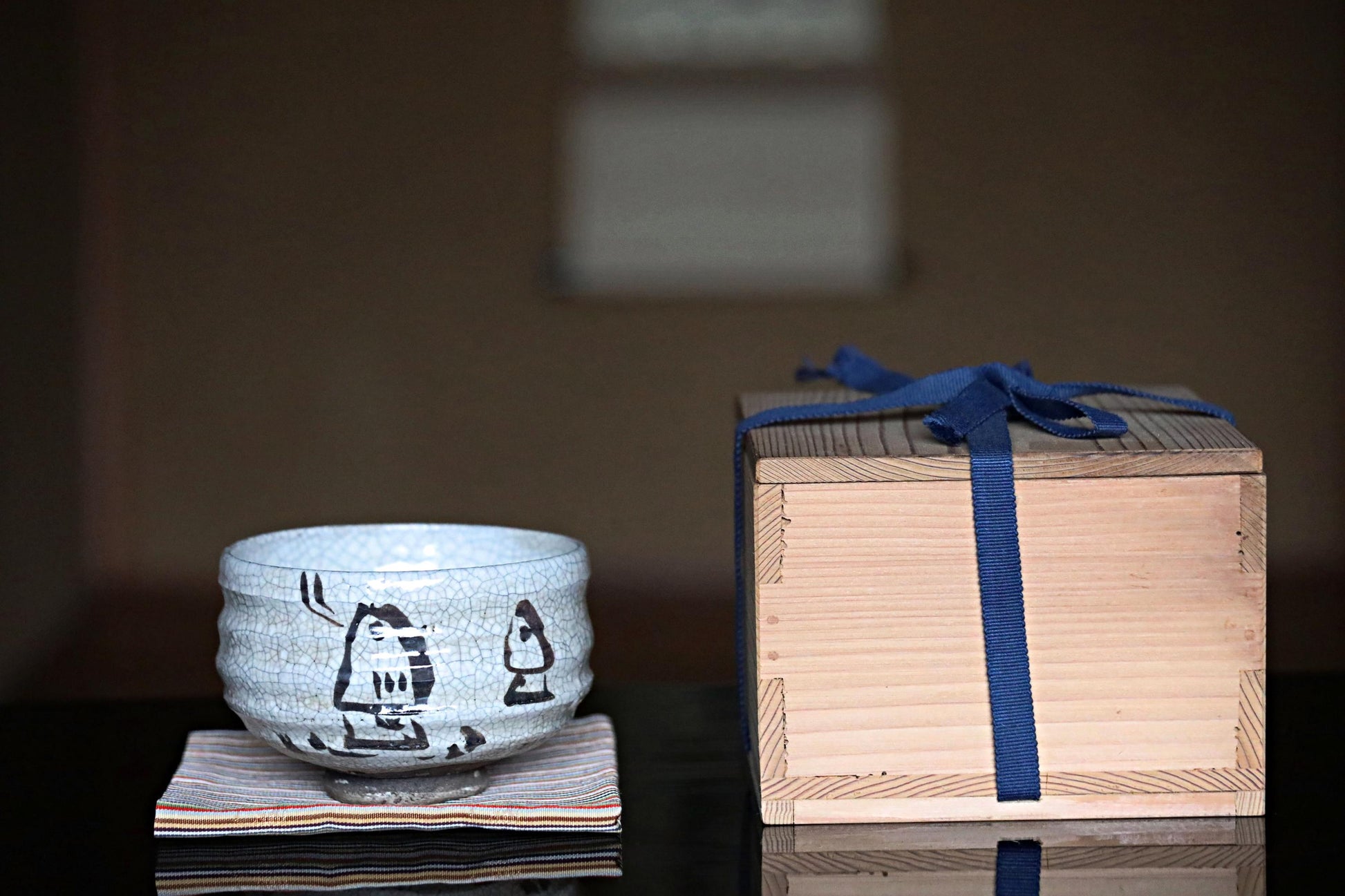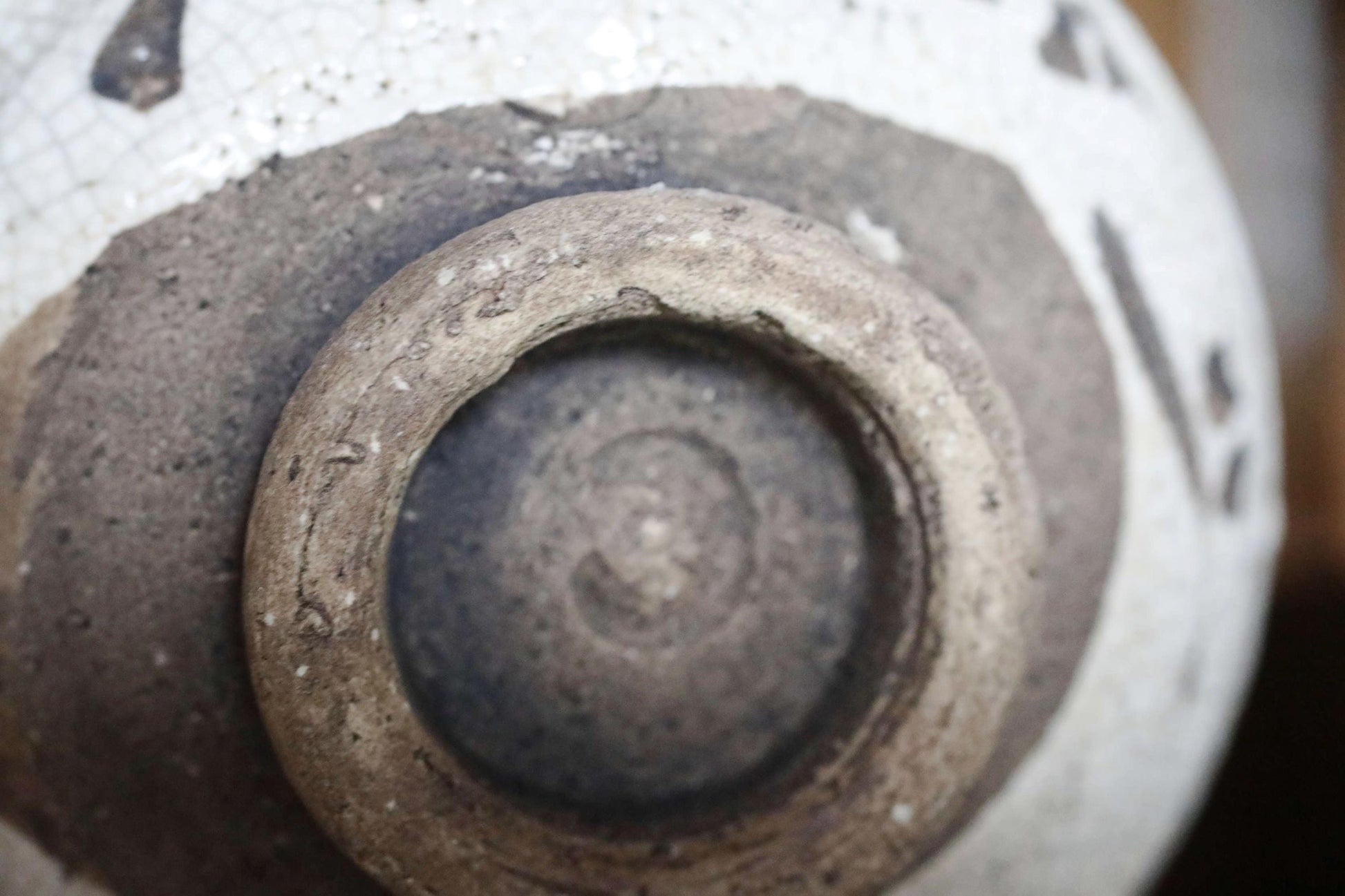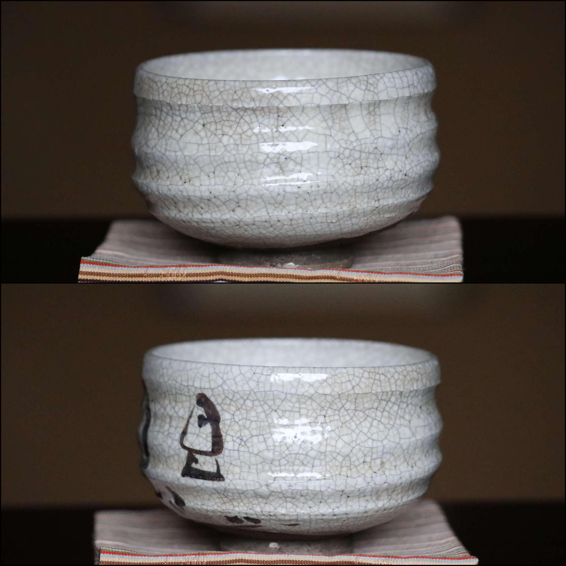 This work is called 志野Shino tea bowl and is said to be the most Japanese-style pottery. This piece is called Shino Tea Bowl and is considered the most Japanese pottery. It has a characteristic white glaze and fine cracks. The design, which looks like a child's doodle, is unique and is one of the charms of Shino teacups. It looks like an old house.