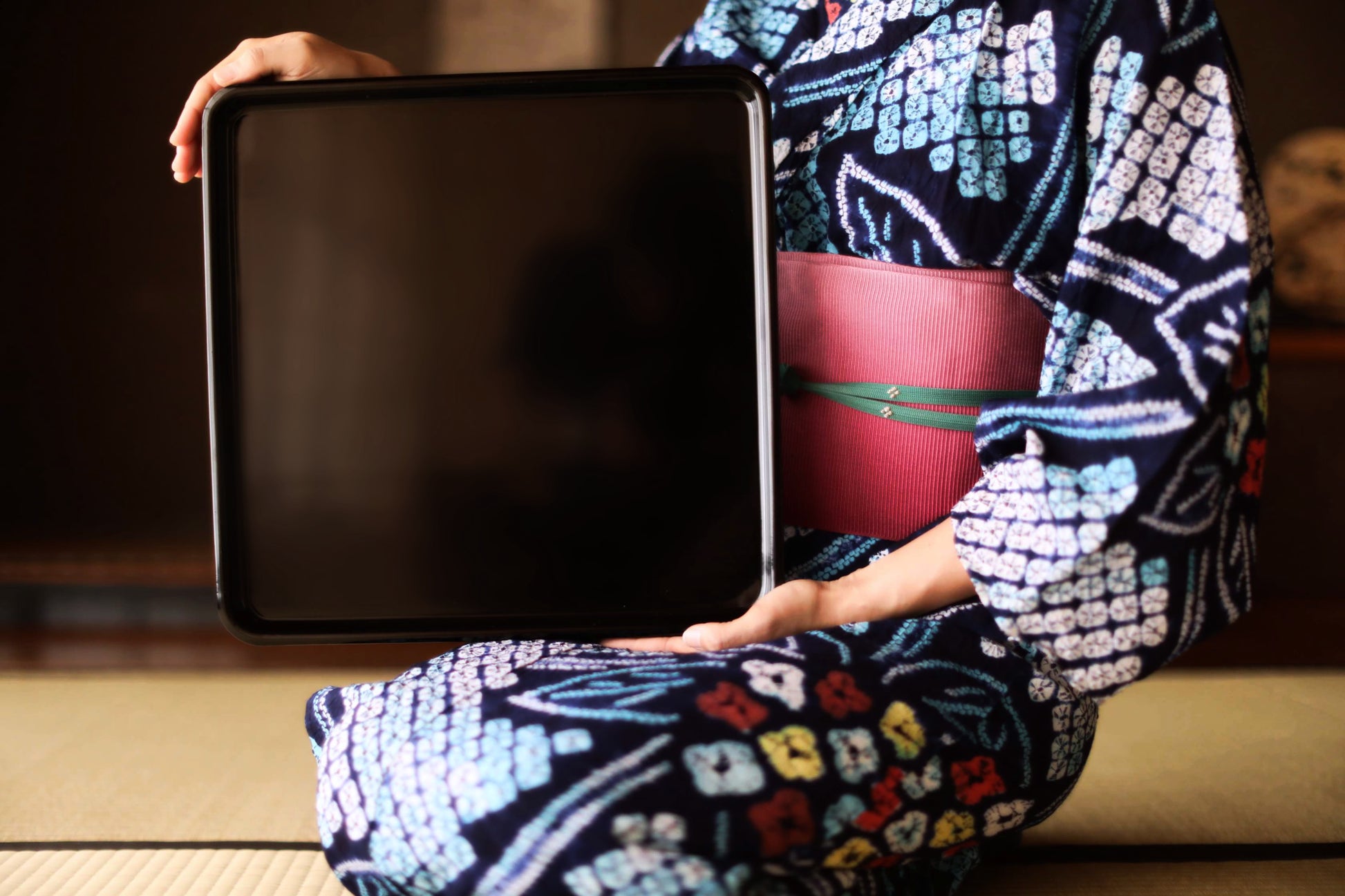 This is called お盆 Obon. It can also be used as a table. お膳 Ozen is used in Japanese cuisine when each dish is served on such a tray. Some types of ozen have legs, but this is a type without legs.