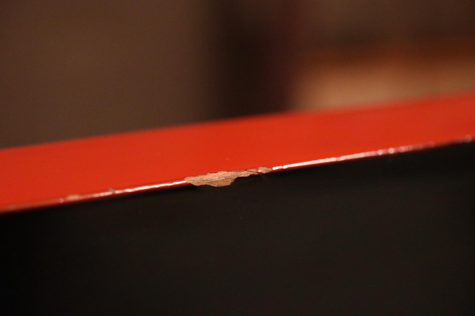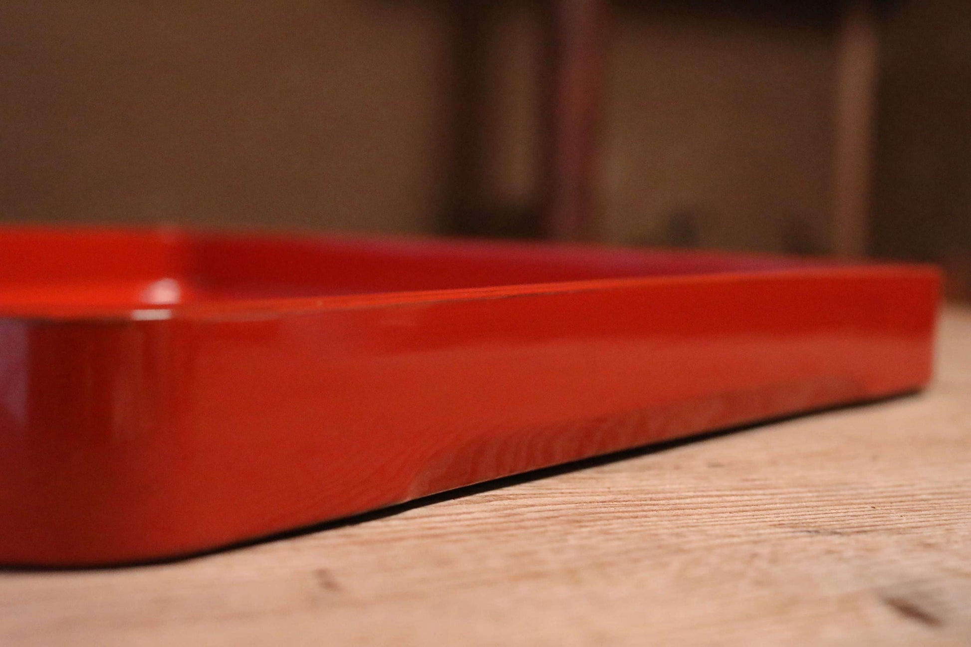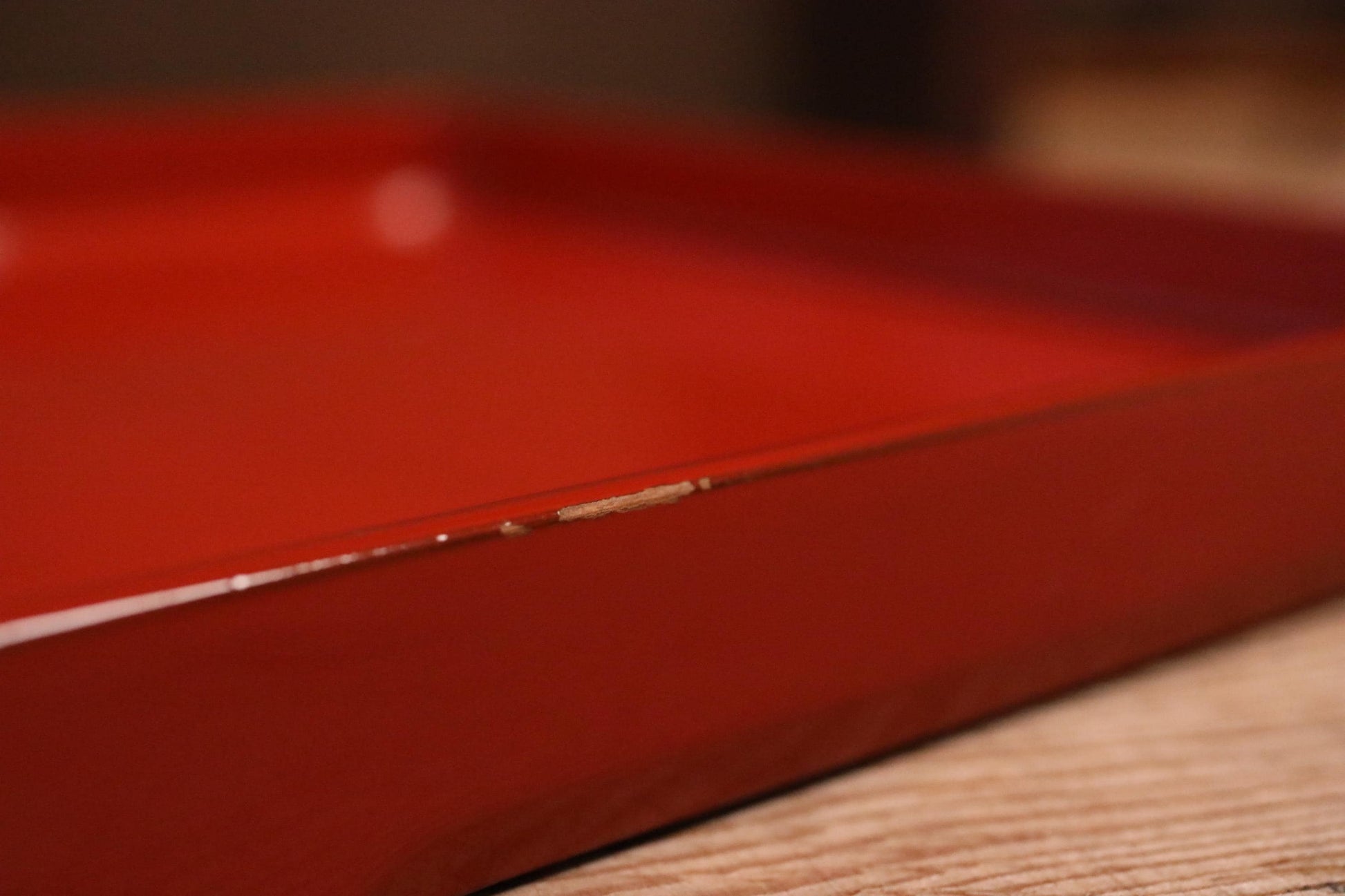 The size is large, and this is a high-class 輪島塗 Wajima-nuri product. The characteristic of Wajima-nuri is that the lacquer is applied very thickly, so it is painted over and over again, which makes it very durable and time-consuming. If you look closely, you can see that the bottom of the side side is slightly carved to make it easier to hold. This kind of casual effort is also an expression of the Japanese sense of beauty.
