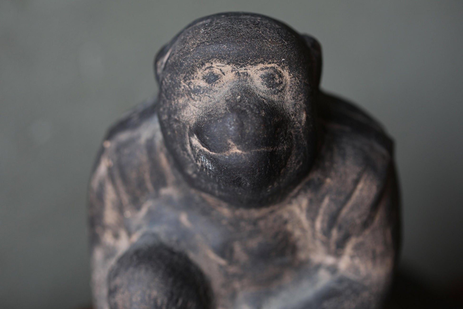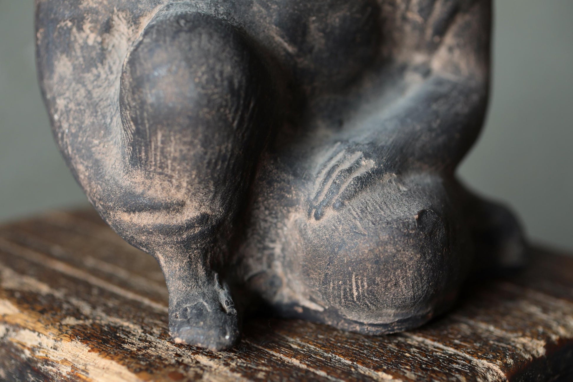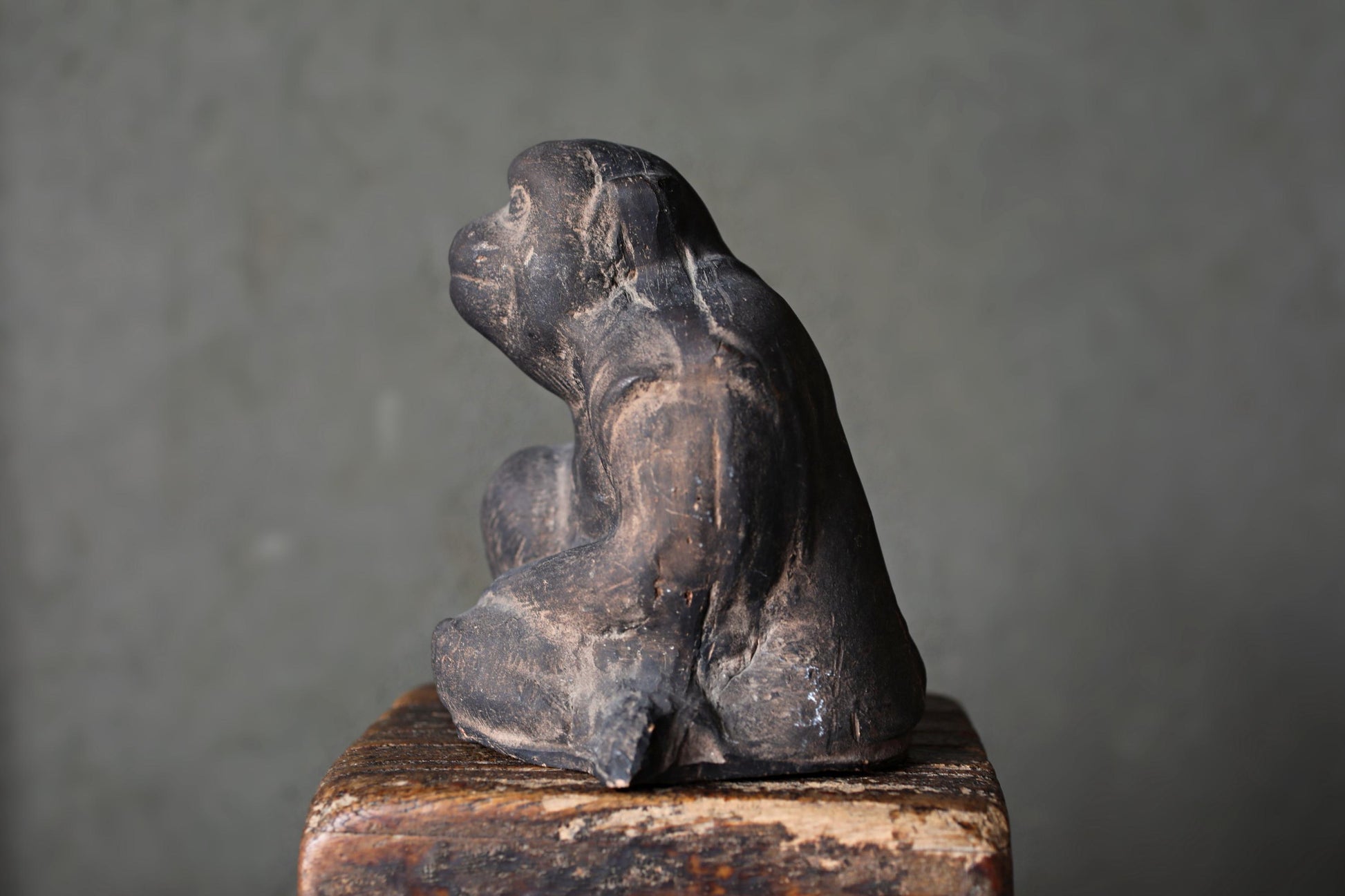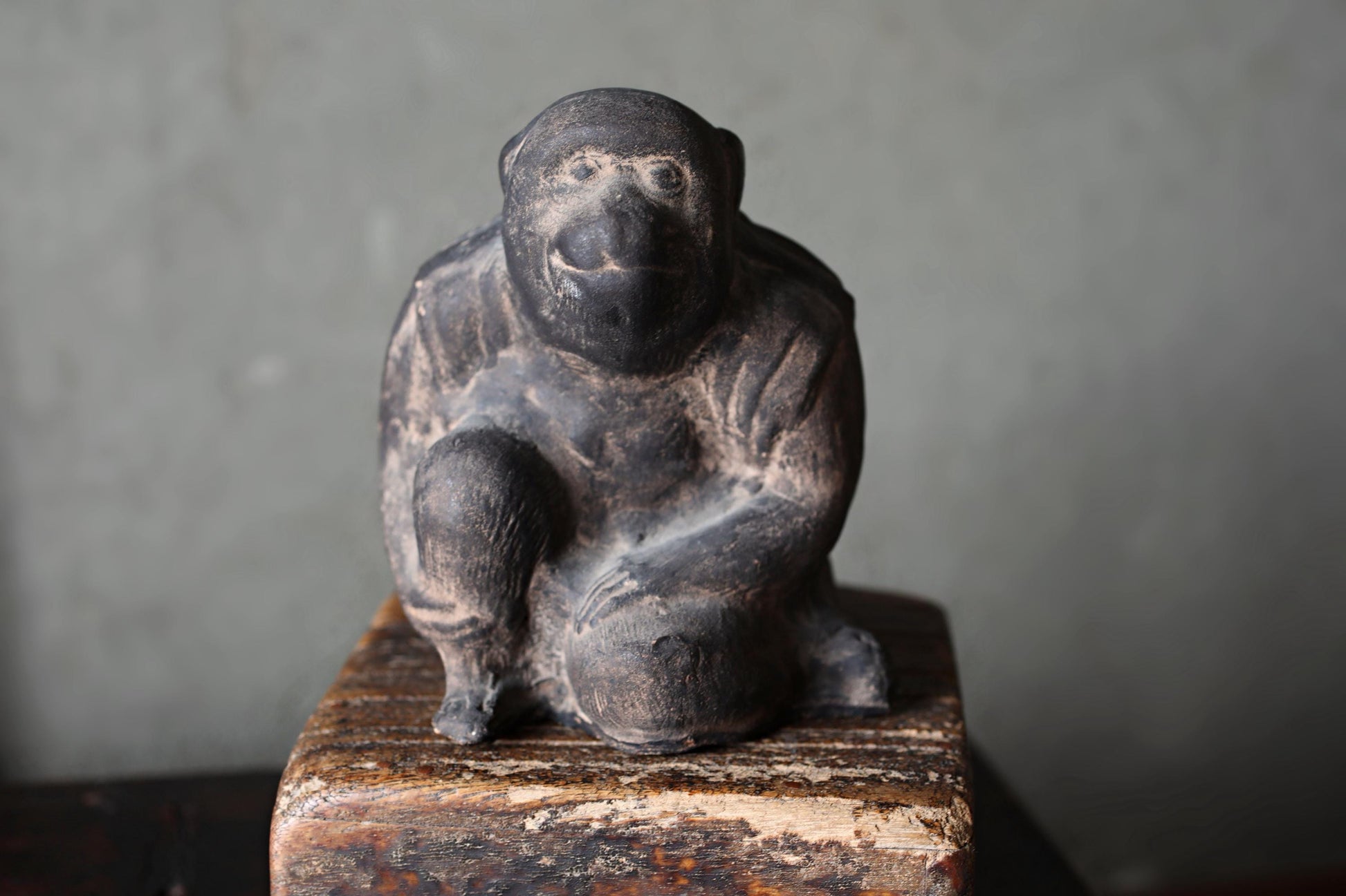 Japanese antique 1700s clay figurine Sitting and smiling Monkey doll statue animal ornament pottery statue hand craft H6.5in/H16.5cm