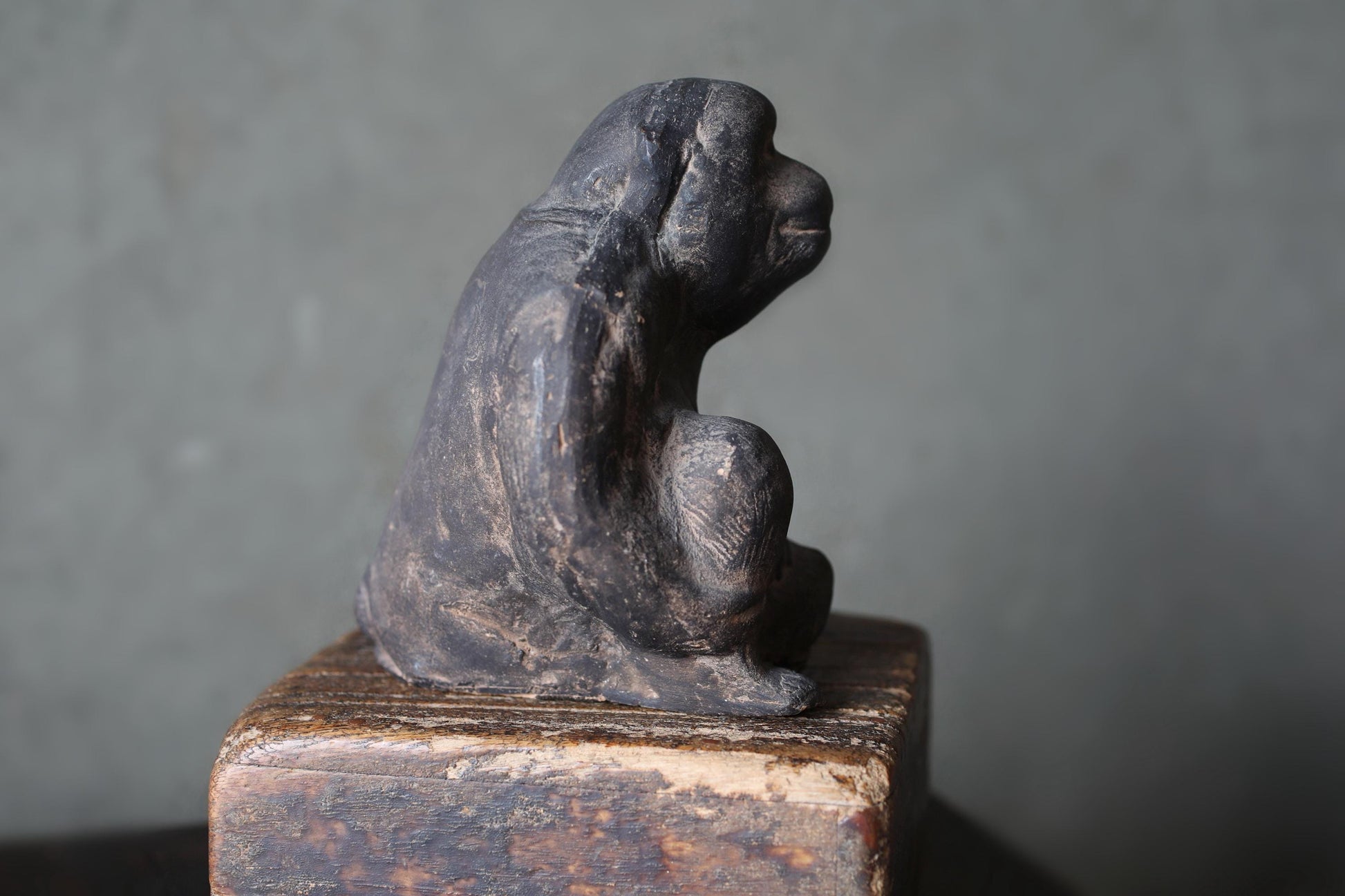 This is a clay figure of a monkey made in the mid-Edo period. This is called 土人形Tsuchi-ningyo (a clay doll).