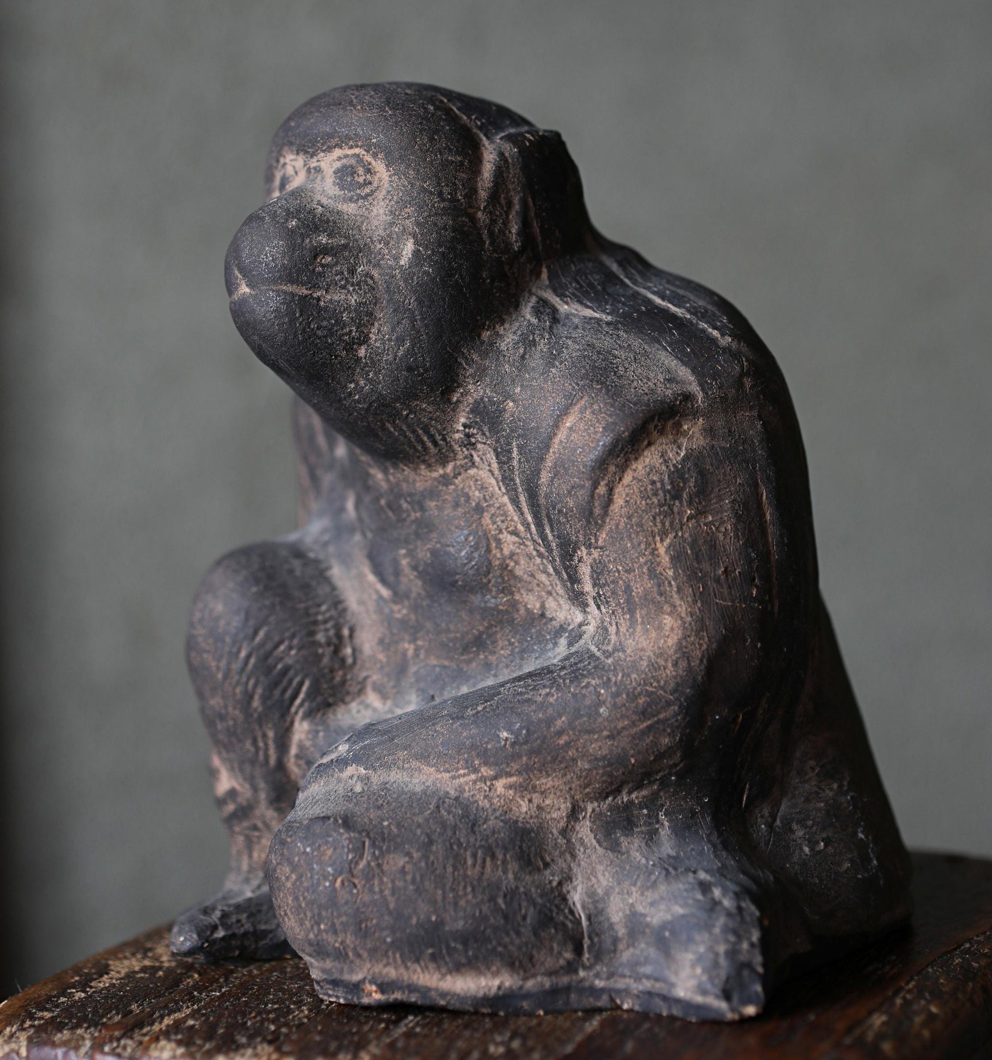 Japanese antique 1700s clay figurine Sitting and smiling Monkey doll statue animal ornament pottery statue hand craft H6.5in/H16.5cm.