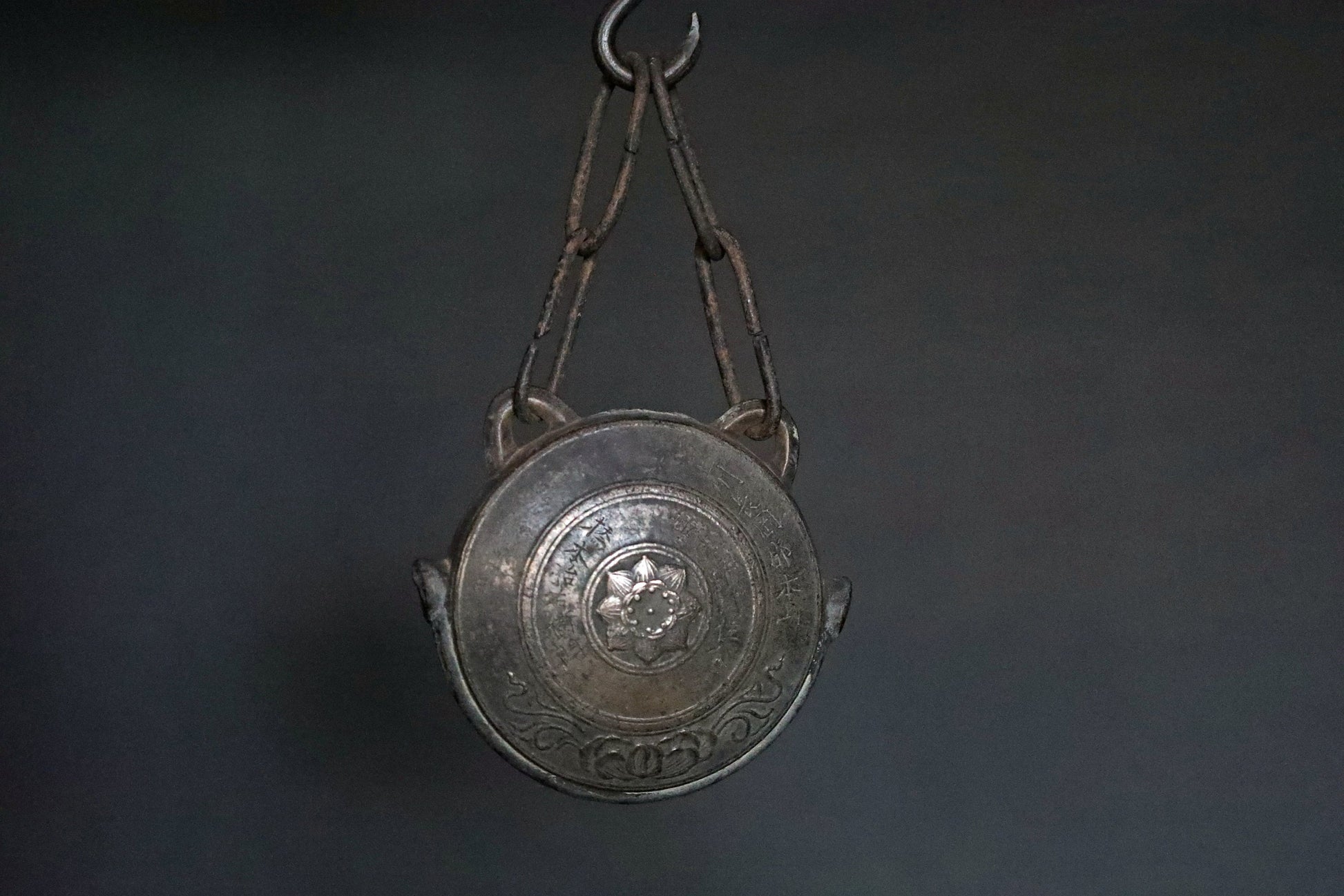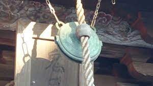 This shaped bronze gong is called as 鰐口"wanikuchi" meaning crocodile's mouth since its chasm looks like reptile's mouth seeing from the side. Wanikuchi is hanged at the entrance of temples with a rope and wood ball to hit and make sound. Though this is one of instrument, many temples regard it as decorations because it does not sound loud nor clear