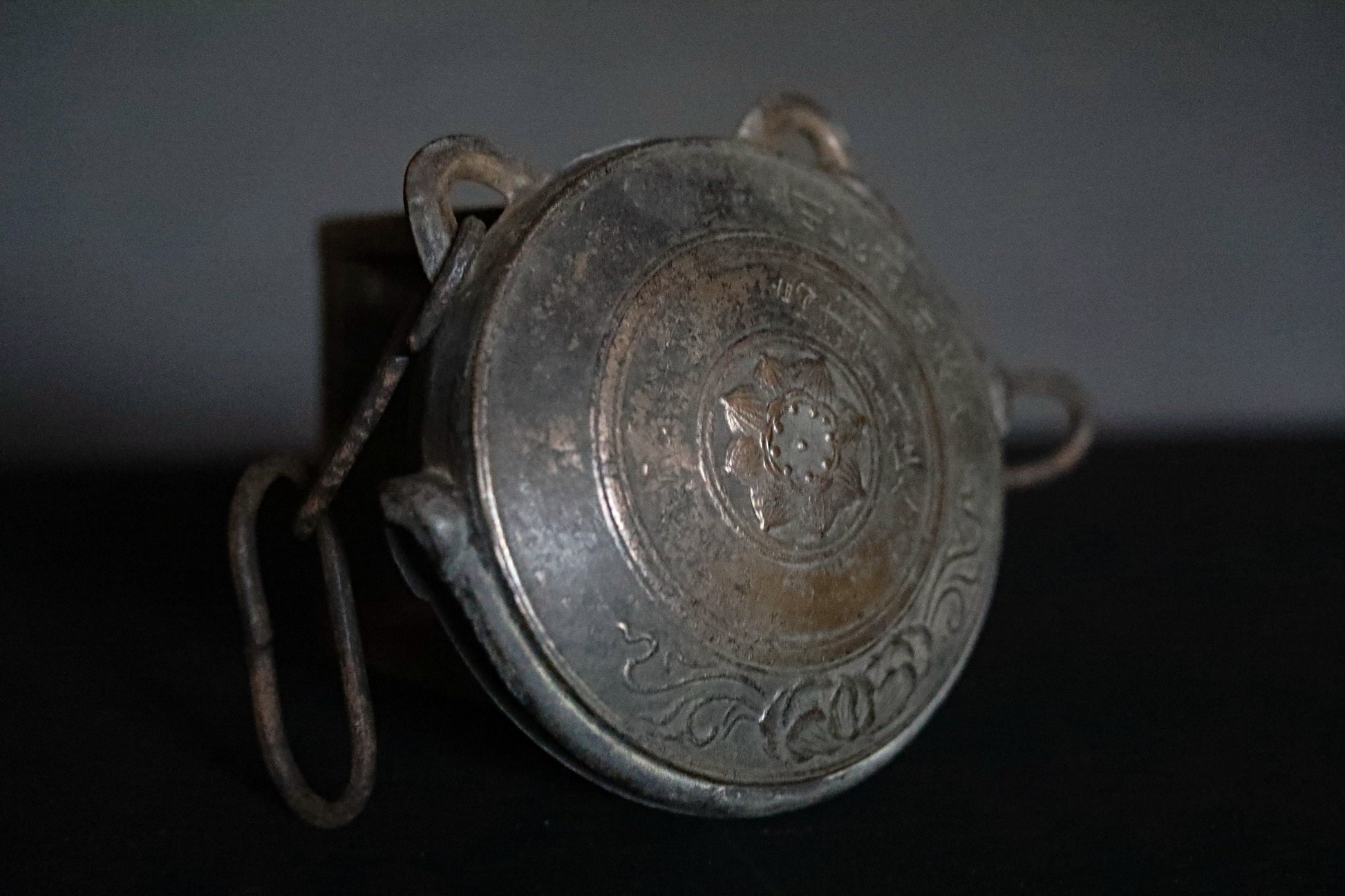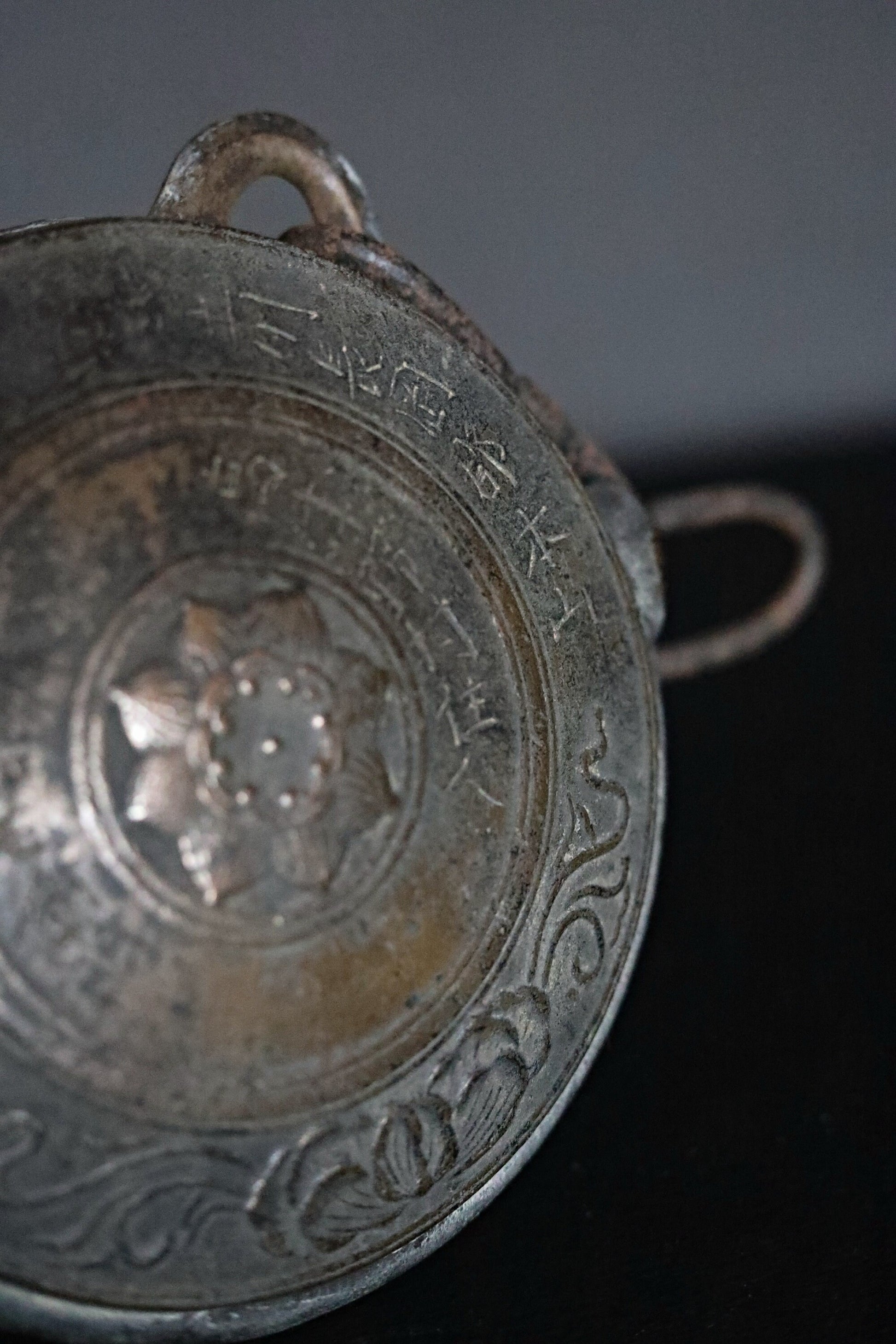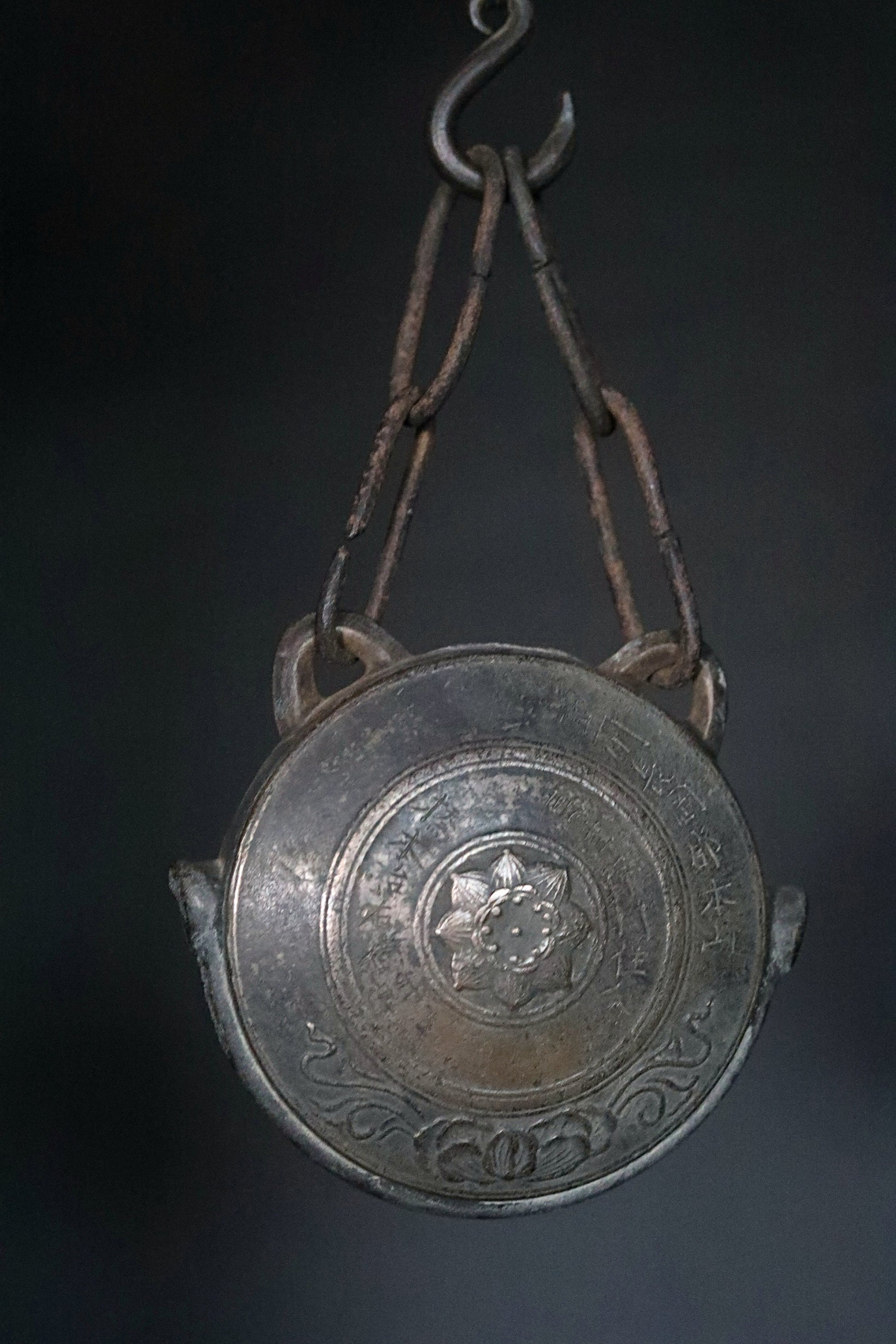 Japanese antique 1700s EDO "wanikuchi" bronze temple gong, buddhist altar with lotus Kanji signature lost wax craft W6.5in/W16.5cm