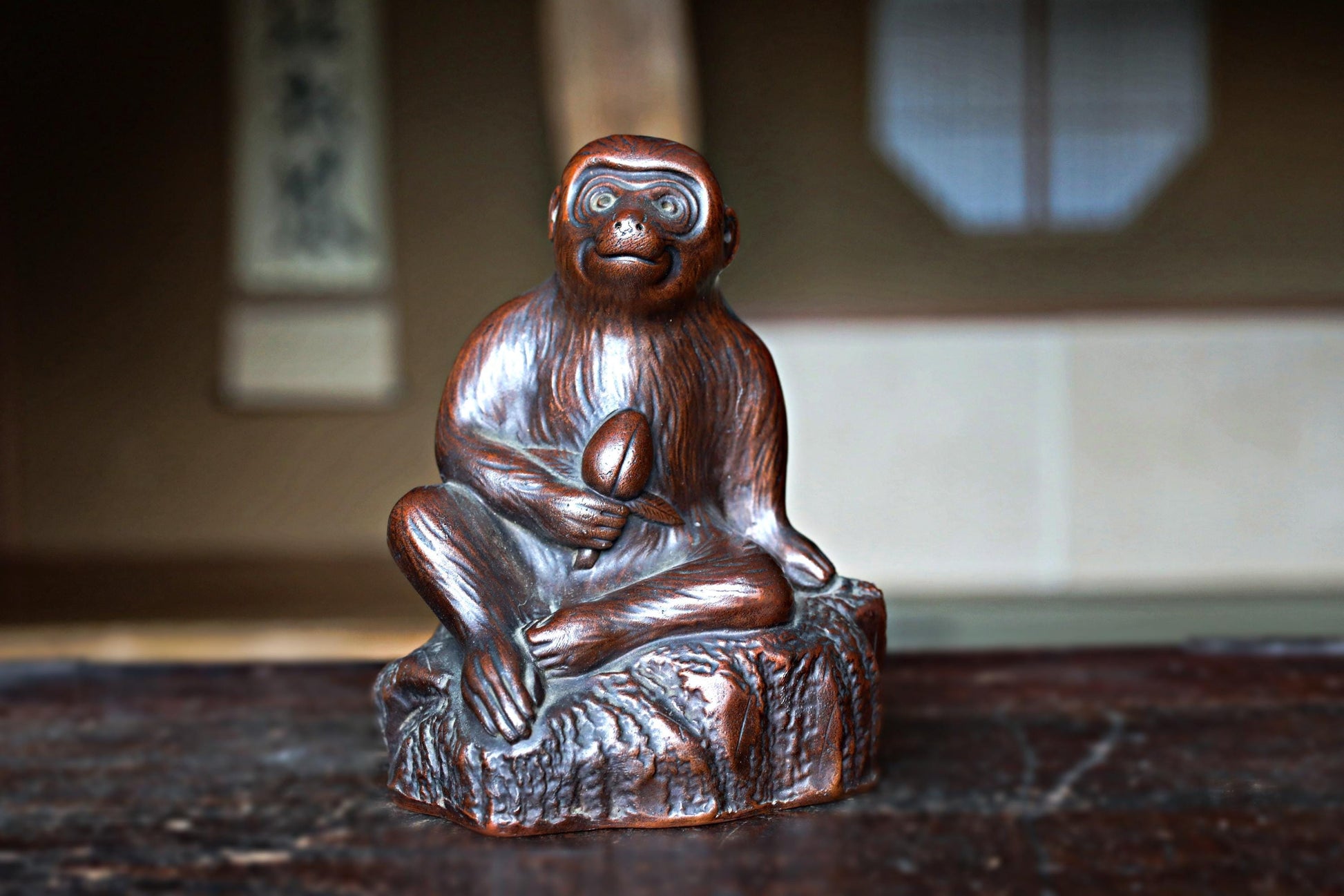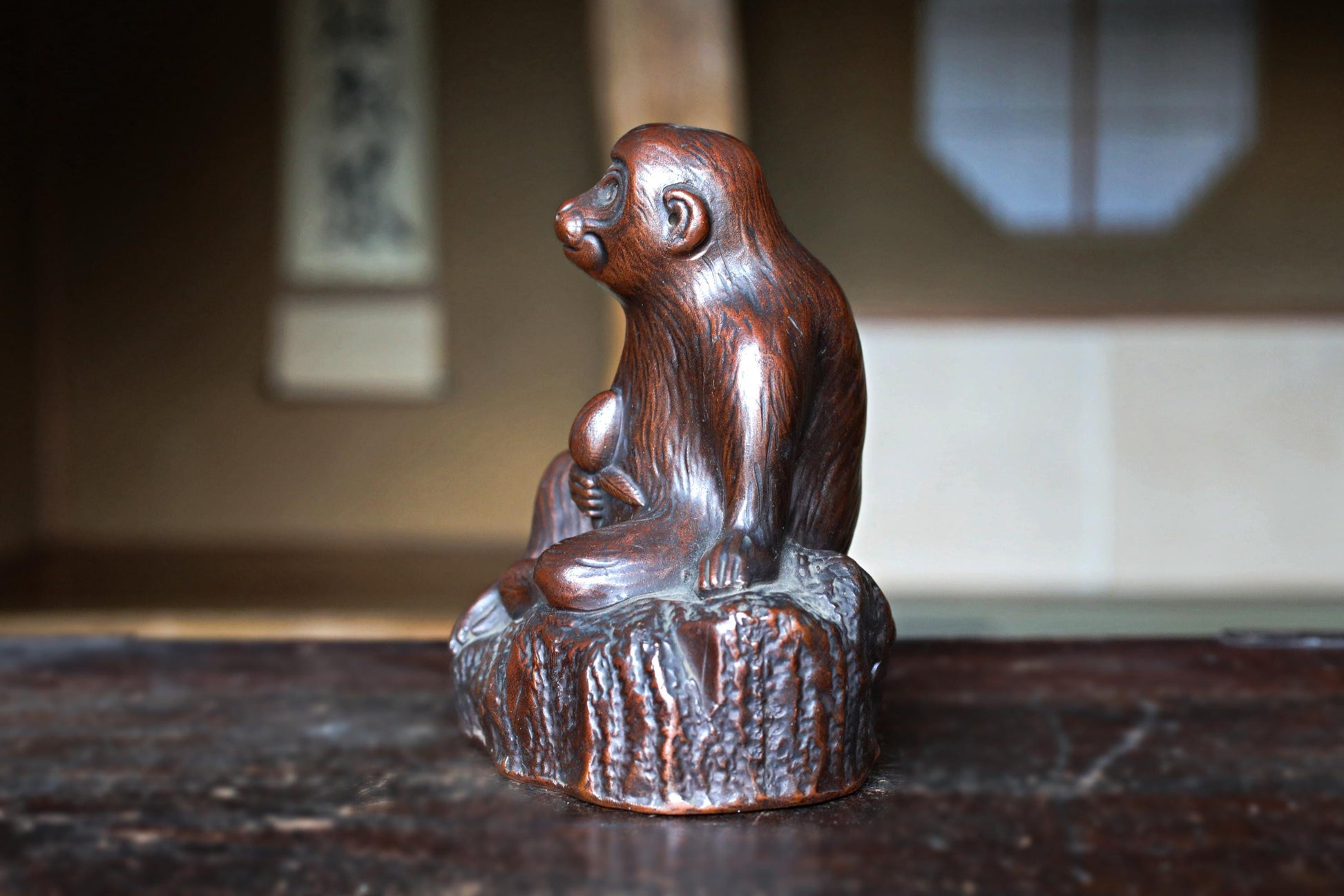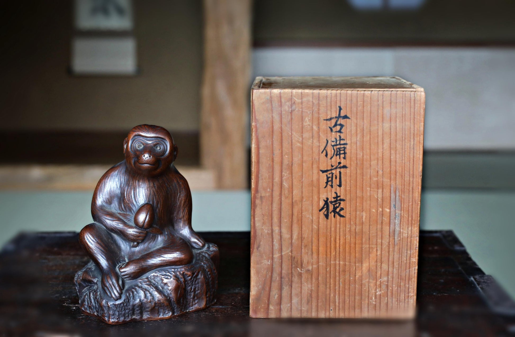 This is an old 備前 Bizen ware monkey figurine. The figure is humorous as it dances a The monkey is looking up with a cute face and holding a peach in his hand. A signature is engraved on the side of the rock, but it is unique because it is integrated with the rock.