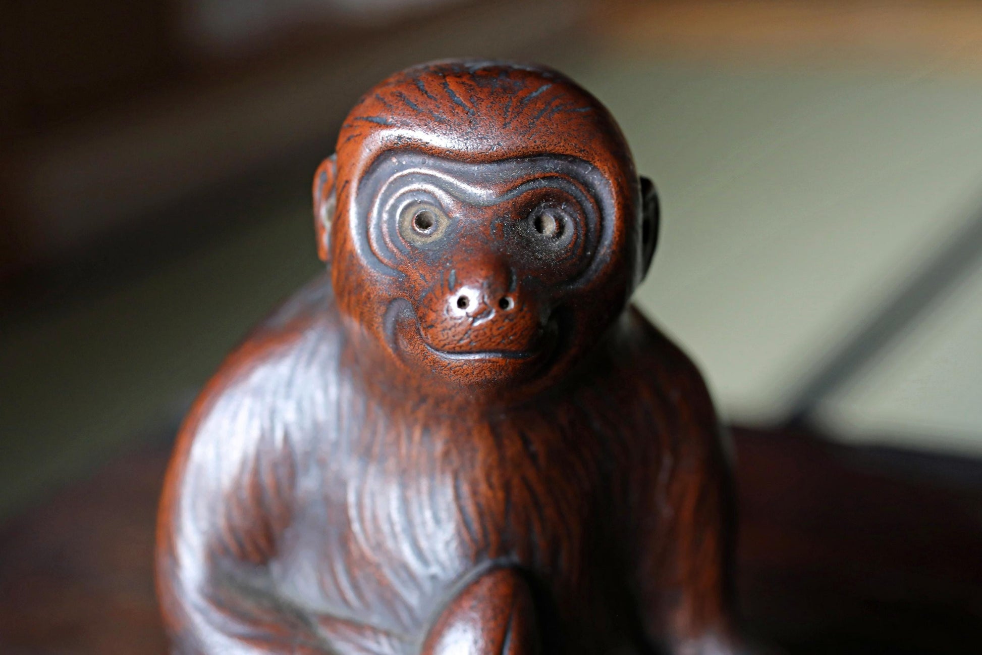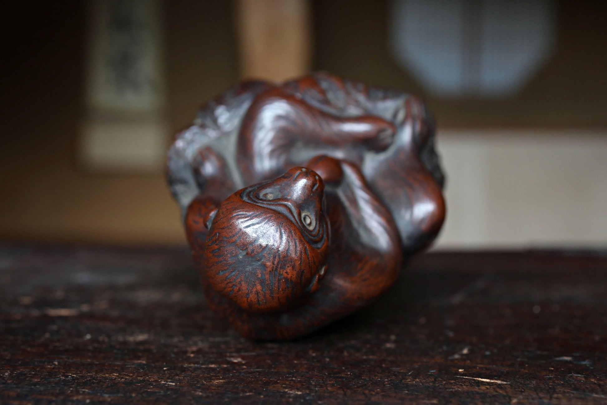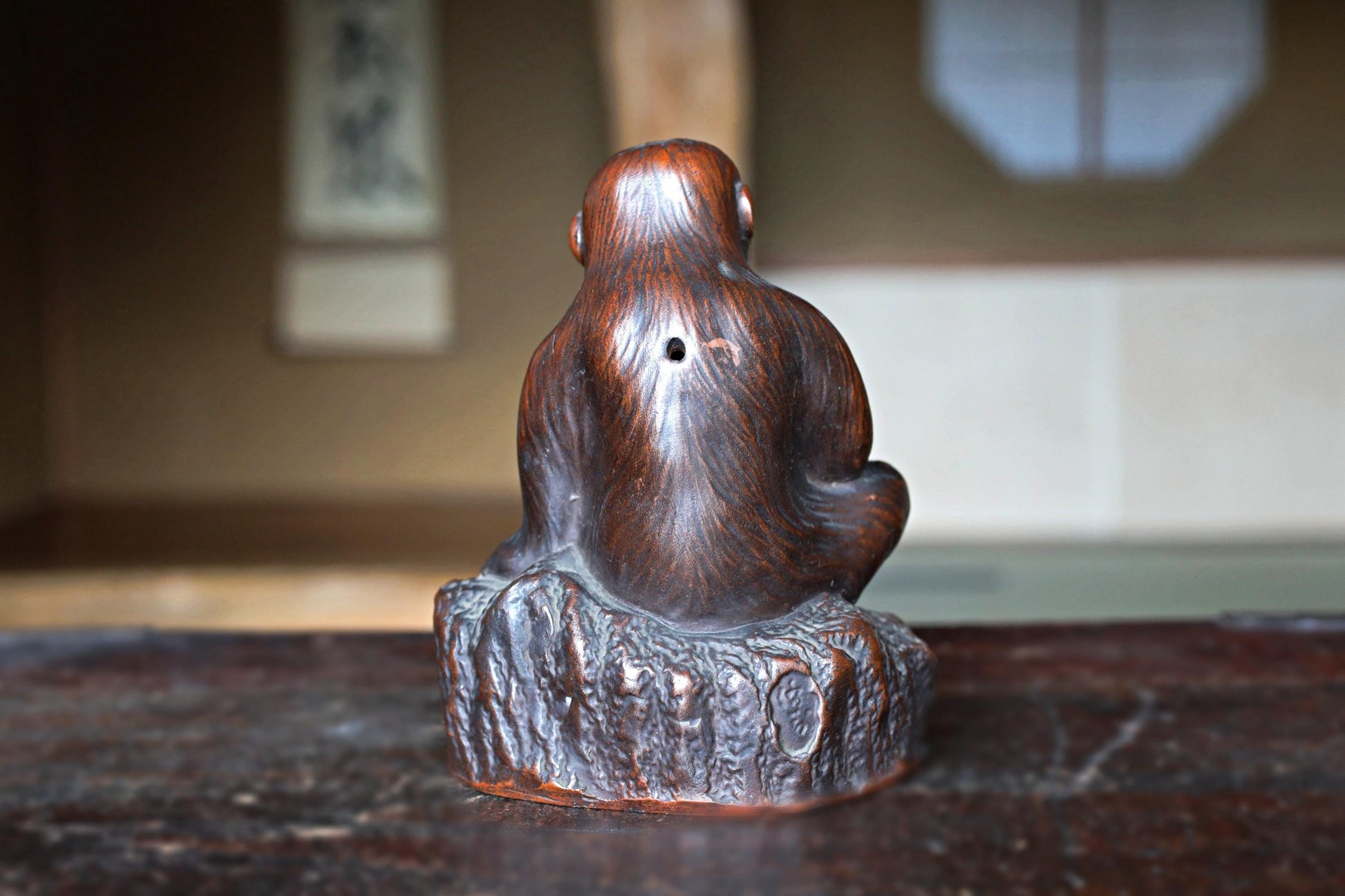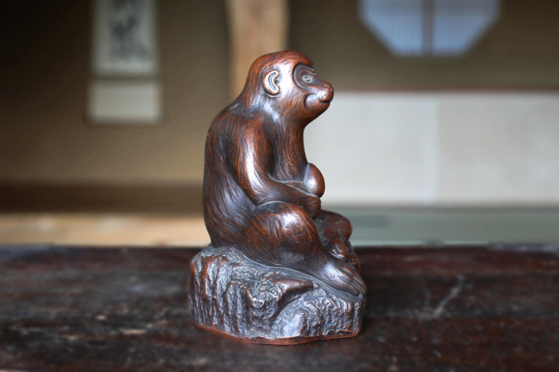 This is an old 備前 Bizen ware monkey figurine. The figure is humorous as it dances a The monkey is looking up with a cute face and holding a peach in his hand. A signature is engraved on the side of the rock, but it is unique because it is integrated with the rock.