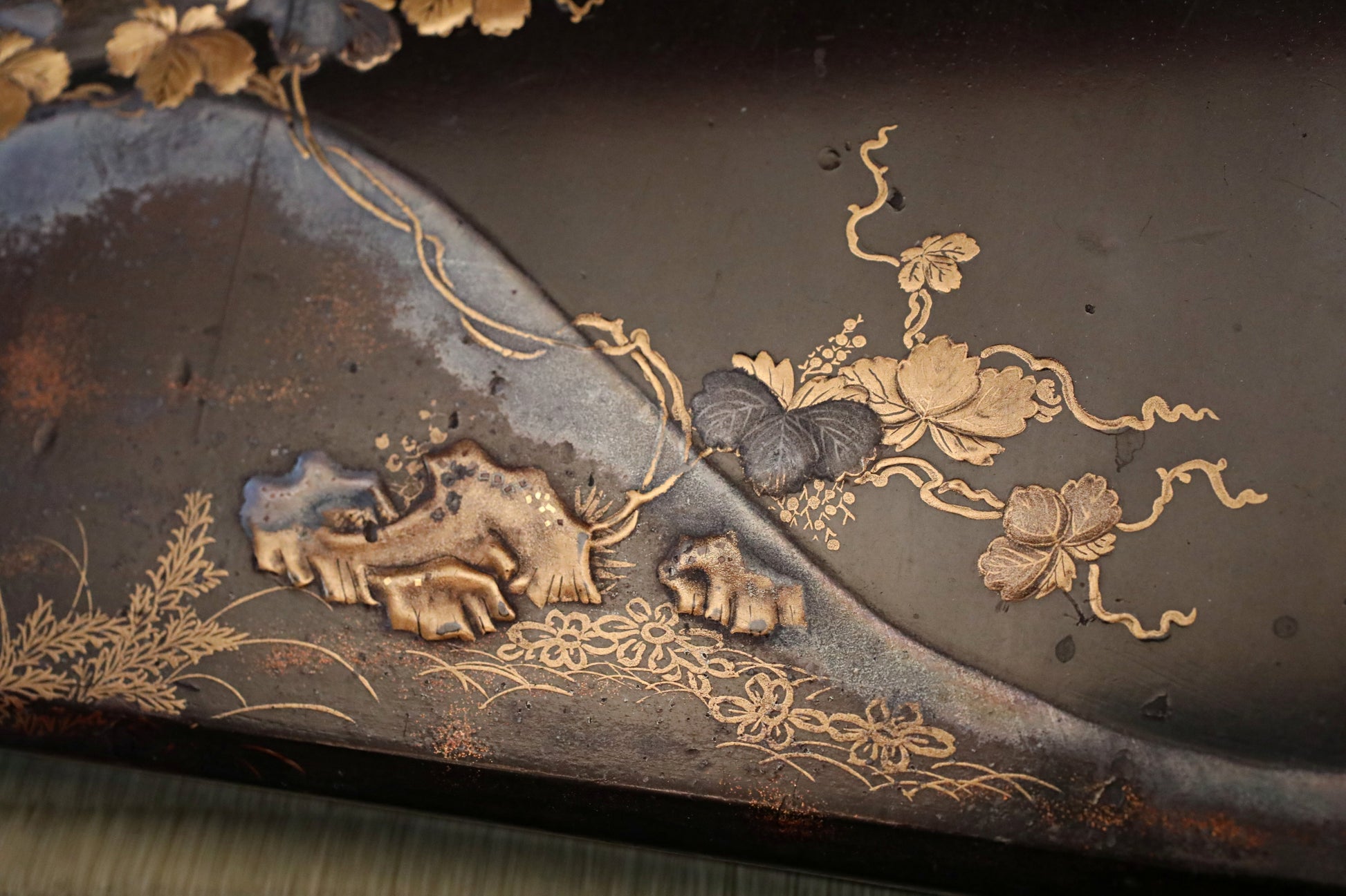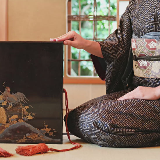 This box is called a sutra box, originally crafted to hold precious sutras and books. Made of wood and lacquer, its lid features elaborate and delicate paintings on both the inside and outside, created using the maki-e technique. The eye is drawn to the bird with its long tail. It is beautifully rendered in exquisite detail, slightly three-dimensional, using gold and silver. The bird perches atop a design featuring the triple tomoe crest, often used on drums at shrines and said to ward off evil spirits.