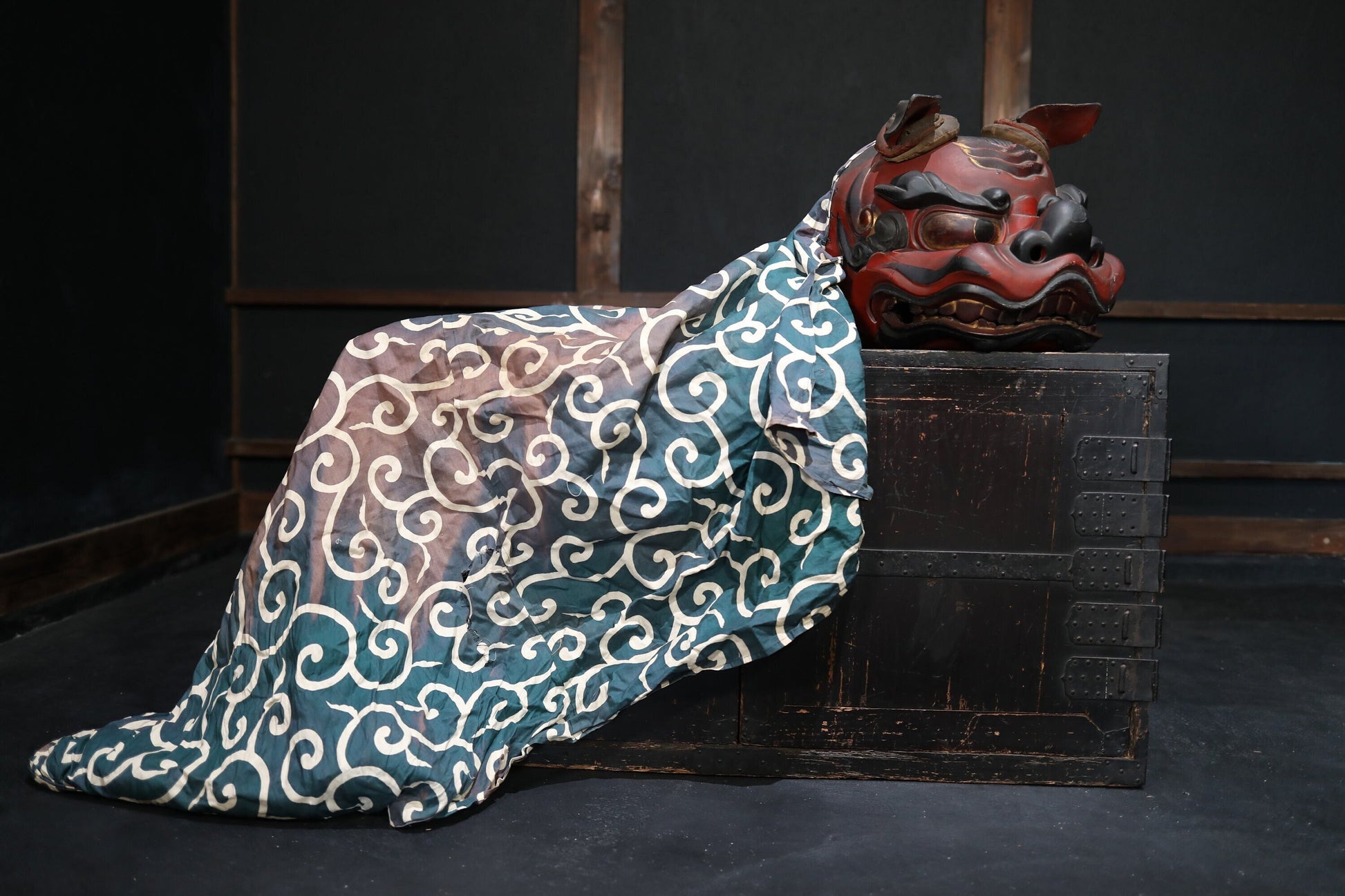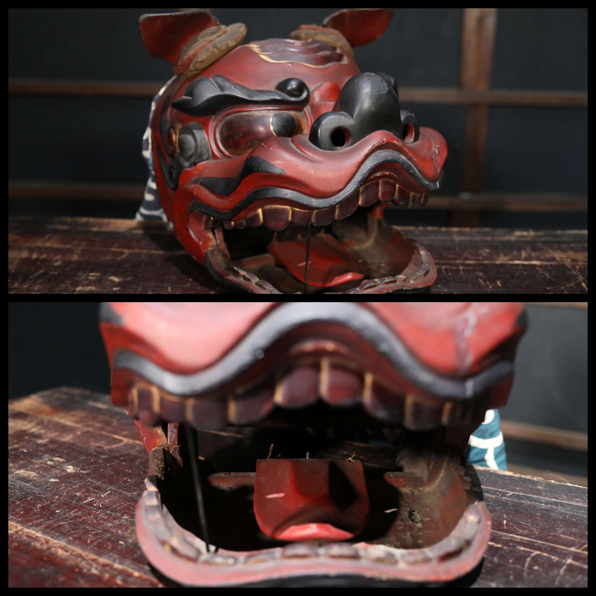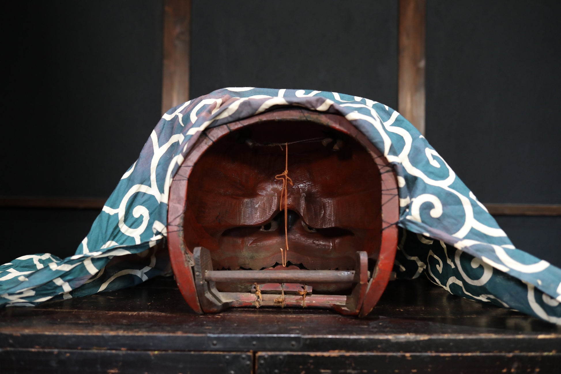 The lions have a powerful and dignified atmosphere. The atmosphere of aging is also wonderful. The wood is coated with lacquer. The mouth can be opened and closed and the ears can be moved. Furthermore, a large cloth is attached so that a person can actually enter inside like a lion dance. There are some signs of restoration, but overall it is in good condition.