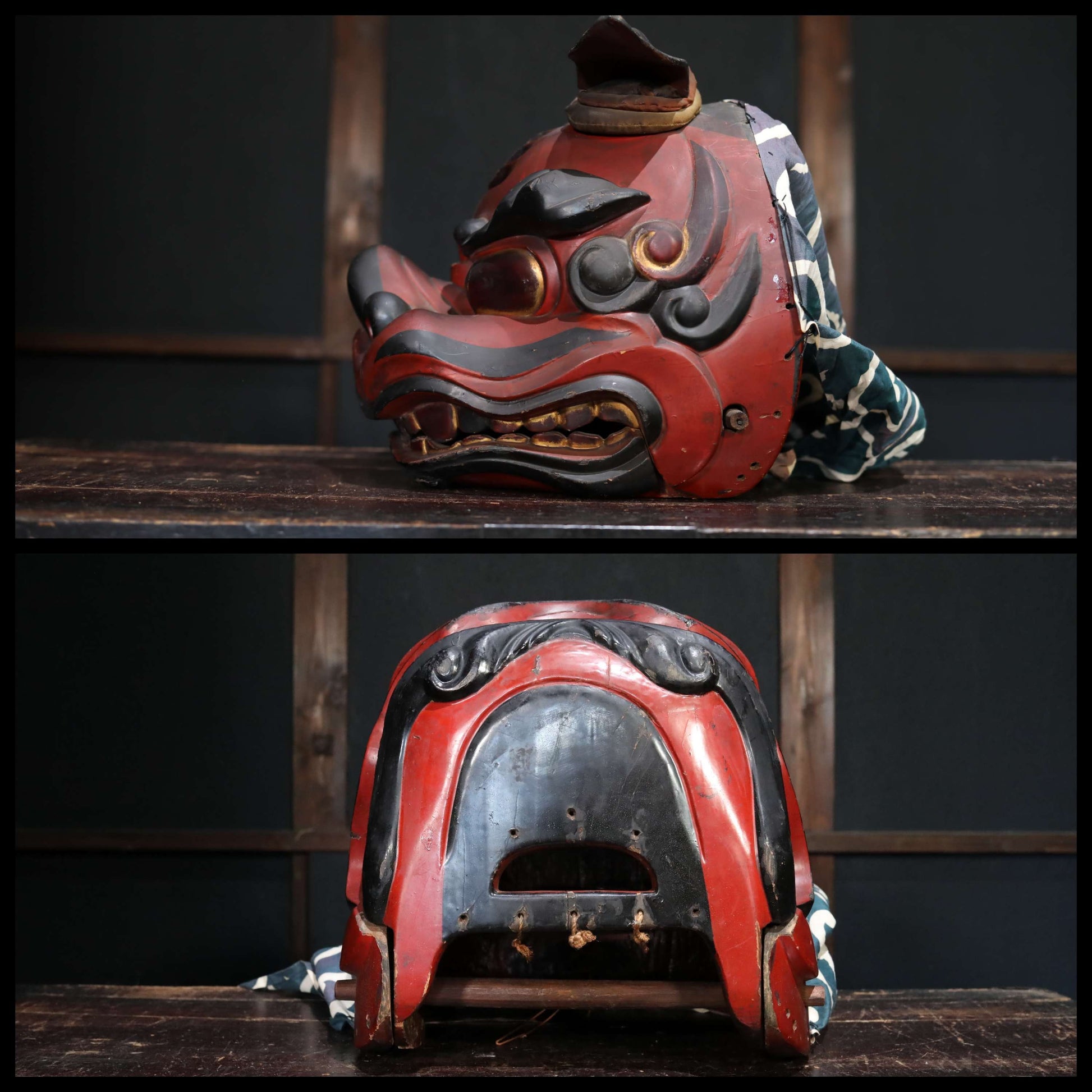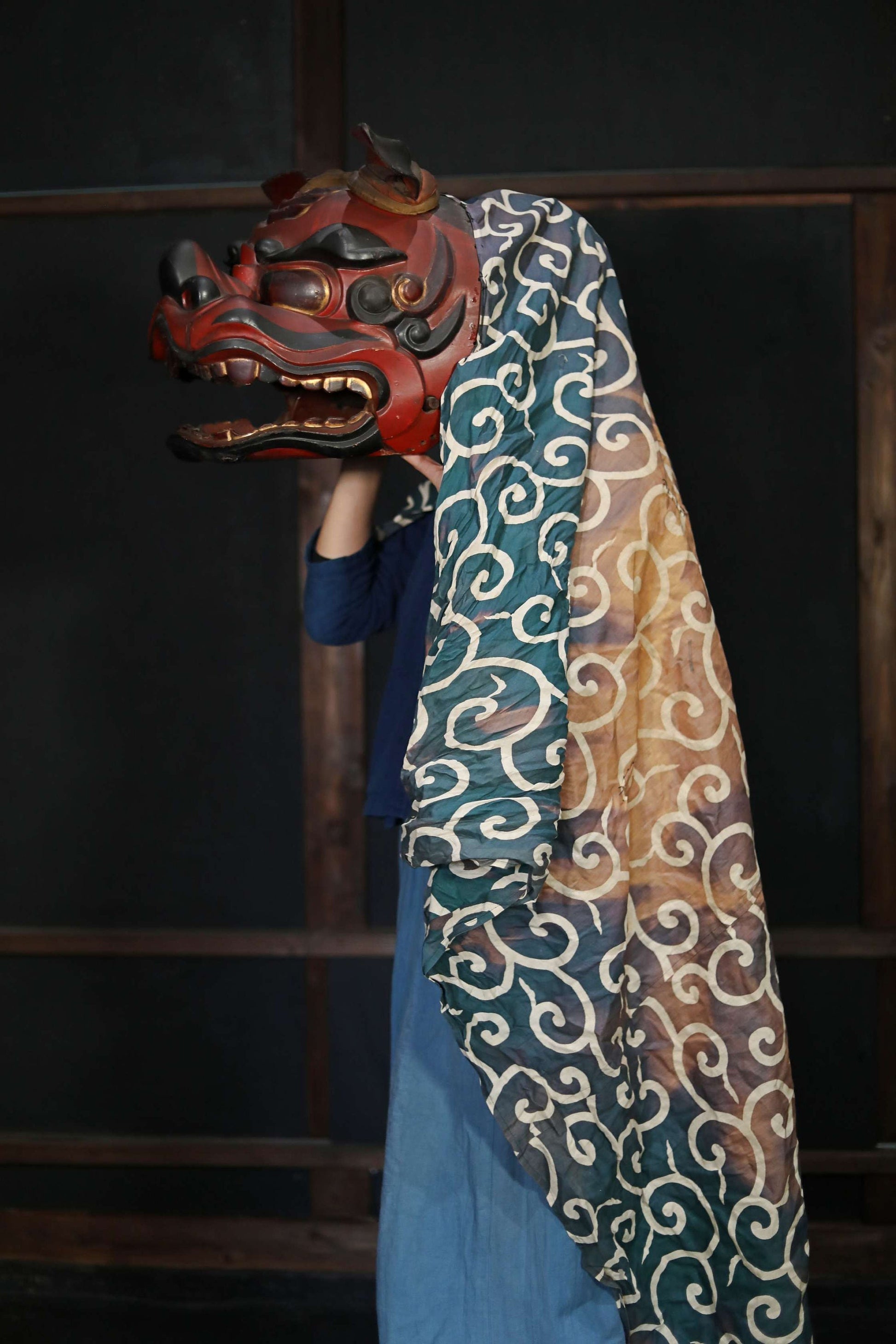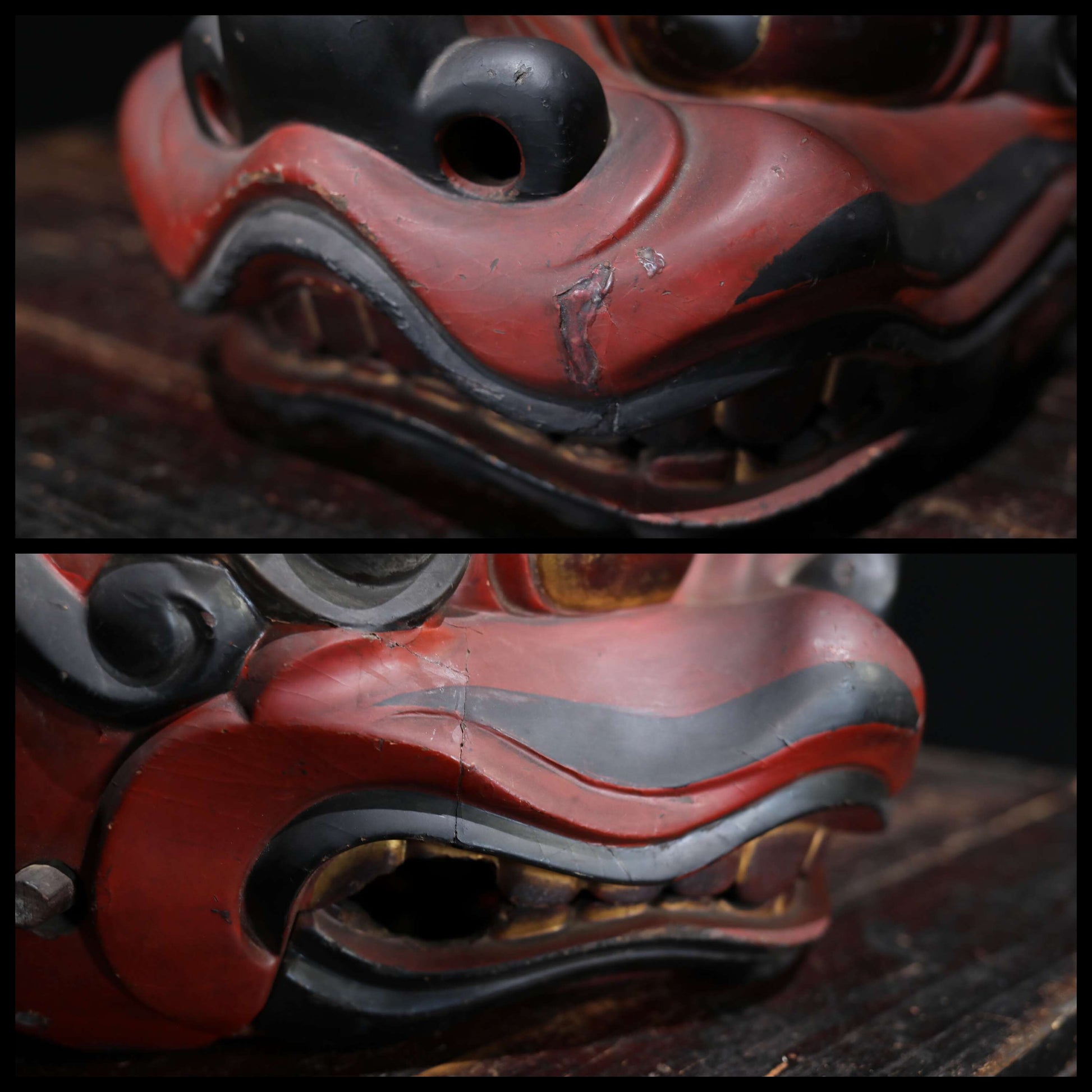The lions have a powerful and dignified atmosphere. The atmosphere of aging is also wonderful. The wood is coated with lacquer. The mouth can be opened and closed and the ears can be moved. Furthermore, a large cloth is attached so that a person can actually enter inside like a lion dance. There are some signs of restoration, but overall it is in good condition.