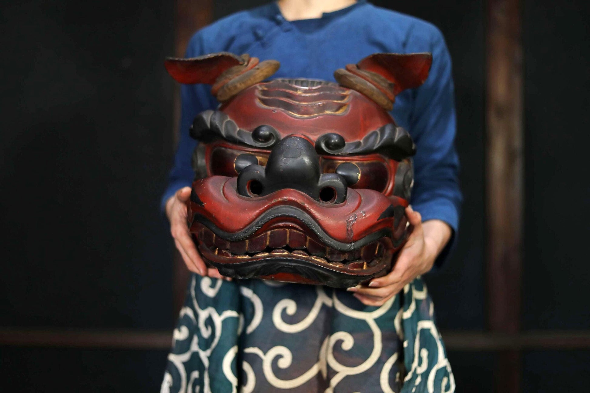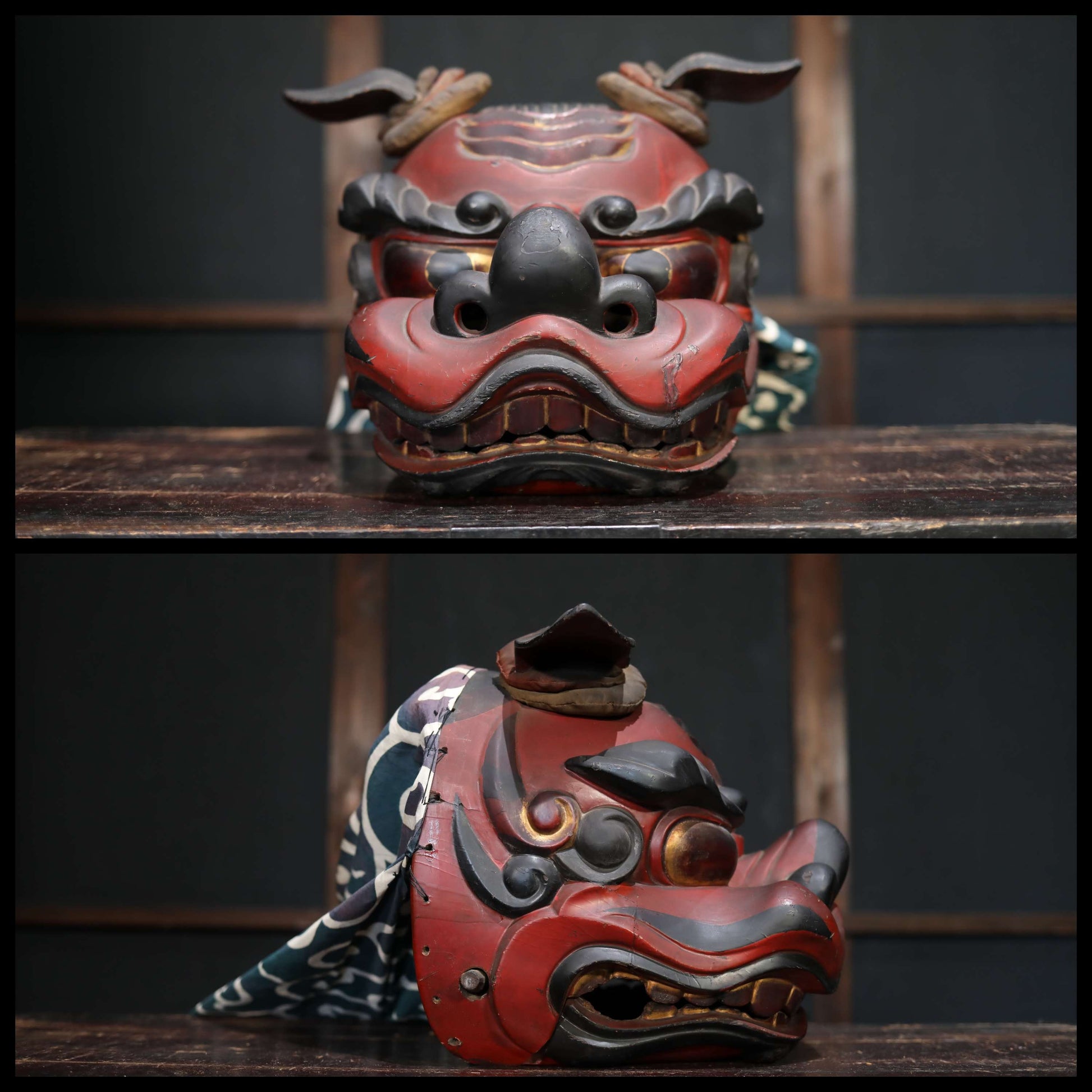 This is a wooden lion head used in shrine festivals. The festival known as the 獅子舞SHISHI-MAI lion dance is one of the traditional performing arts found in East and Southeast Asia, where lions dance to the accompaniment of festival music. In Japan, lion dances spread rapidly from the Muromachi period (1333-1573) to the early Edo period (1603-1868), and lions danced through the streets to ward off evil spirits.