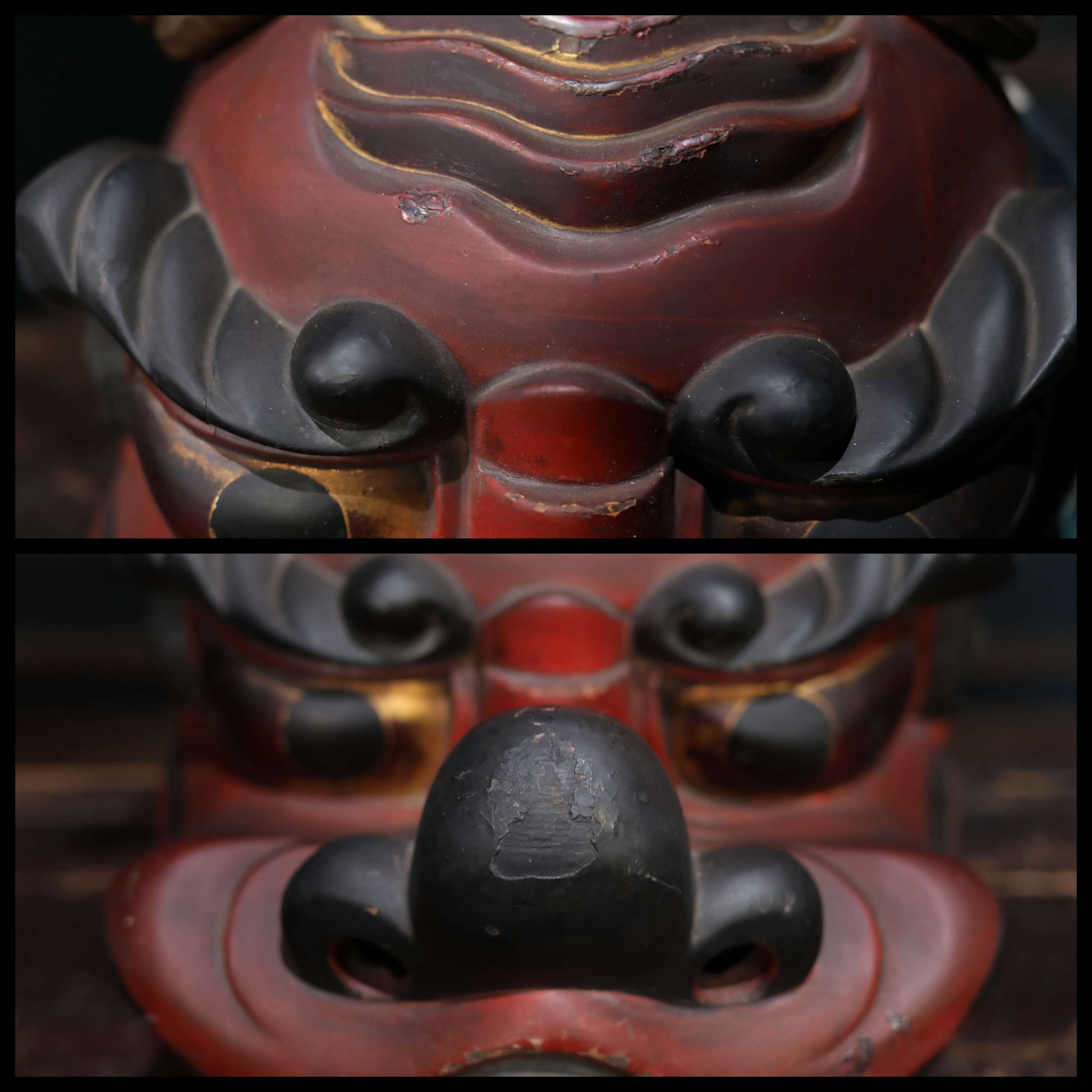Japanese antique 1800s Shishi BIG wood mask with large cloth hand carving lacquer lion's head Festival sculptures H12.2×13.6in/H31×34.5cm