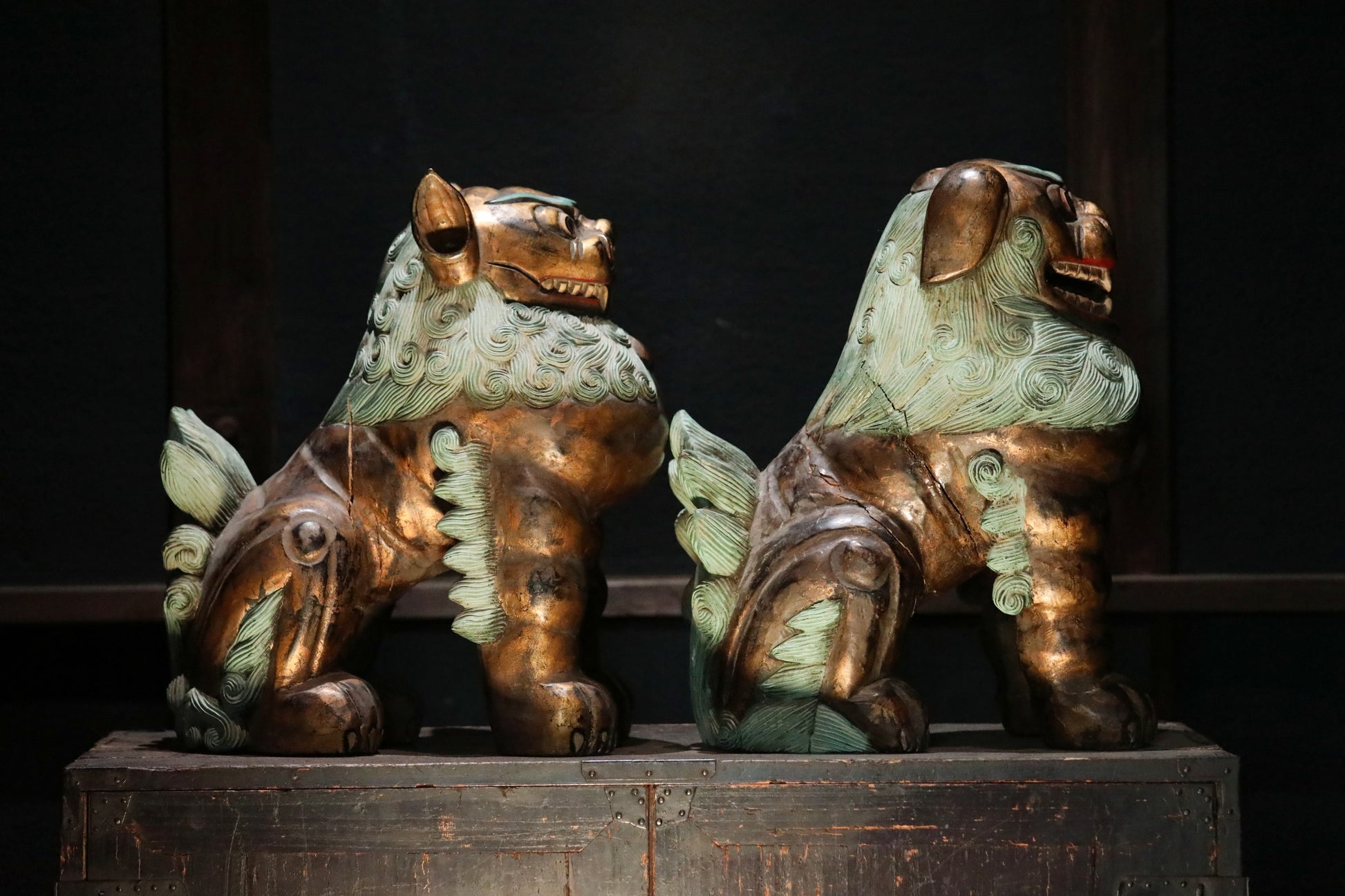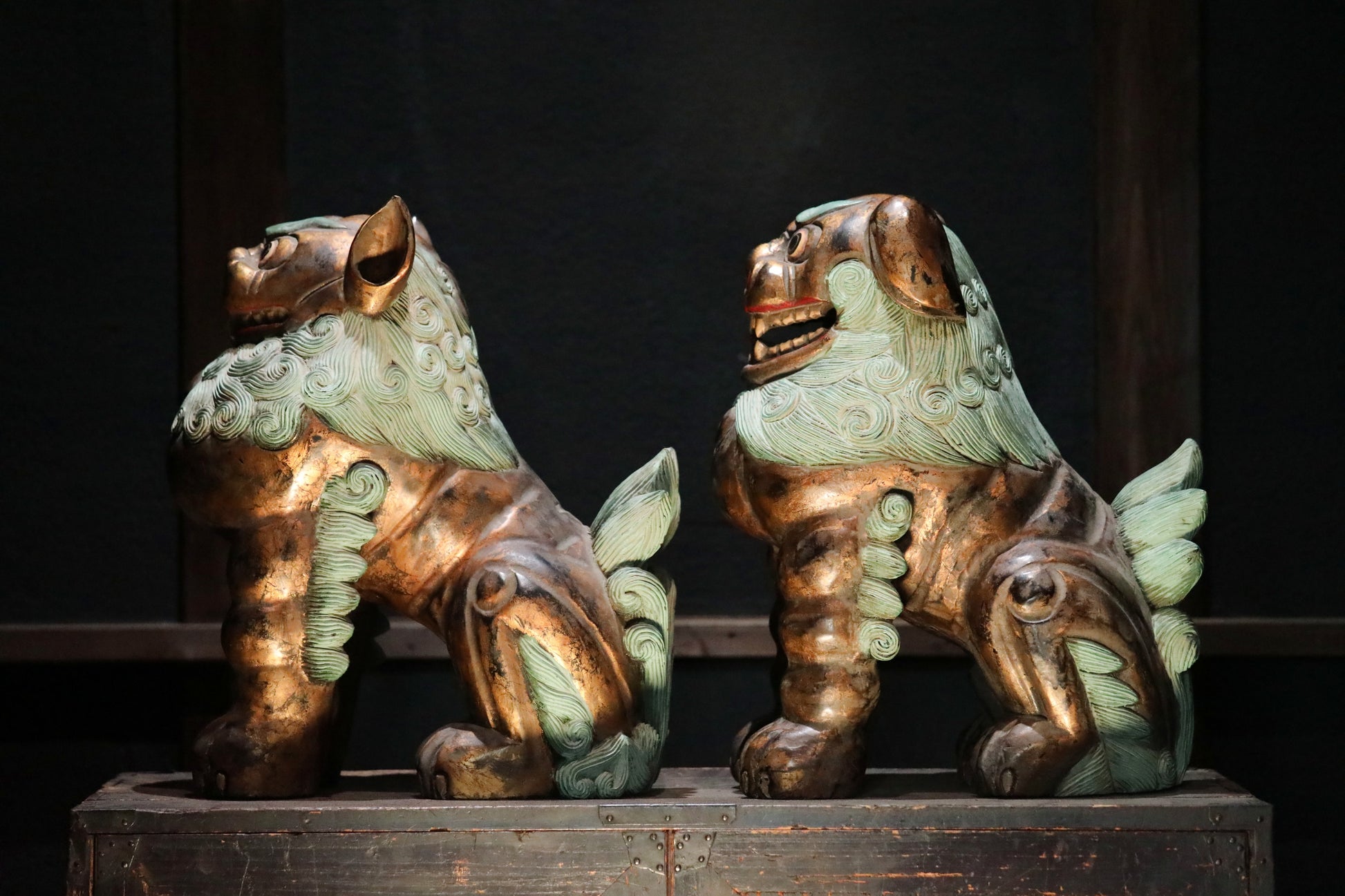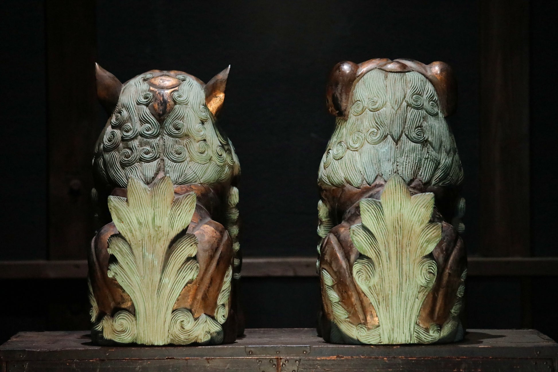 This is a pair of old wooden lion SHISHI獅子 sculptures. They are very large and impressive. Their unique and adorable expressions are also charming. They were originally enshrined in a temple as guardian deities on the altar.
