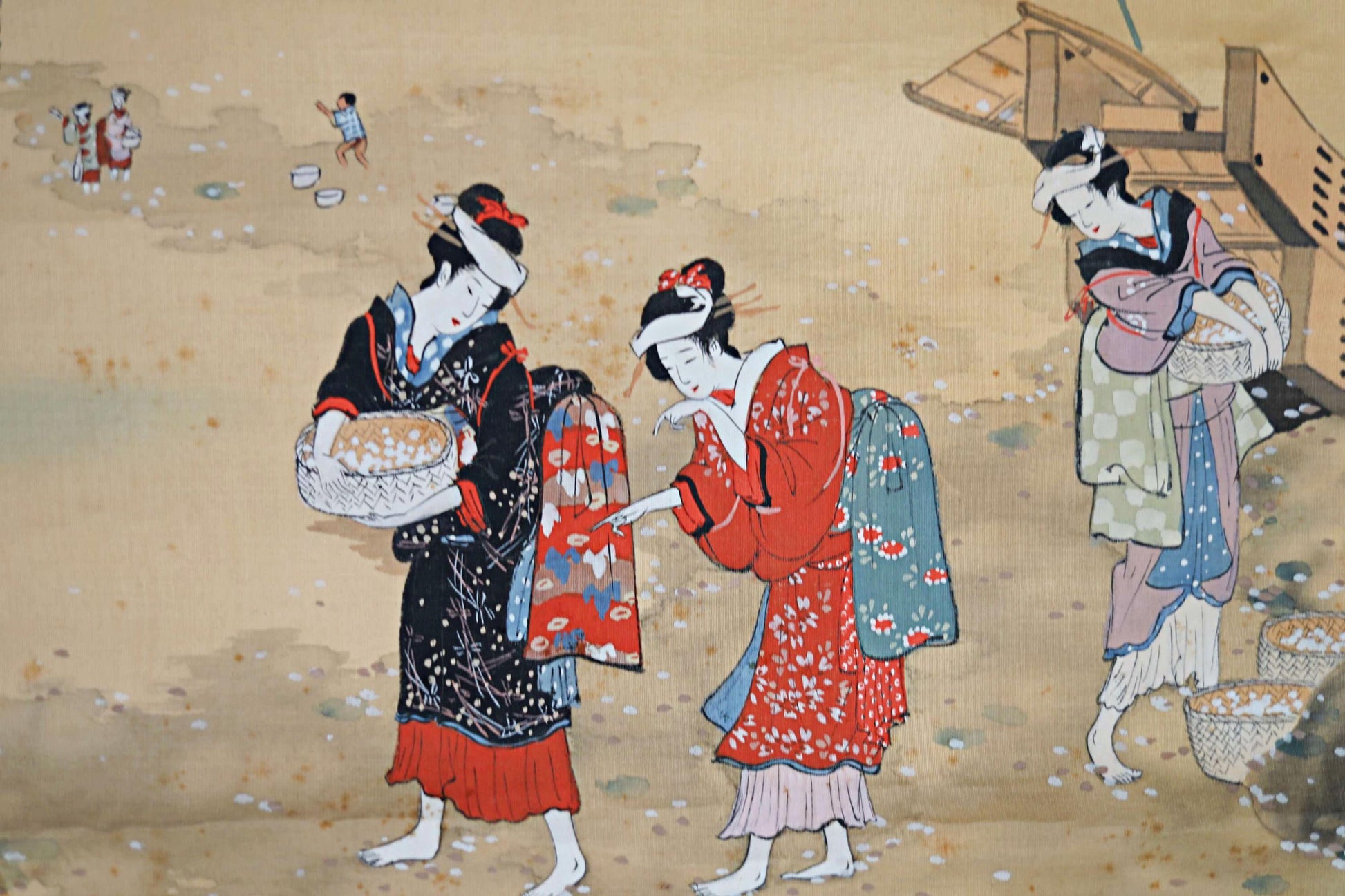 Mothers gather at the seaside for tidal flats. It is one of the annual summer events in Japan, and this scene shows them gathering shellfish in the sand in the shallows.