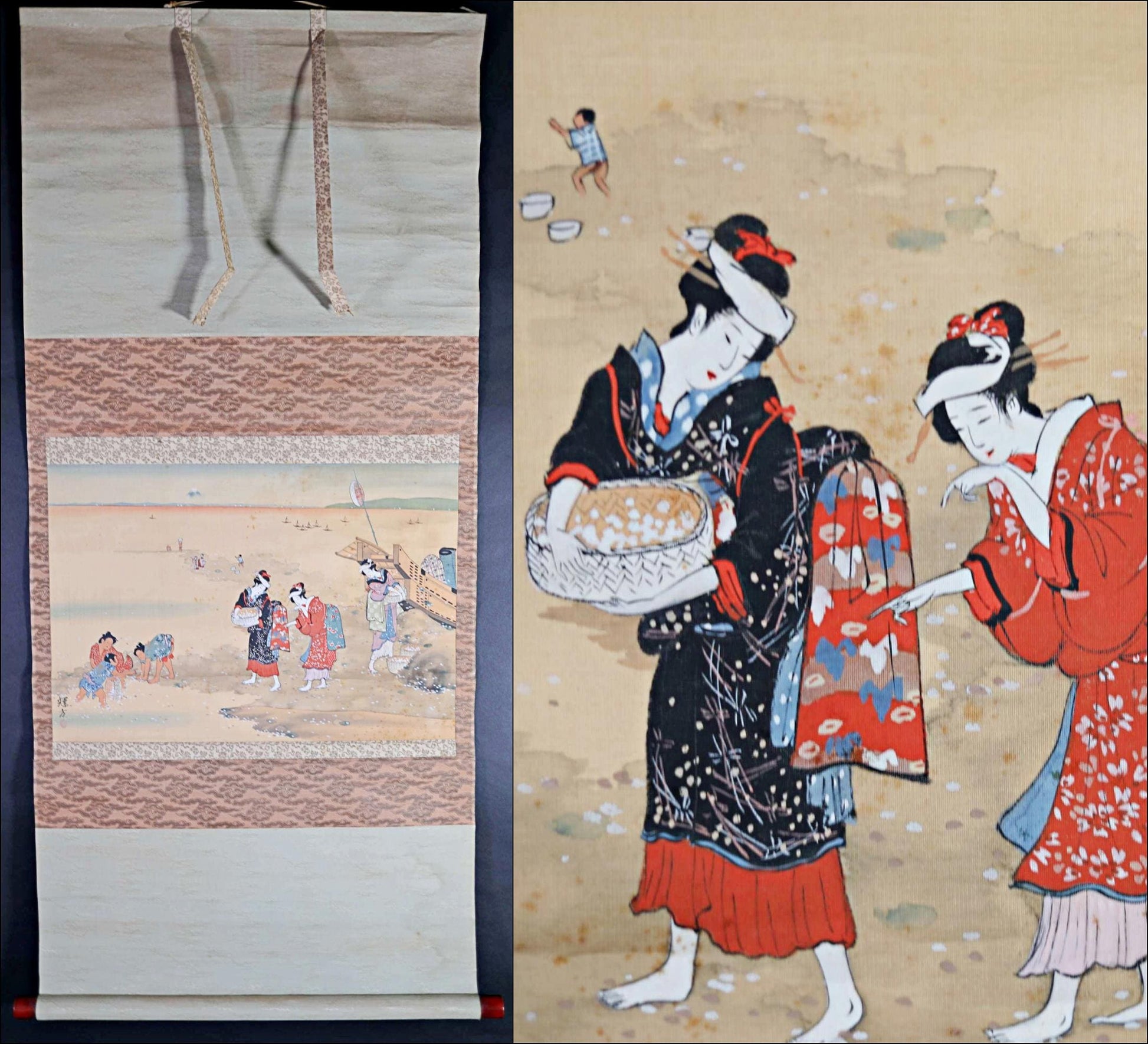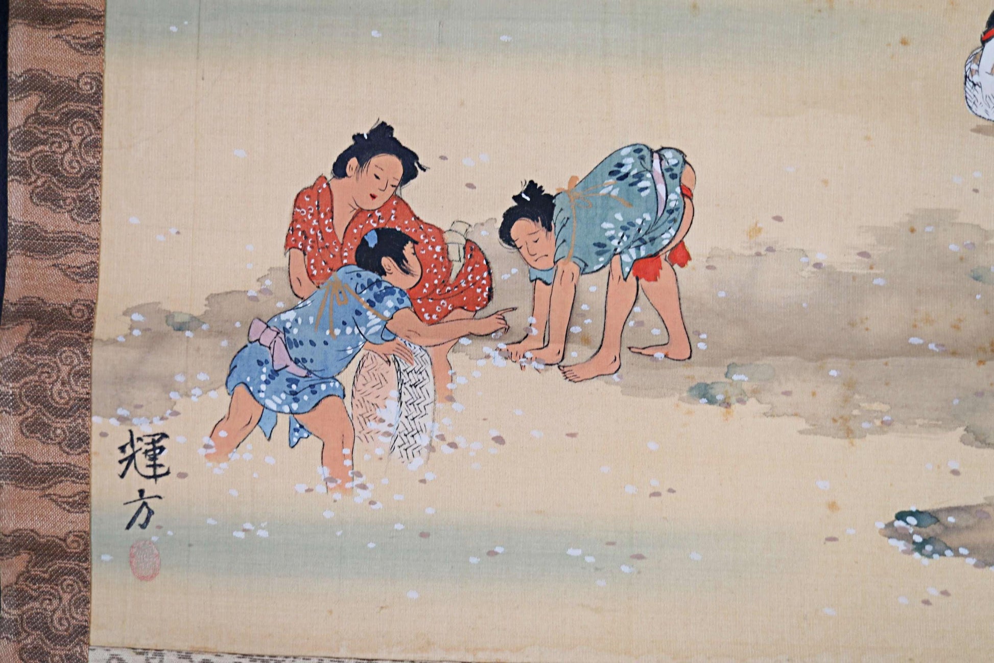 Japanese antique 1900s 輝方 sign brush watercolor hand painting scroll Mothers and Children, KAKEJIKU H47.2in/H120cm