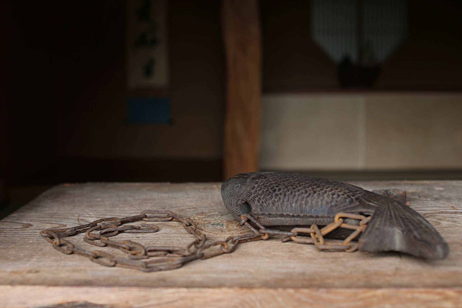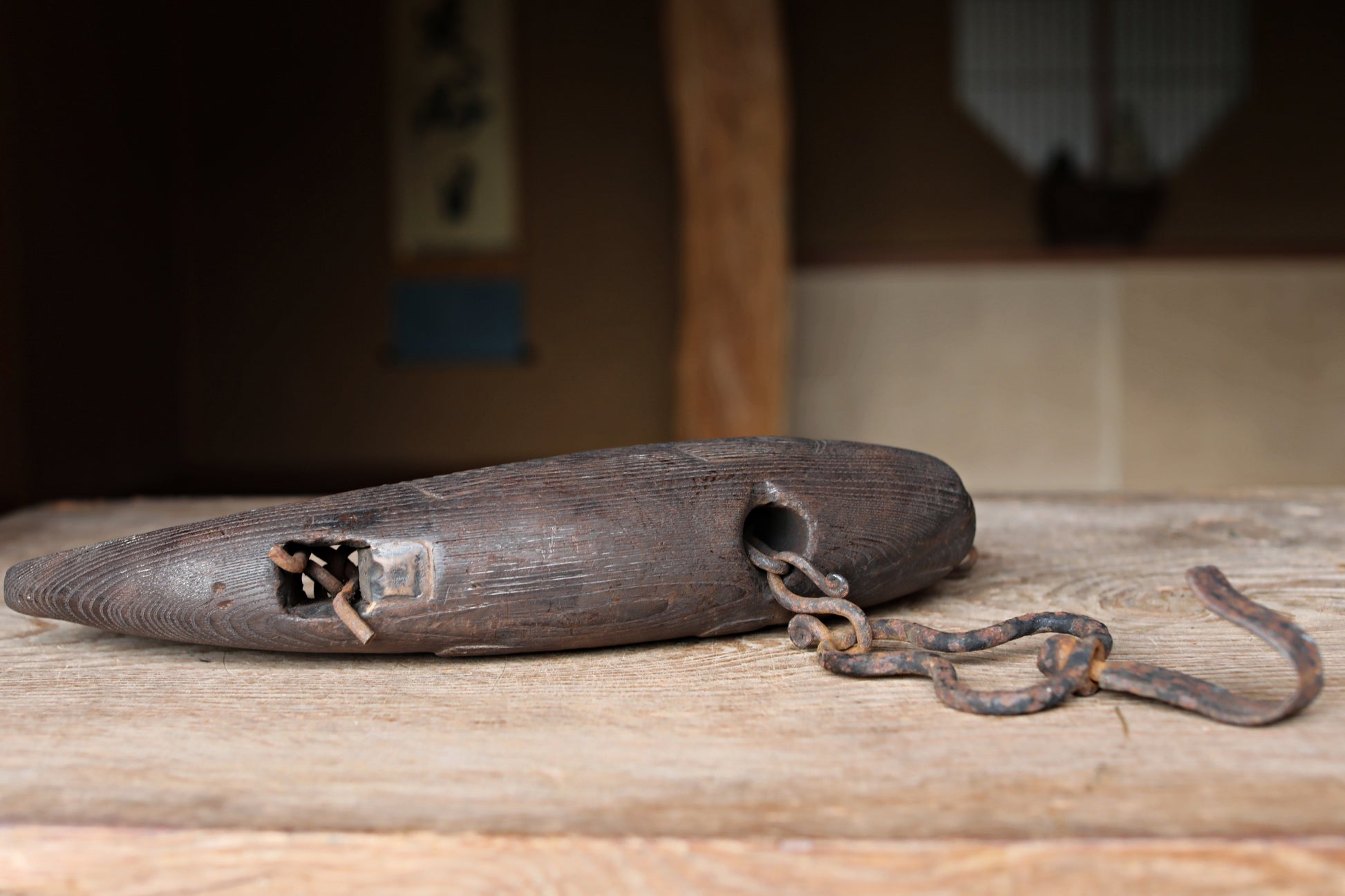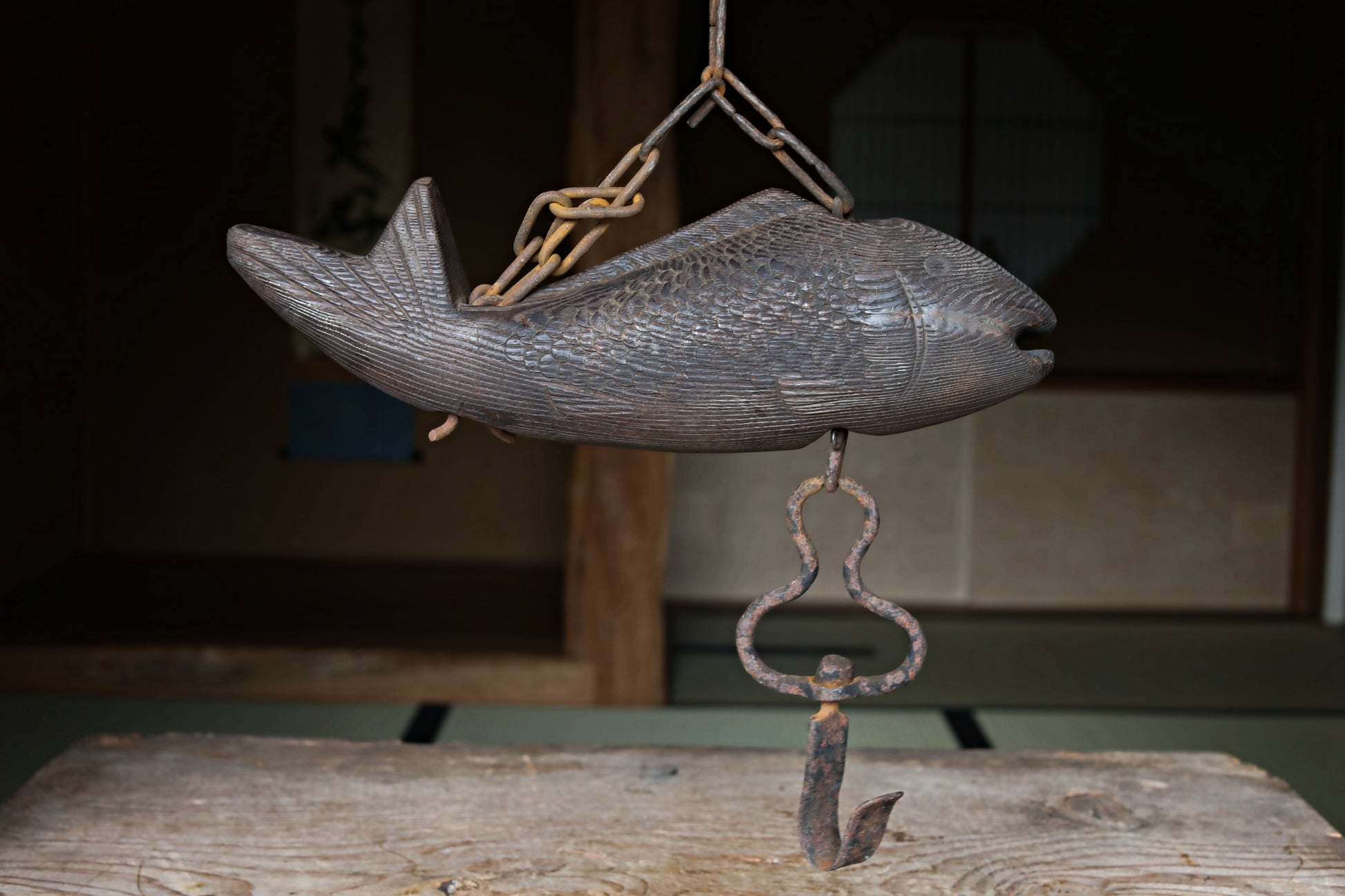 These wooden hooks and carved wooden carp decorations were used in farmhouse fireplaces during the Meiji and Taisho periods. They are called “自在 JIZAI.” Even though they are the same type of fish carving, these are very old and have a wonderful aged look. The chains are also handmade, making them valuable items.