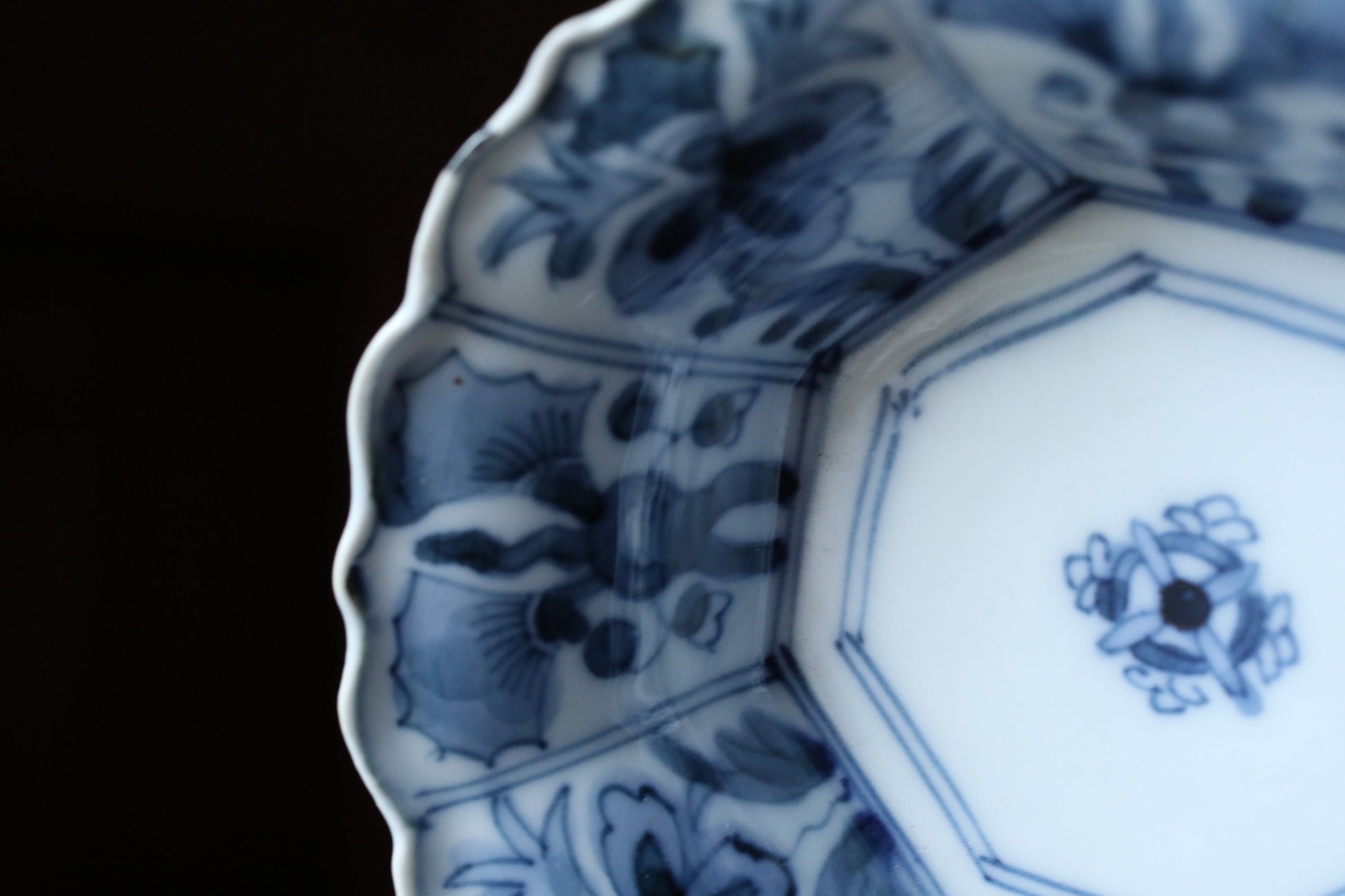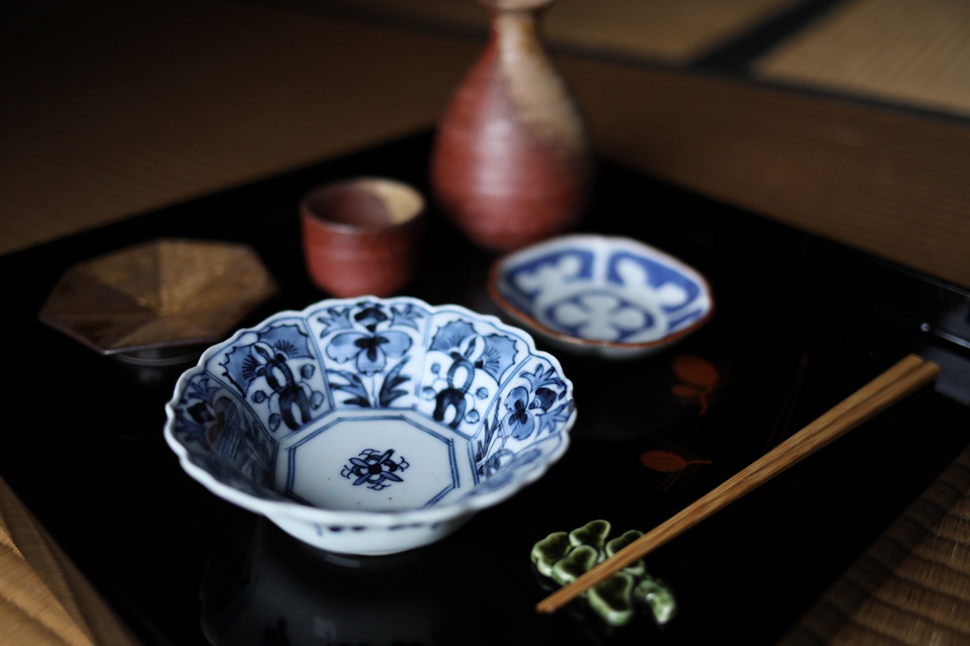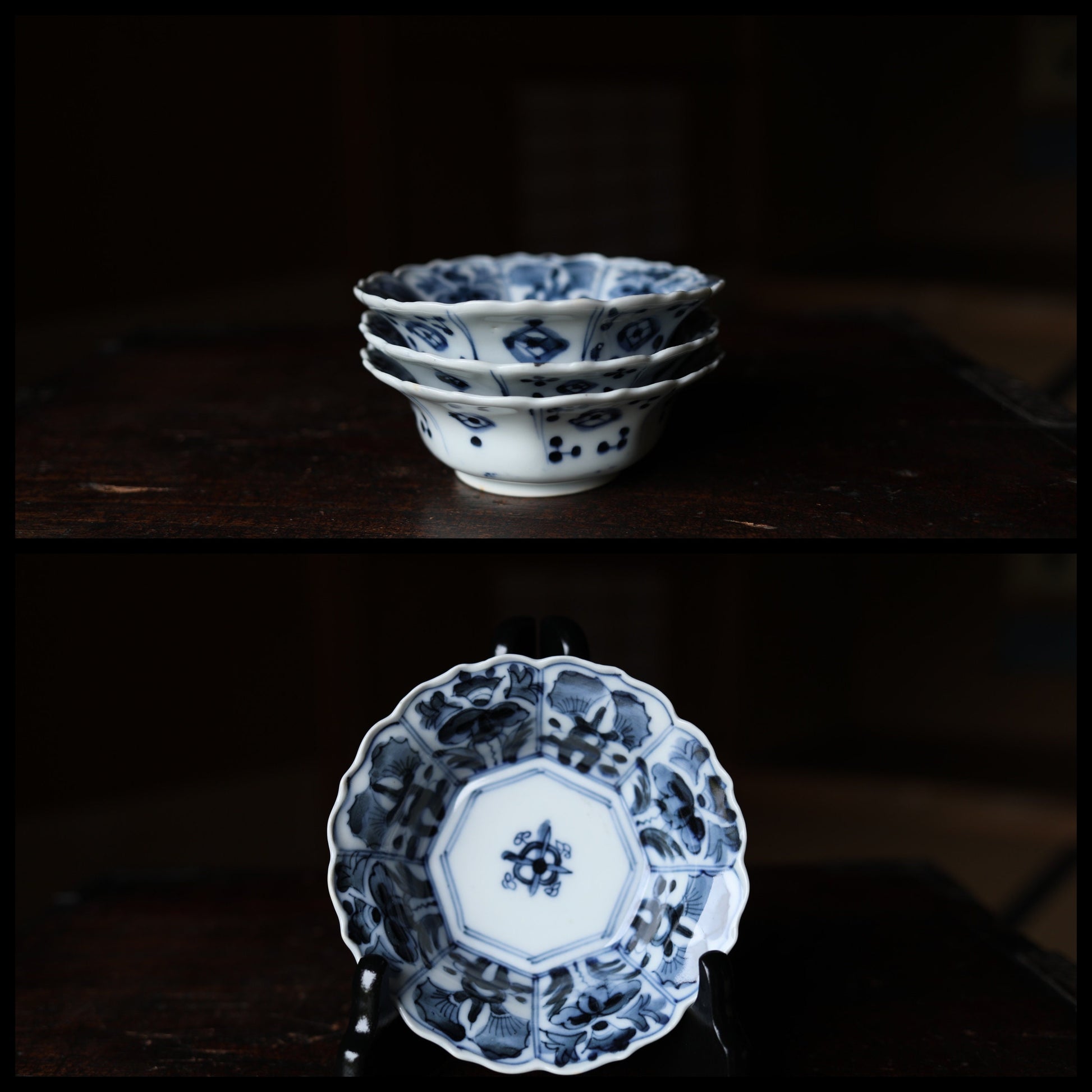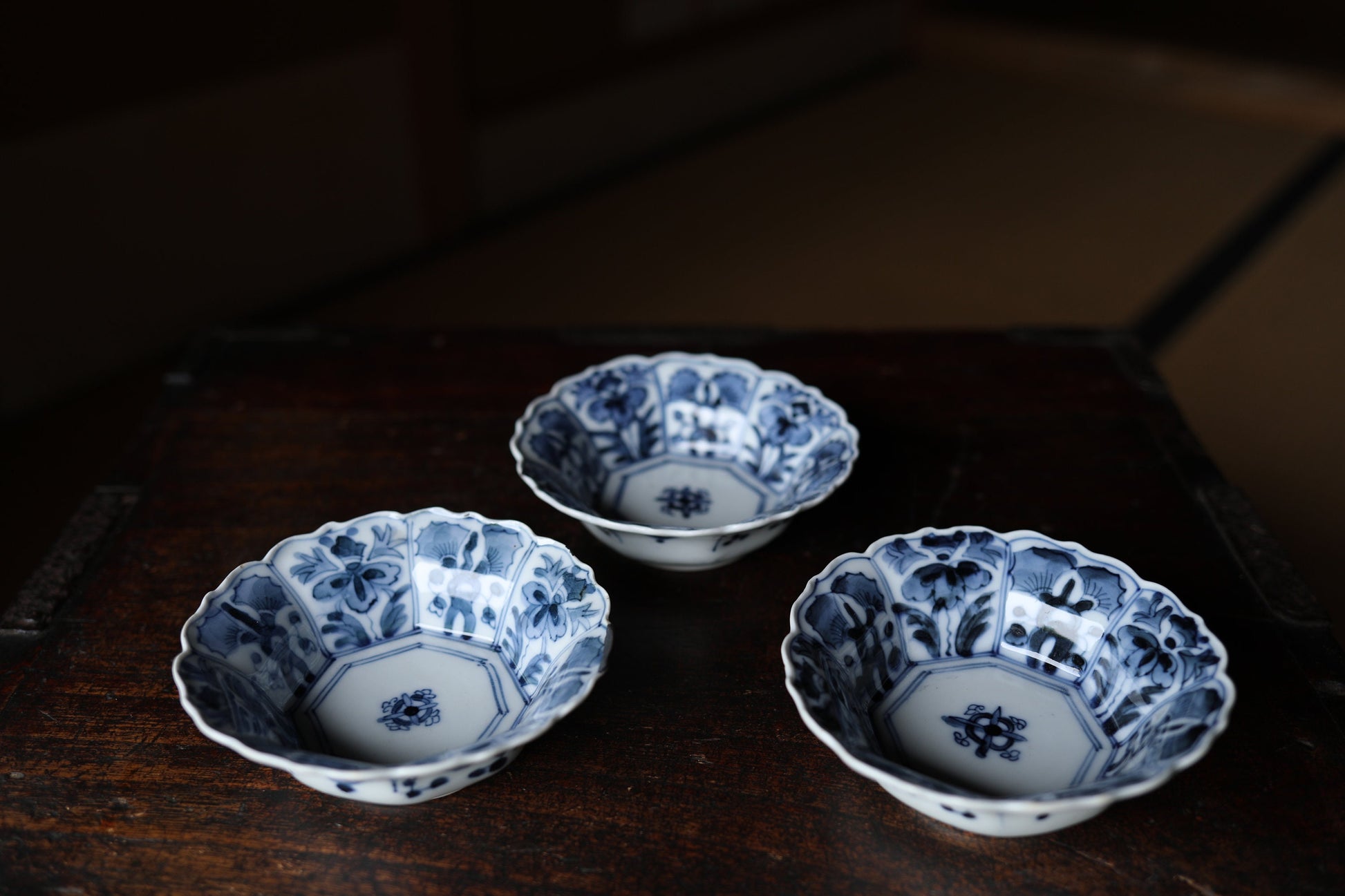 This pottery called 伊万里 Imari was made during the Meiji period. All are hand-painted, with plant and flower motifs on the back and front.