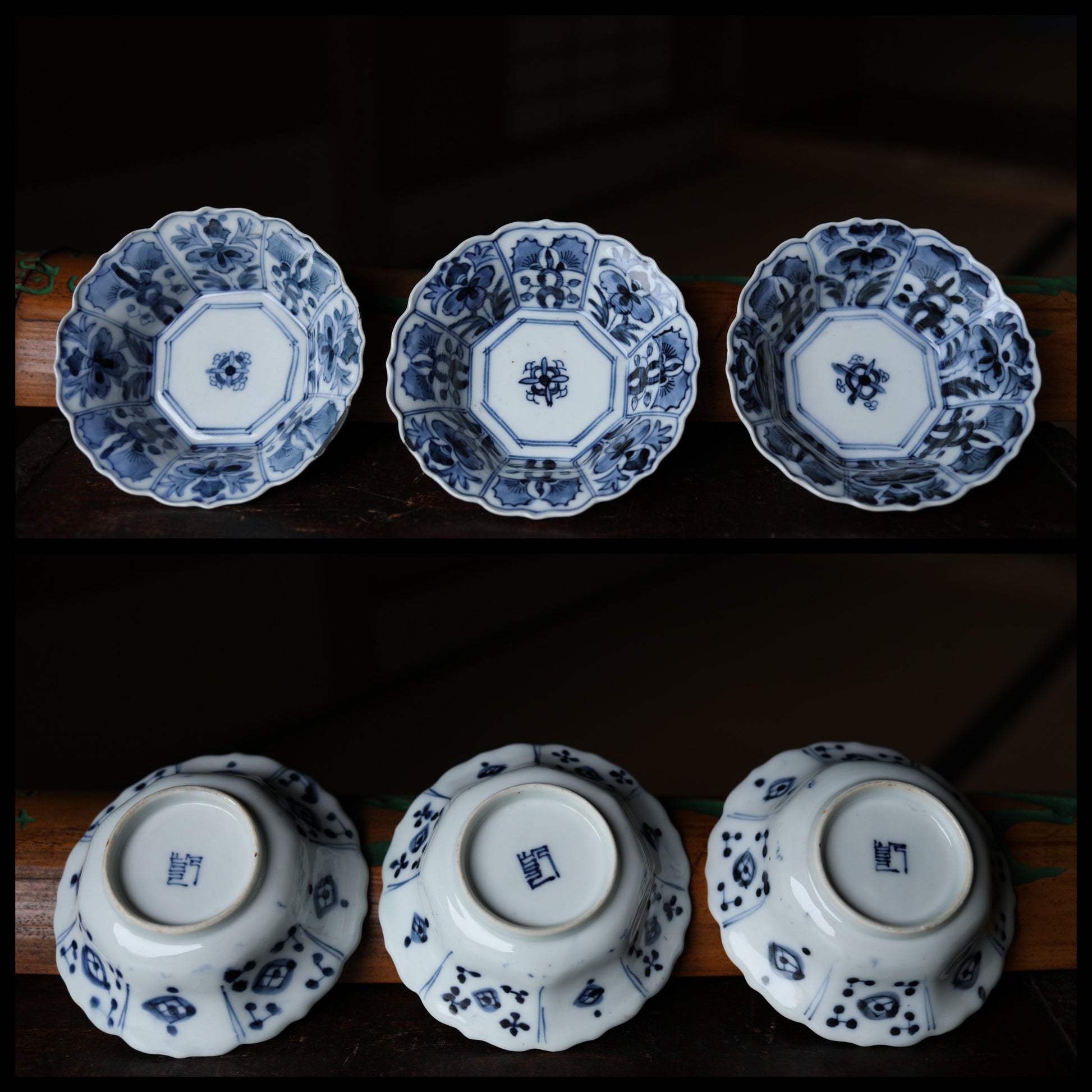 Japanese antique 1910s IMARI set of three 3 bowls porcelain kiln craft hand paint Indigo Blue White plate vessel Sometsuke silver repaired